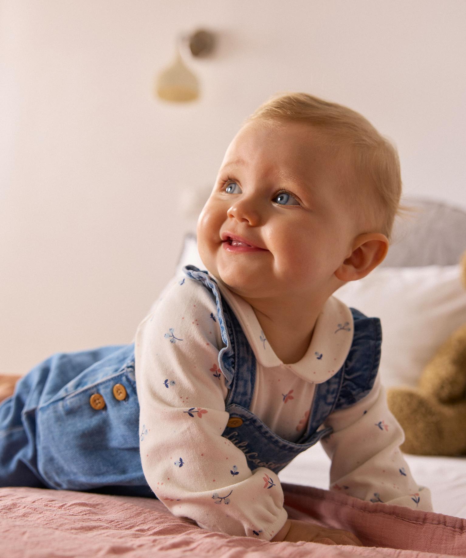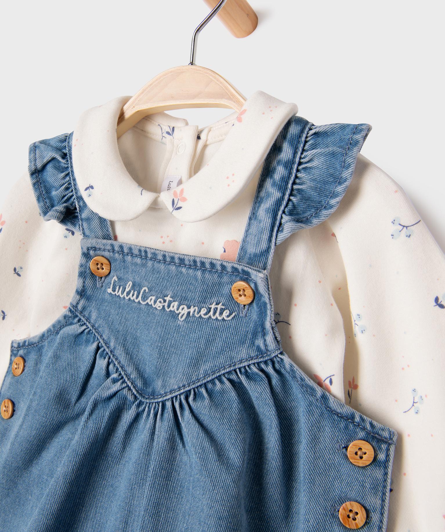 Craquez pour cet ensemble 2 pièces bébé fille signé LuluCastagnette, plein de charme et de praticité. Il se compose d’une salopette en jean adorable, avec entrejambe pressionné, chevilles élastiquées, bretelles volantées réglables, plastron froncé et brodé “LuluCastagnette”, ainsi que des boutons sur les hanches pour un habillage facile. Le body manches longues élastiquées à col claudine complète joliment la tenue avec son imprimé fleuri délicat et ses pressions au dos et à l’entrejambe. Un look tendre et confortable au quotidien.