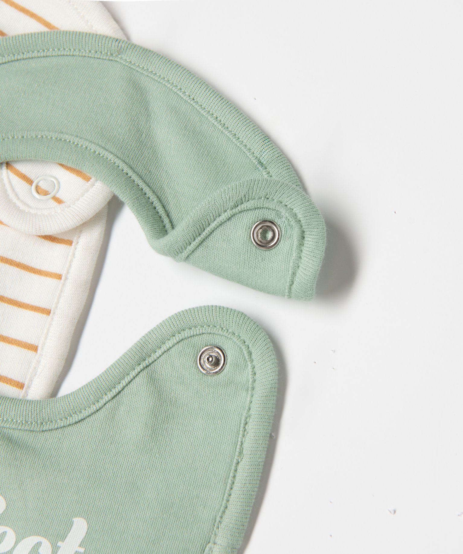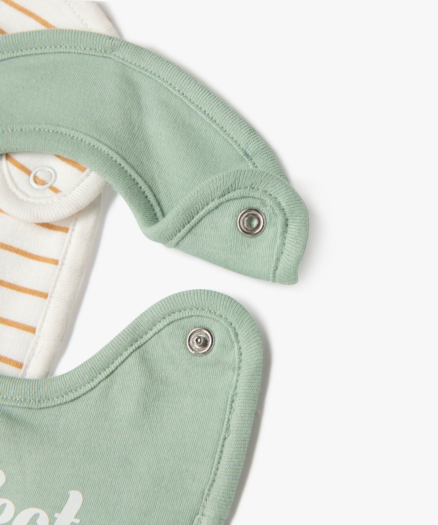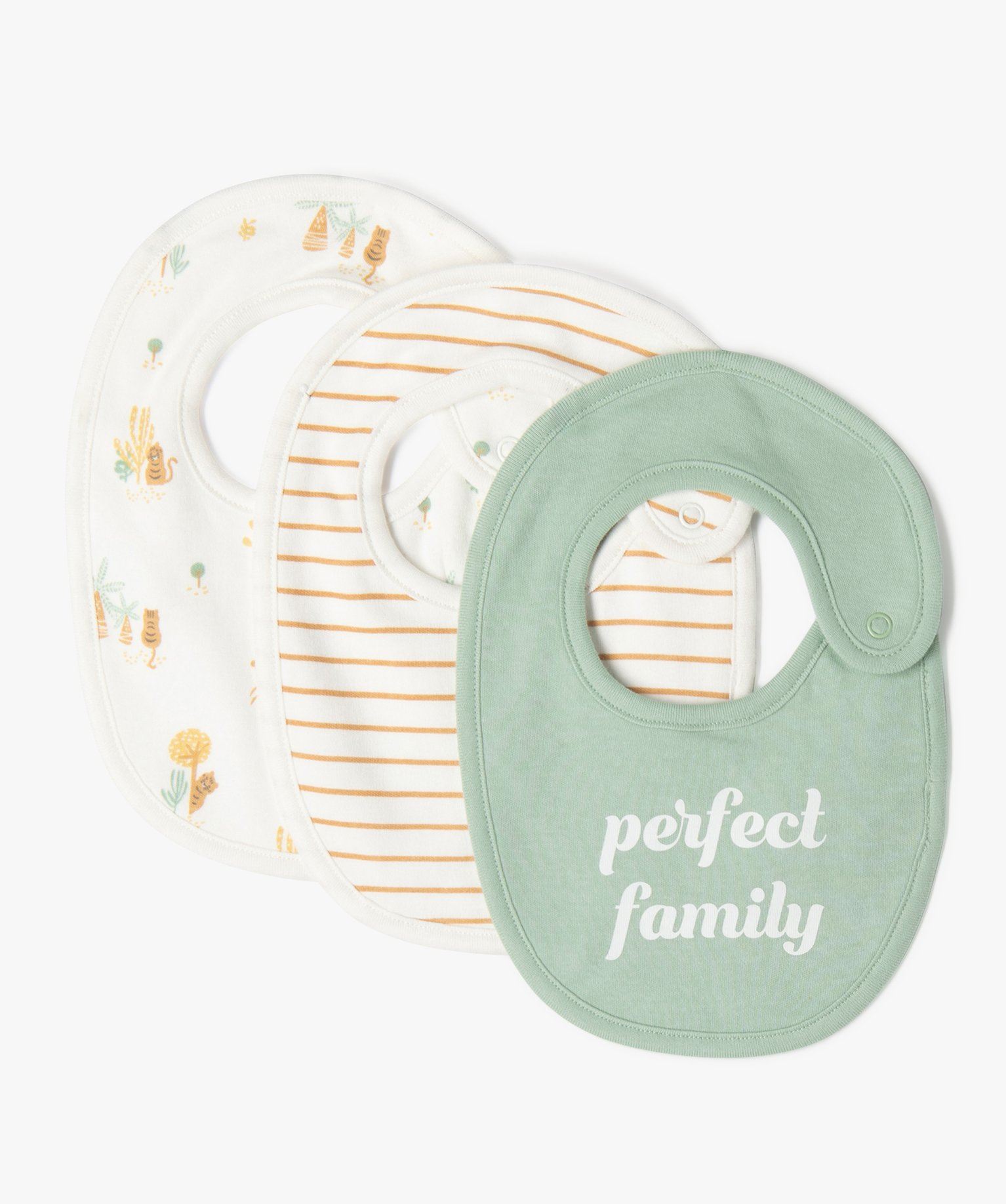 Fabriqués en jersey de coton doux, ces petits bavoirs pour bébé sont idéals dès la naissance. Pratiques, ils se ferment facilement grâce au bouton-pression sur le côté. Vendus par 3, les bavoirs se déclinent dans des couleurs et motifs différents pour varier à chaque repas. Finition biais.