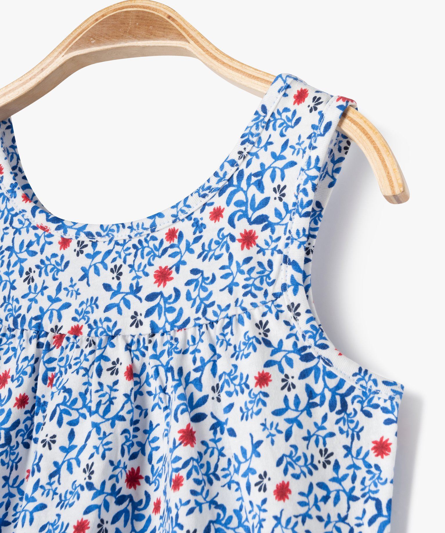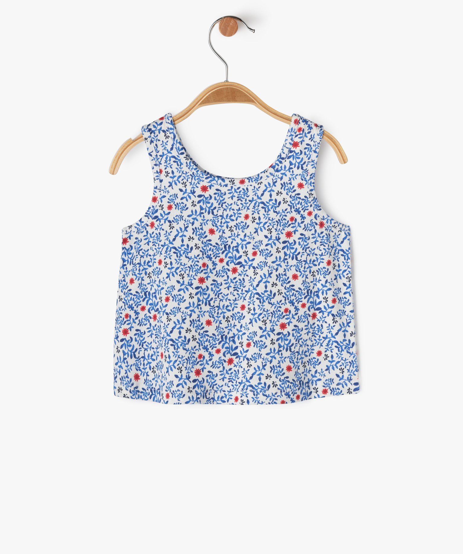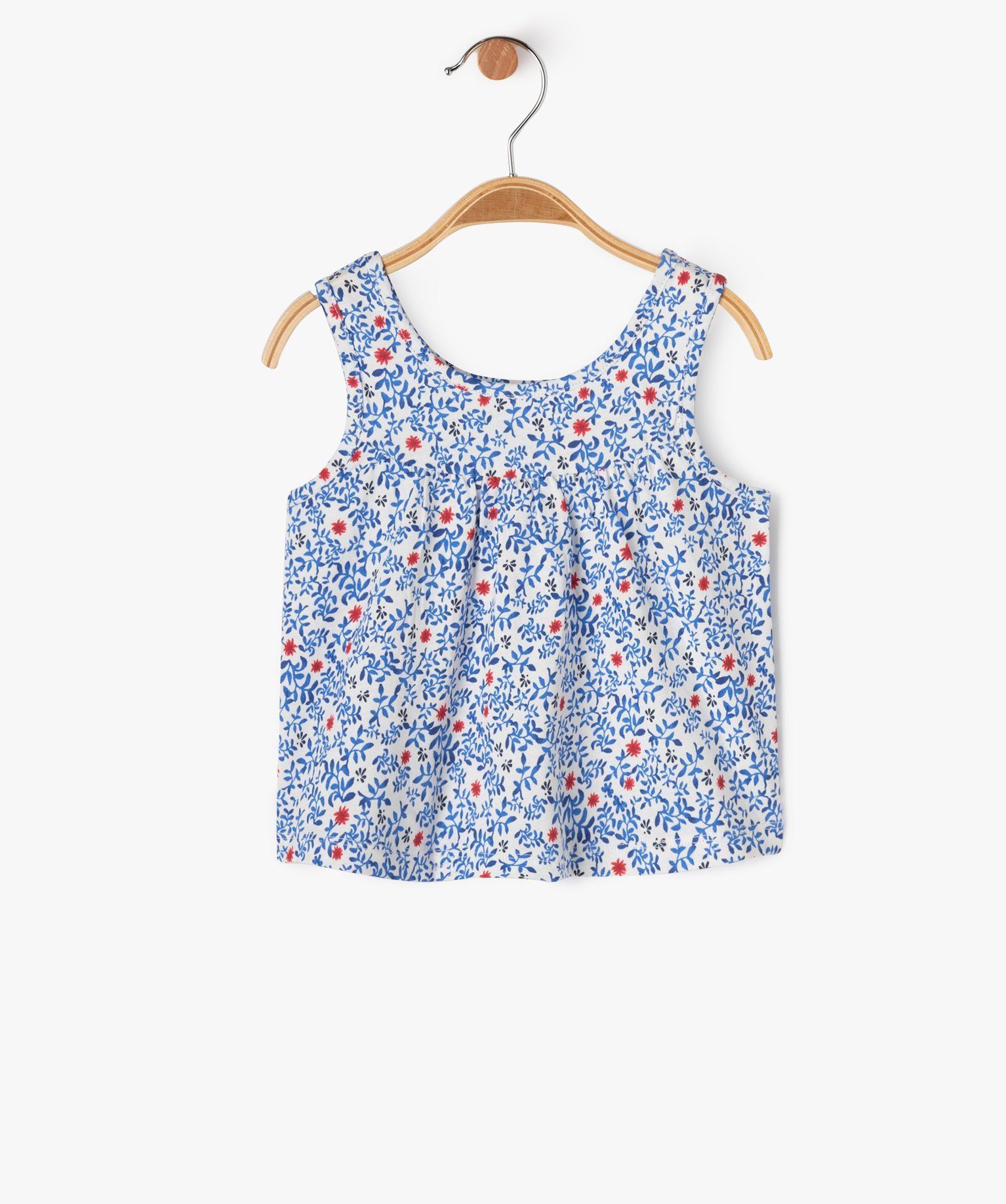 Offrez à votre petite fille un look girly et romantique grâce à ce joli débardeur fleuri. Un top en coton avec col rond et finitions biais sur le col et les emmanchures. Ce débardeur bébé fille est sublimé par de délicates fronces sur le haut du buste qui donnent de l’ampleur pour offrir un maximum de confort aux tout-petits. Il se porte avec le short assorti ou un pantalon en toile uni.