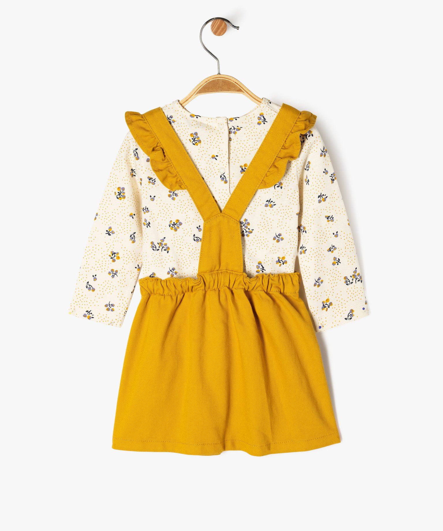 L'ensemble bébé fille prend des airs printaniers ! Avec sa jolie robe en denim fleuri aux bretelles volantées et son tee-shirt à manches longues, cet ensemble 2 pièces est idéal dès les premiers beaux jours. Coquet, l'ensemble est aussi pratique grâce aux 2 boutons-pression dans le dos qui facilitent l'enfilage du tee-shirt, ainsi que la taille élastiquée et les bretelles réglables sur 2 positions de la robe. Deux pièces à porter ensemble ou séparément.