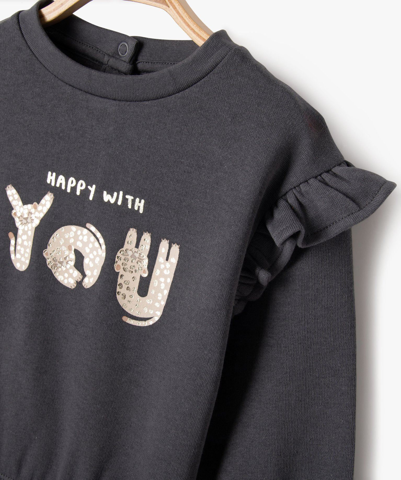 Un joli ensemble 2 pièces conçu pour offrir aux petites filles une allure élégante tout en bénéficiant d’un maximum de confort. Cet ensemble bébé fille se compose d’un sweat molletonné et d’un legging en maille côtelée avec finitions froncées en bas de jambe. Le sweat est agrémenté d’une inscription pailletée sur le buste, de petits volants sur les épaules et de finitions élastiques aux poignets et dans le bas. Il se ferme par boutons pression dans le haut du dos. Le legging possède une ceinture élastique facile à enfiler. Un ensemble élégant proposé à tout petit prix.