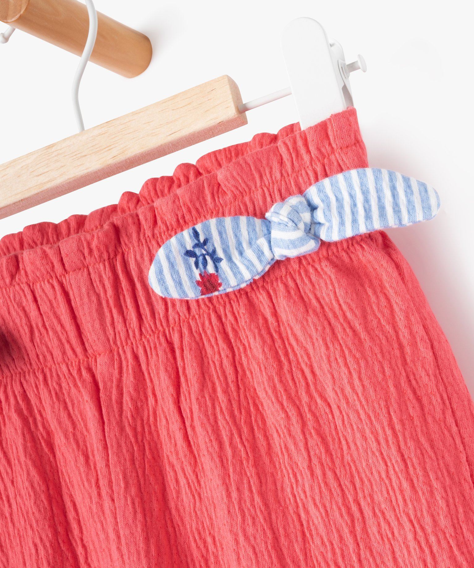 Au top du style sans compromis sur le confort pour ce pantalon bébé fille ! Un pantalon en maille extensible, au joli effet gaufré, monté sur une taille élastiquée avec de petits nœuds décoratifs rayés sur les hanches. Le pantalon présente une coupe carotte tendance et idéale pour rester libre de ses mouvements. Les jambes sont terminées par un revers cousus.