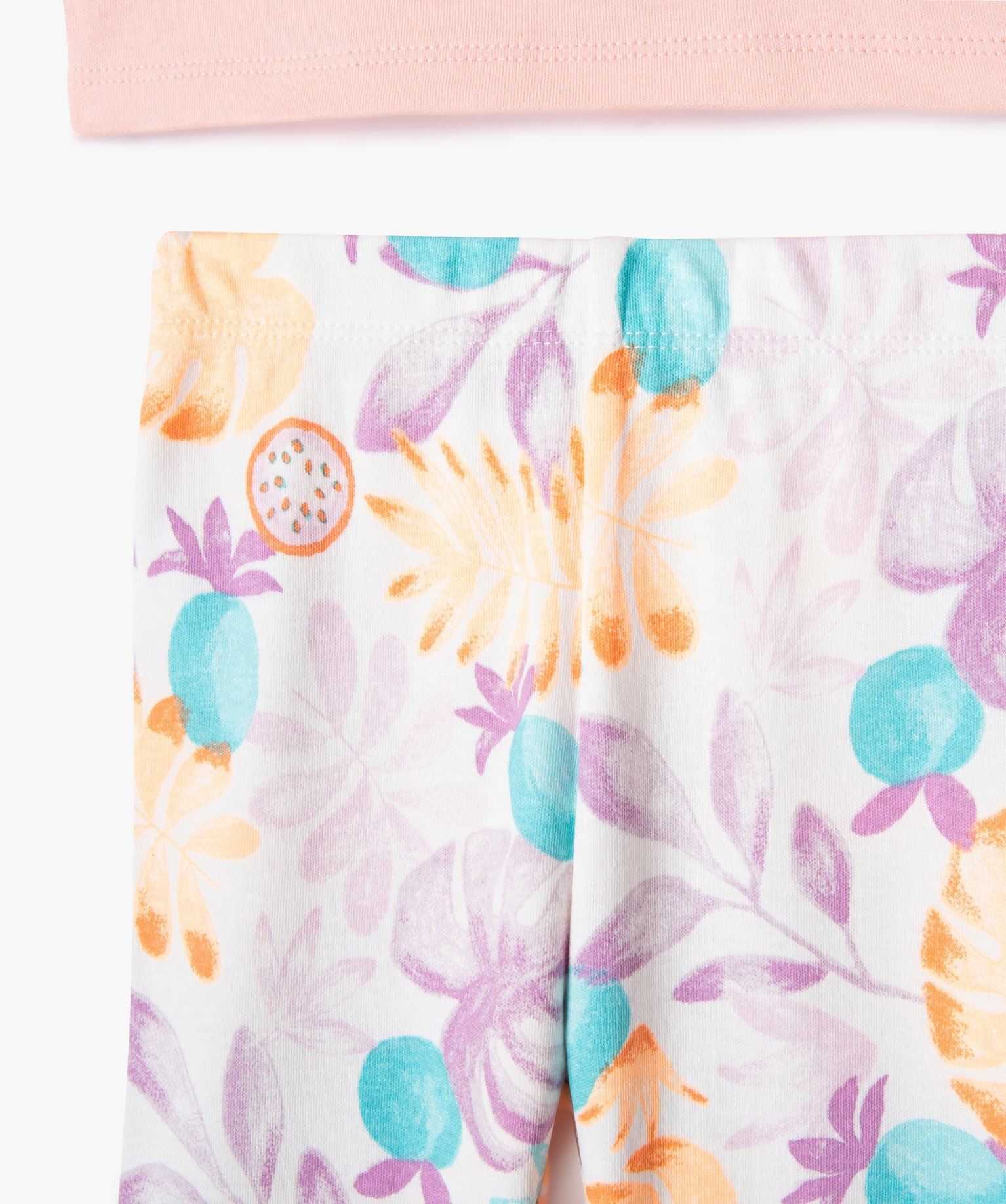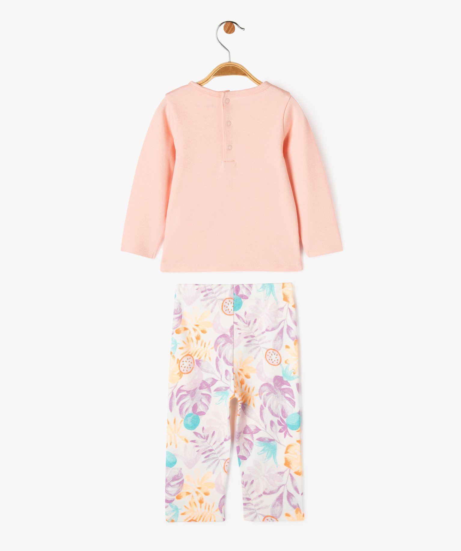 Vous n’allez pas résister au charme de ce pyjama bébé fille. Un pyjama 2 pièces composé d’un tee-shirt à manches longues et d’un pantalon avec taille élastique. Ce haut est orné d’un motif gourmand tandis que le bas est entièrement parsemé d’un feuillage exotique. Un pyjama en coton doux et confortable qui promet aux petites filles des nuits paisibles. Col rond finition biais. Boutons pression dans le haut du dos.