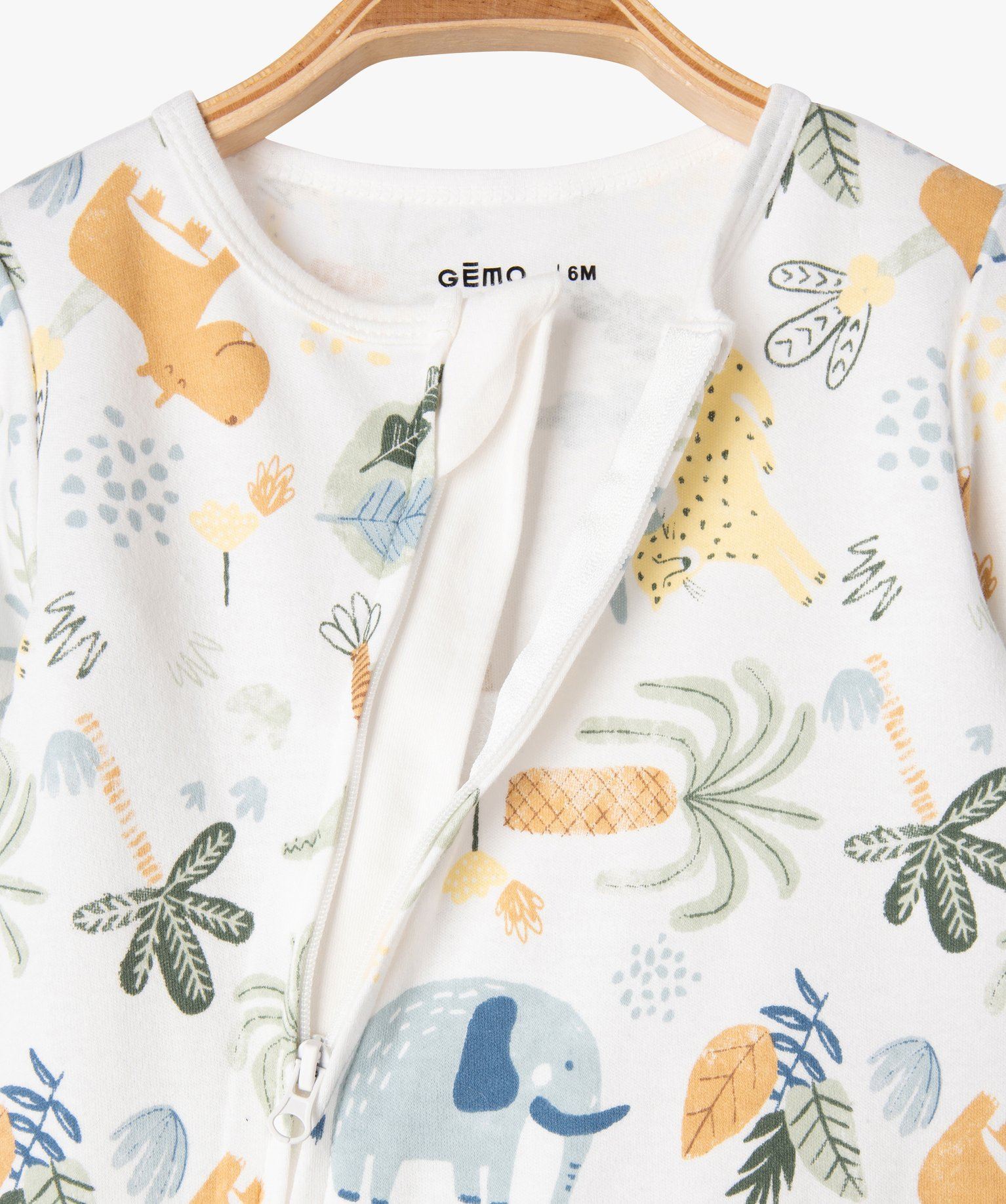 Bien couvrant mais en jersey de coton, ce pyjama bébé est idéal pour la mi-saison. Doté d'un zip, le pyjama avec ouverture sur l'avant s'ouvre intégralement depuis le col jusqu'au pied, facilitant le change et l'habillage. Il est entièrement décoré d'un joli imprimé d'ambiance tropical.