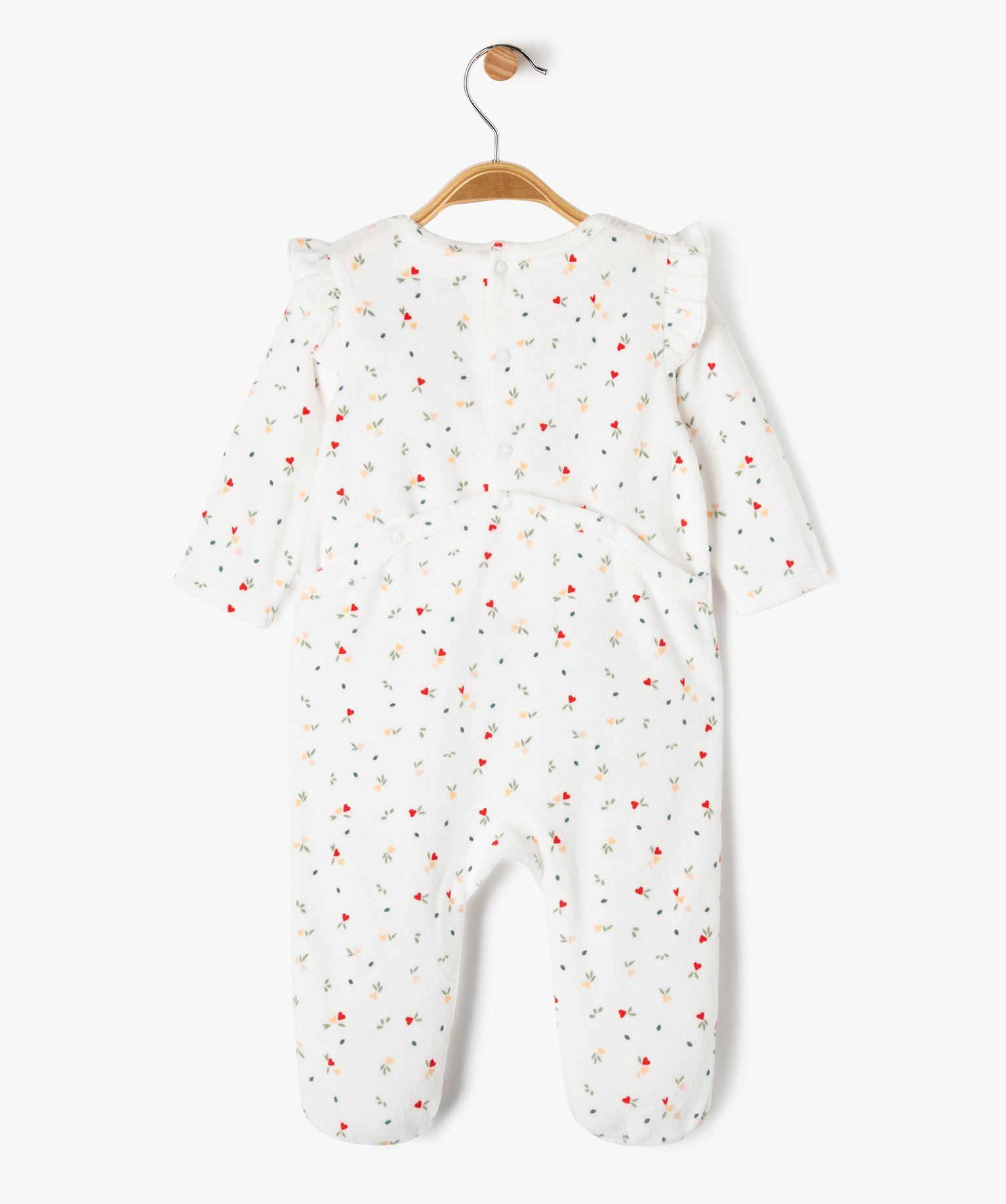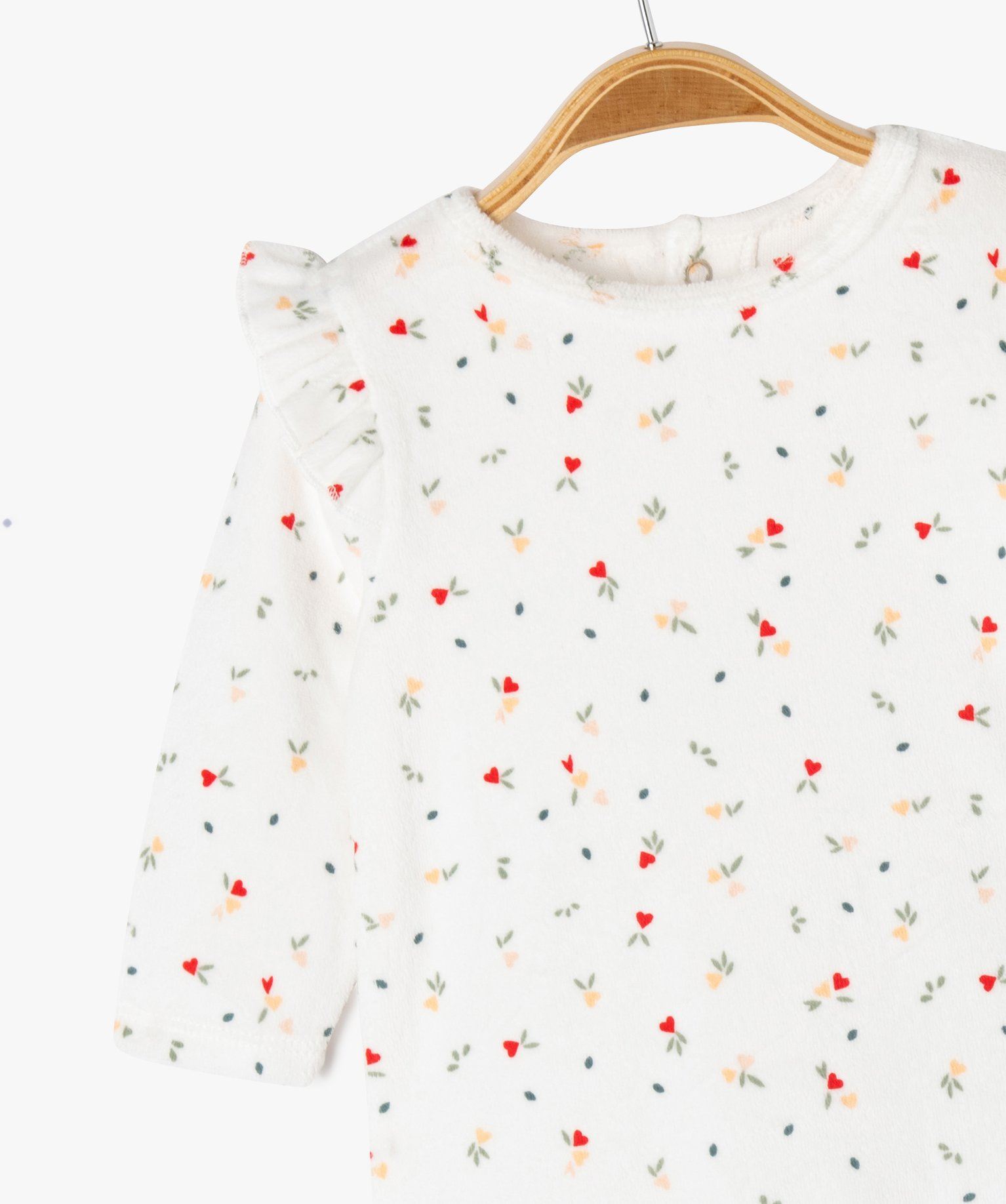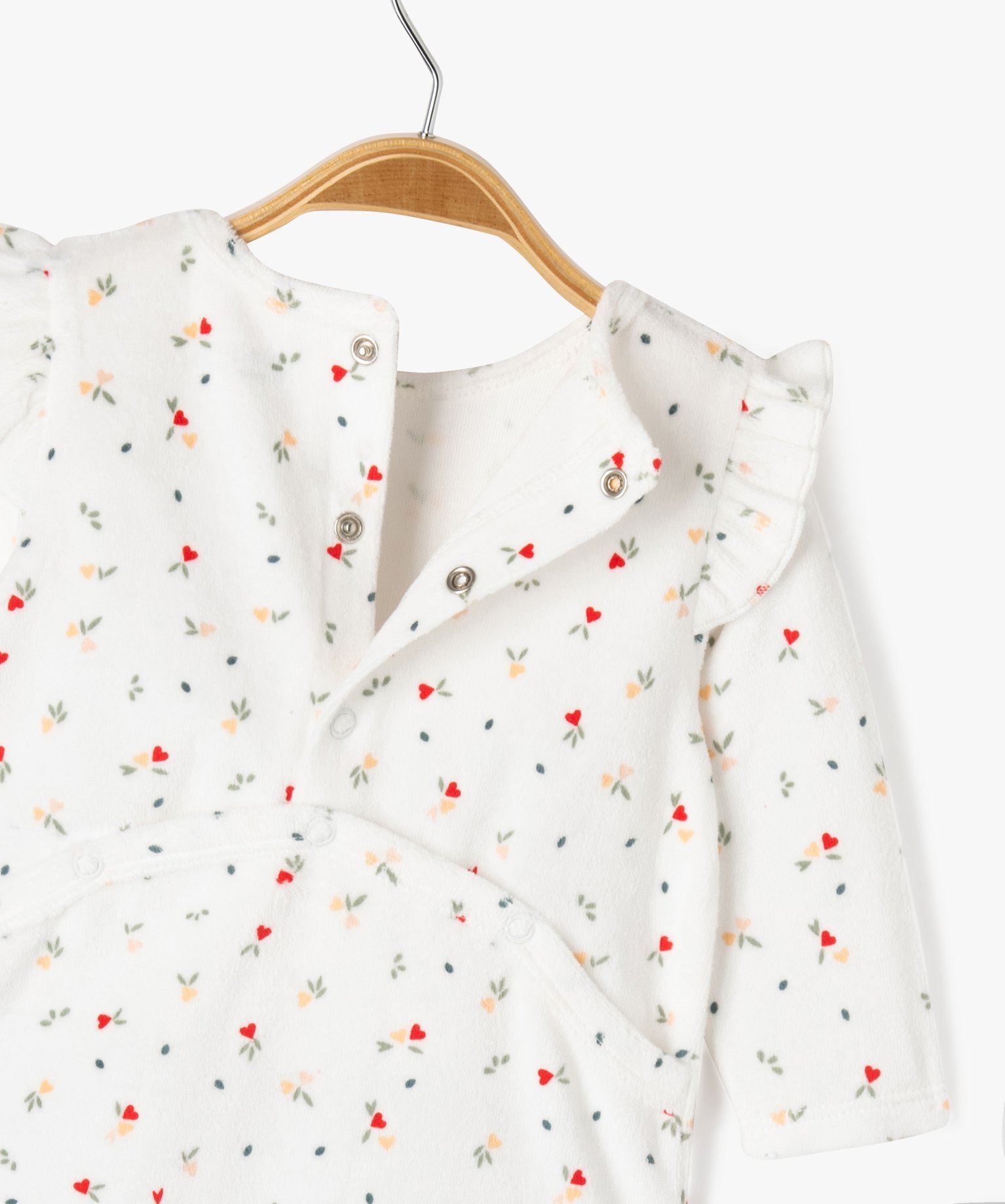 Ce pyjama bébé fille réunit tous les éléments pour faire craquer les petites princesses et leurs parents. Rehaussé de petits volants sur les épaules, il est décoré de petites fleurs en forme de cœurs. Un pyjama en velours, au style girly, parfait pour offrir des nuits douces et de jolis rêves aux petites filles. Sa fermeture pont-dos facilite l’habillage et le change.