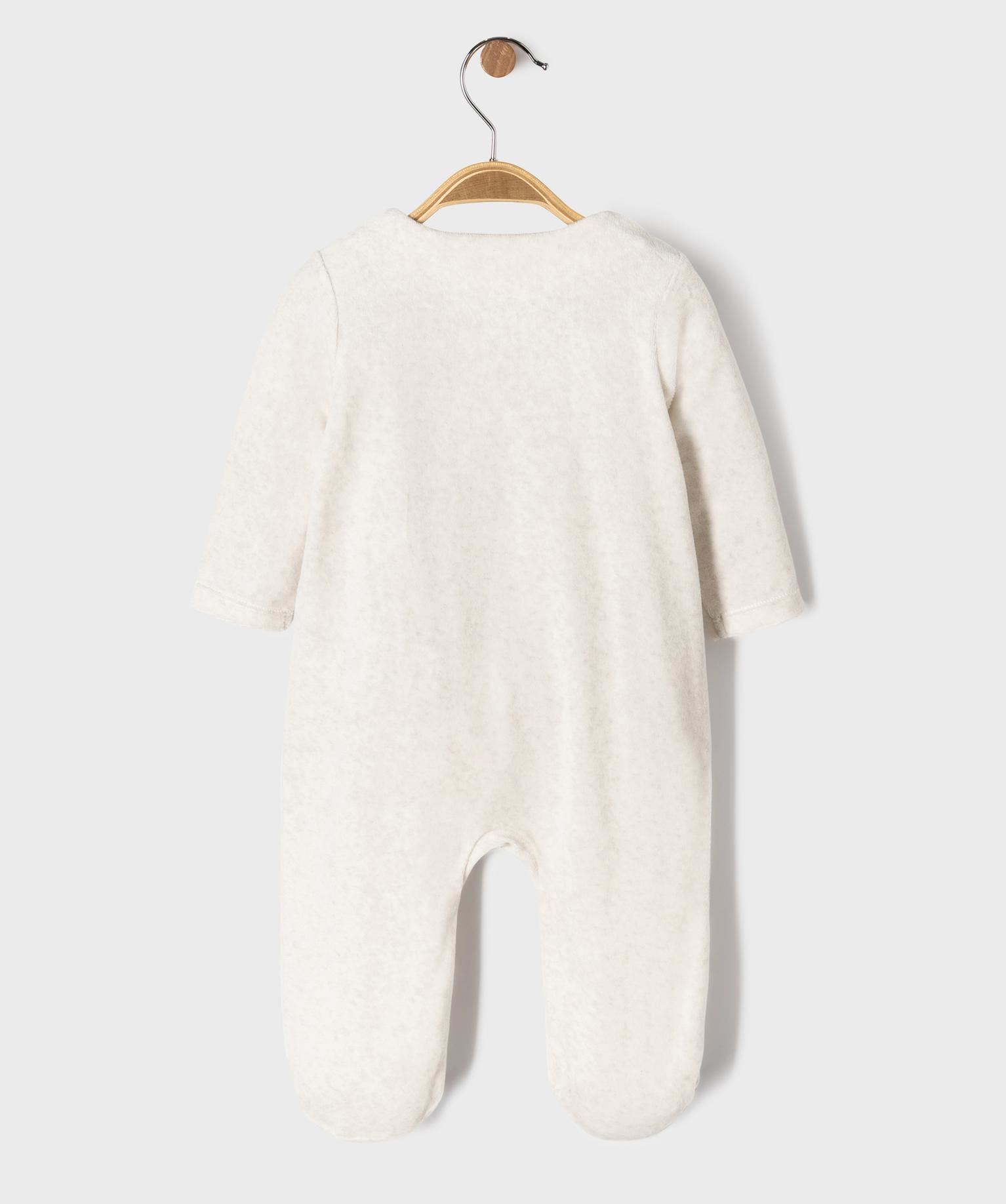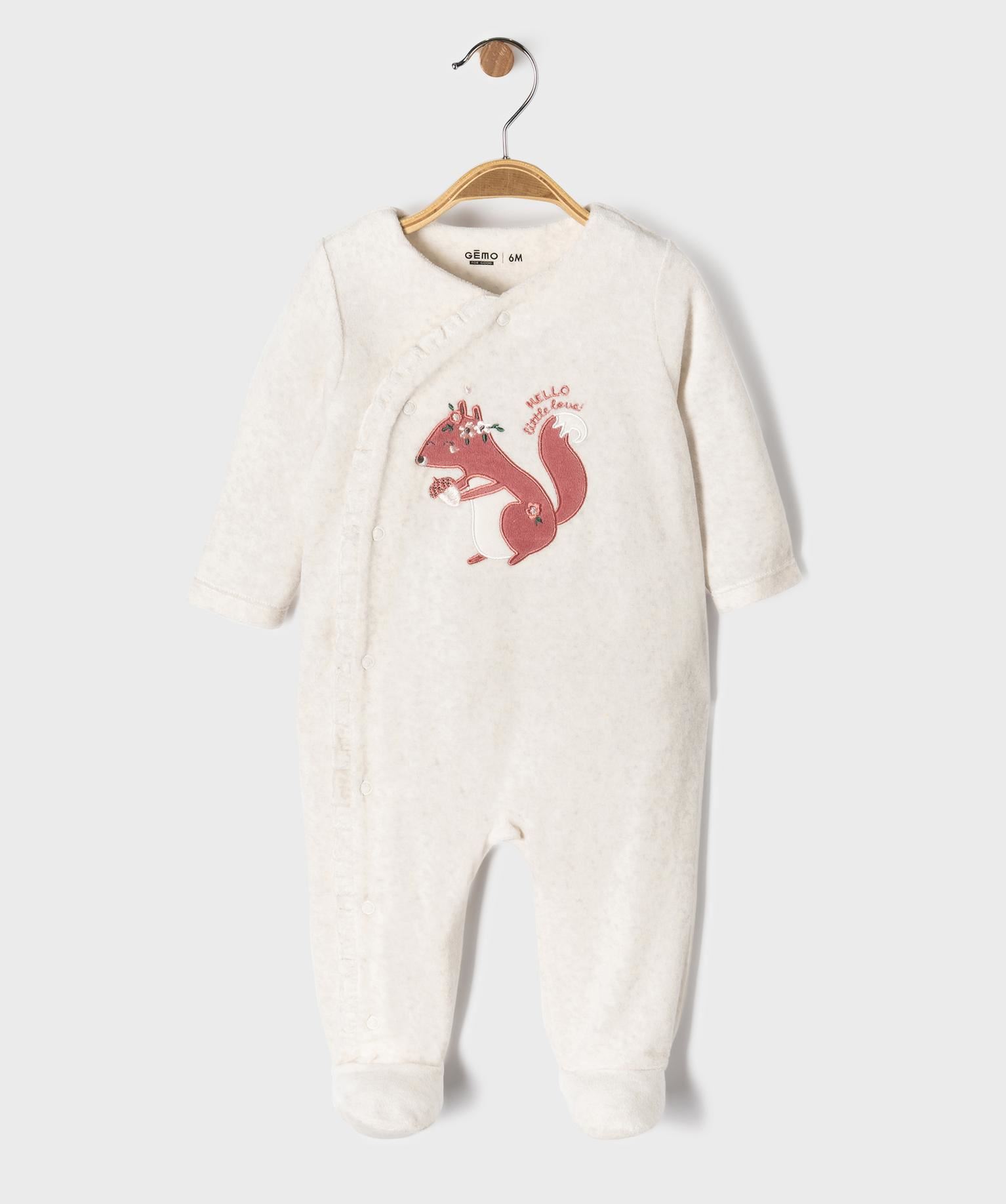 Indispensable du dressing de bébé, le pyjama en velours présente un adorable motif écureuil et un petit volant le long de l'ouverture. Ce pyjama bébé forme dors-bien permet un habillage facile des tout-petits grâce à sa fermeture pressionnée sur l’avant allant du col jusqu’au pied.