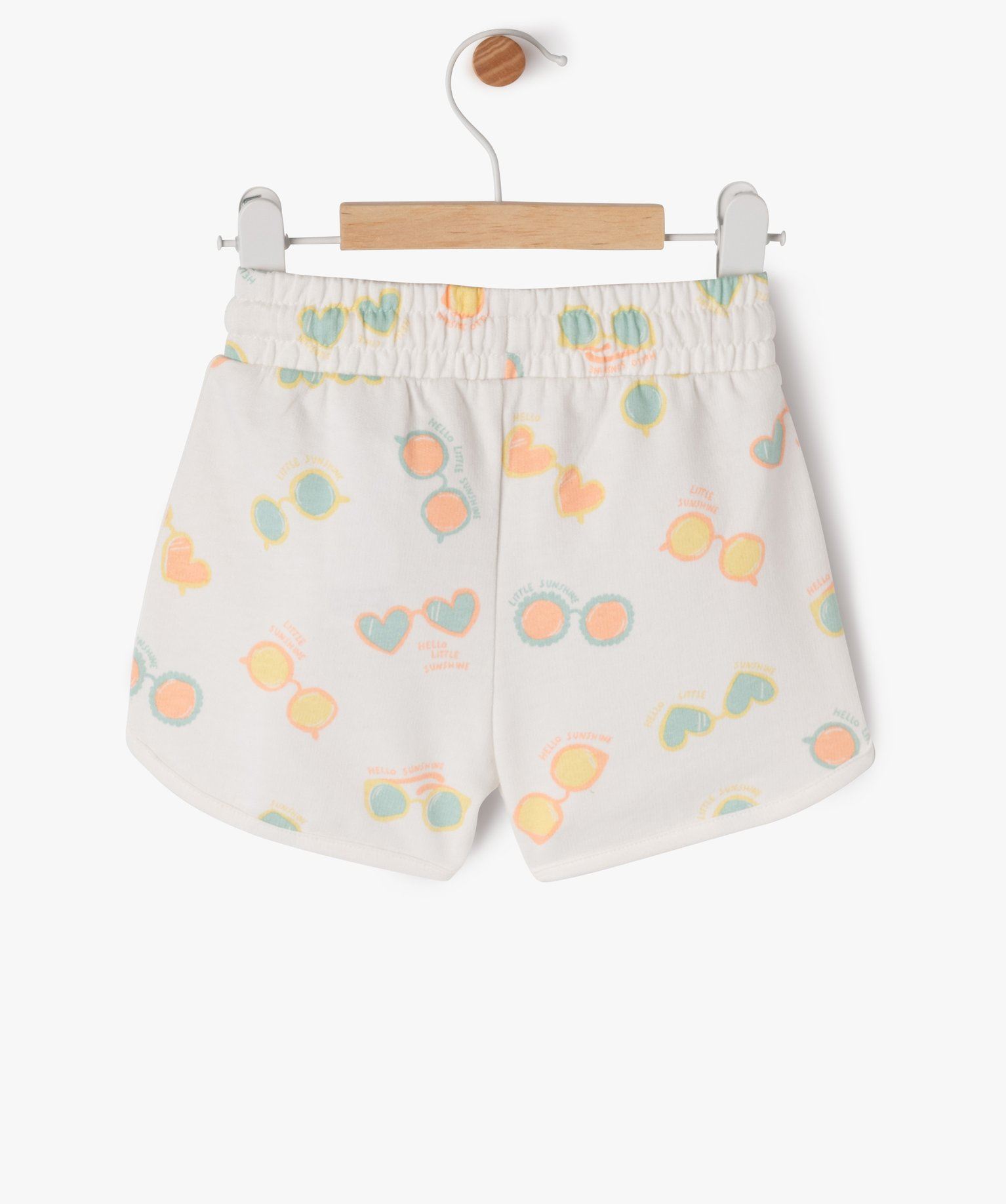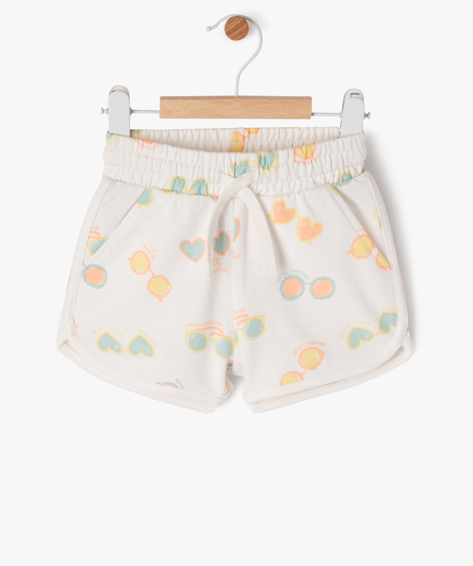Vous allez adorer le look girly de ce petit short bébé fille. Un short en maille fluide avec intérieur bouclette offrant un toucher ultra doux pour la peau des tout-petits, uni ou décoré de lunettes de soleil aux couleurs acidulées, une pièce idéale pour le plein été ! Ce short s’enfile facilement grâce à une large ceinture élastique ajustable par cordon coulissant et possède deux poches italiennes. Les petites fashionistas le porteront avec un body à manches courtes et des sandales à brides.