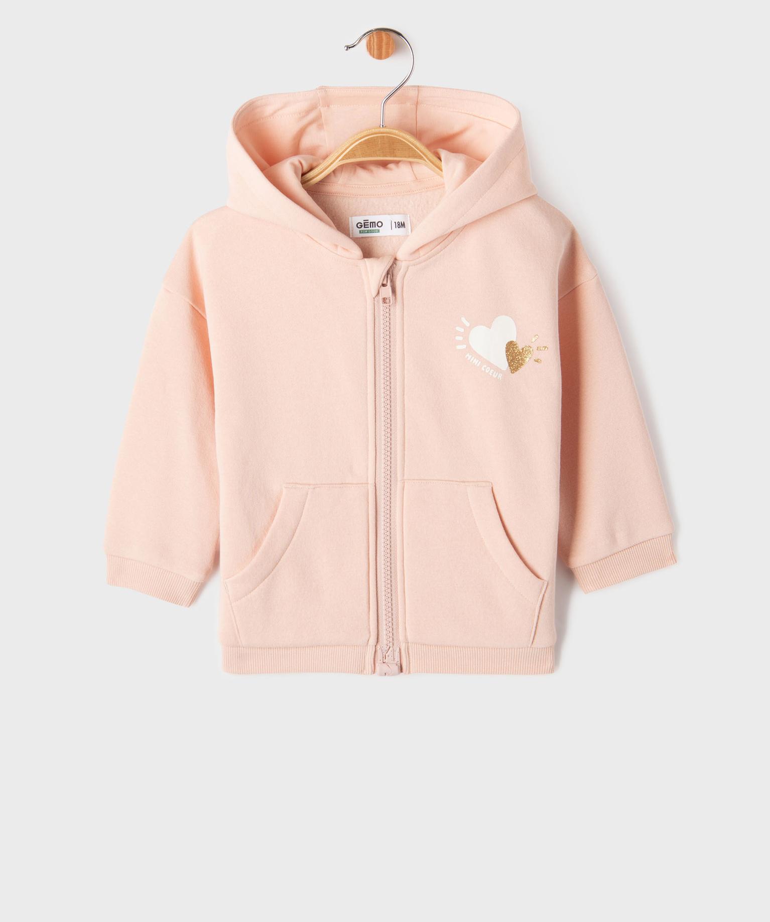 Pièce incontournable pour un style décontracté, le sweat zippé apporte une touche de chaleur aux tenues estivales. Il se porte fermé comme un pull ou ouvert sur un tee-shirt comme une veste. Confectionné dans une maille douce et légère avec un intérieur bouclette, ce sweat bébé fille est doté d’une capuche doublée en jersey pour plus de confort et orné d’un charmant motif sur la poitrine. Il présente des poches kangourou pratiques et des finitions en bord-côte aux poignets et à la base. Un sweat à capuche alliant praticité et style.