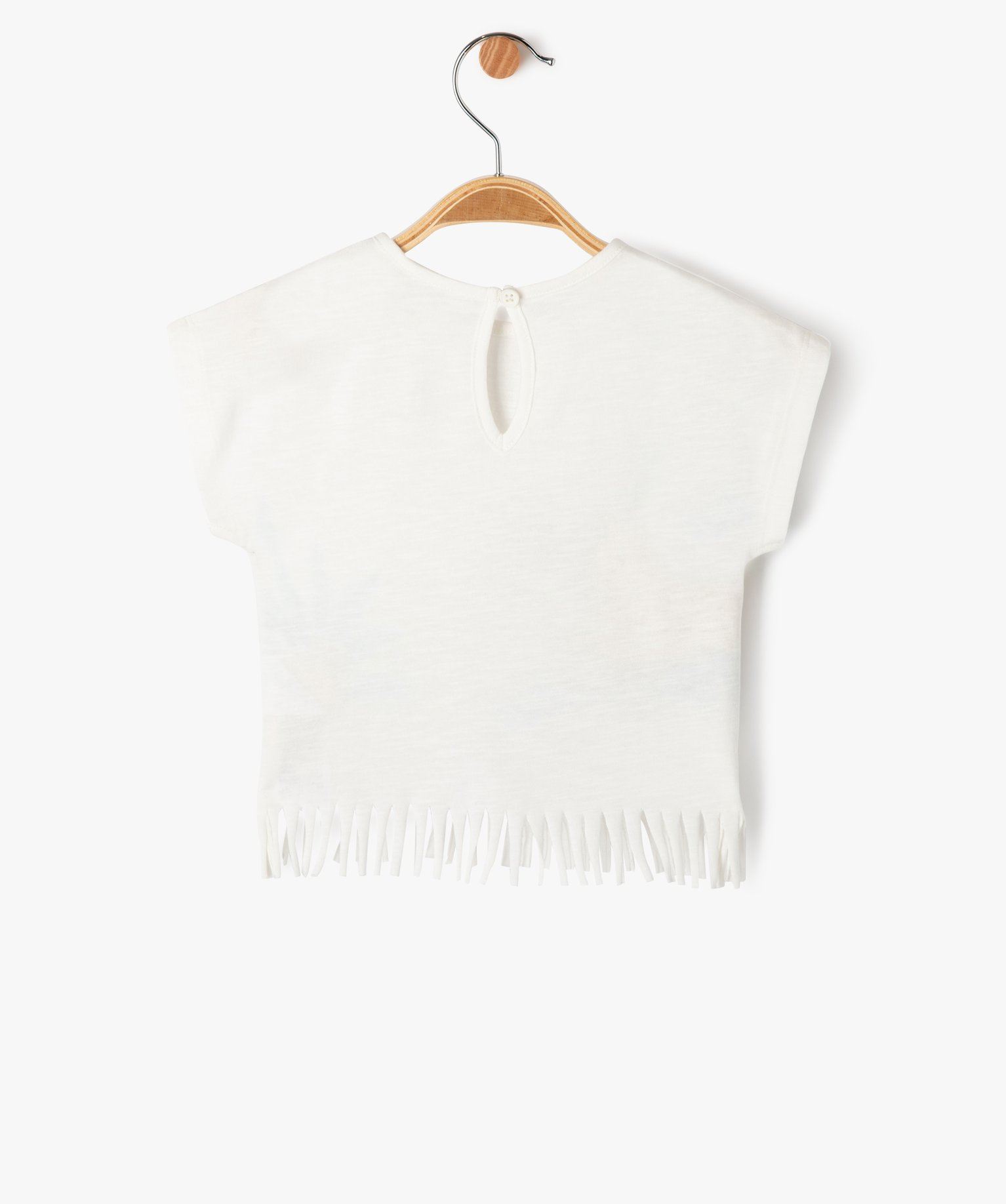 Ce tee-shirt loose apportera une belle touche bohème girly aux tenues de votre enfant. Le tee-shirt bébé fille est décoré de franges dans le bas et d'un charmant motif estival sur l'avant. Sa coupe large est accentuée par des manches très courtes, sans coutures aux emmanchures. Un tee-shirt en coton à porter avec un short en toile ou en jean tout l'été.