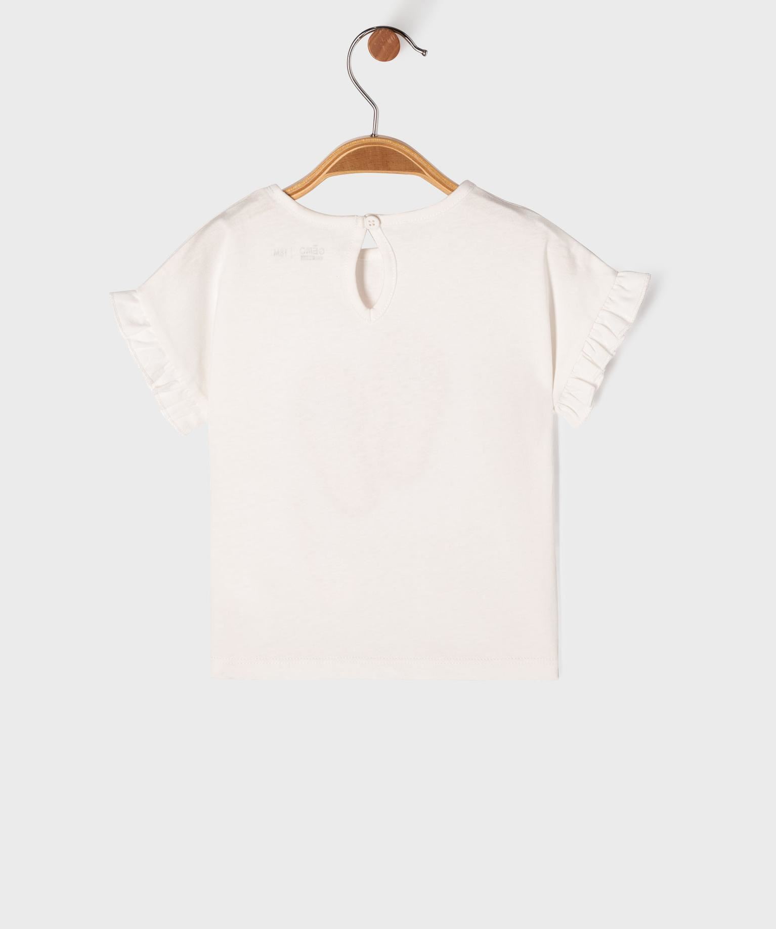 Ce tee-shirt bébé fille se fait une place de choix dans la collection de basiques des petites princesses en se démarquant par ses volants au bord des manches et son adorable motif sur le buste. Un tee-shirt à manches courtes dont la coupe ample est accentuée par l’absence d’emmanchures, offrant un effet loose au top de la mode. Ce tee-shirt girly sera le meilleur allié d’une jupe à volant ou un pantalon en coton. Col rond. Bouton dans le haut du dos avec ouverture goutte.