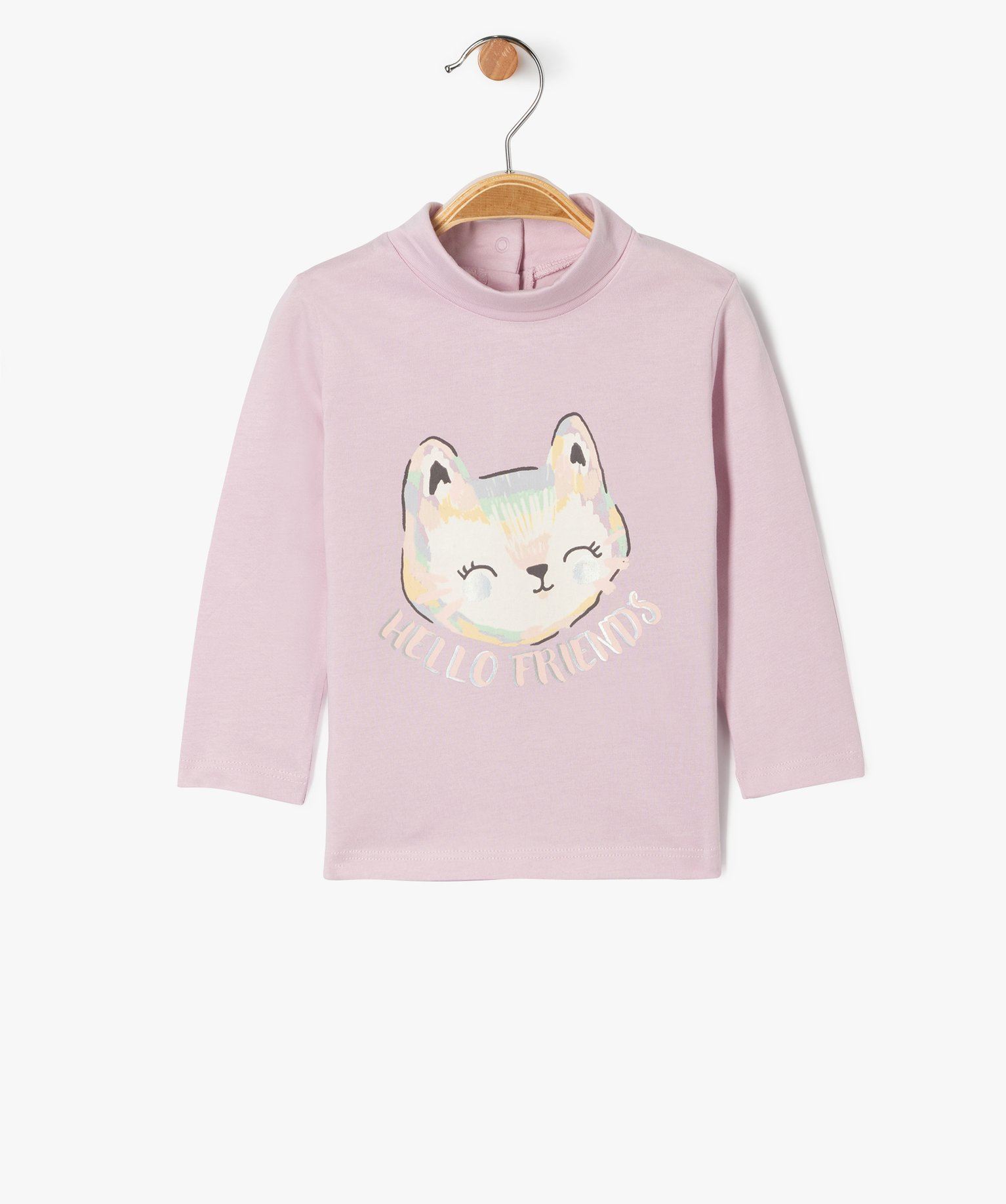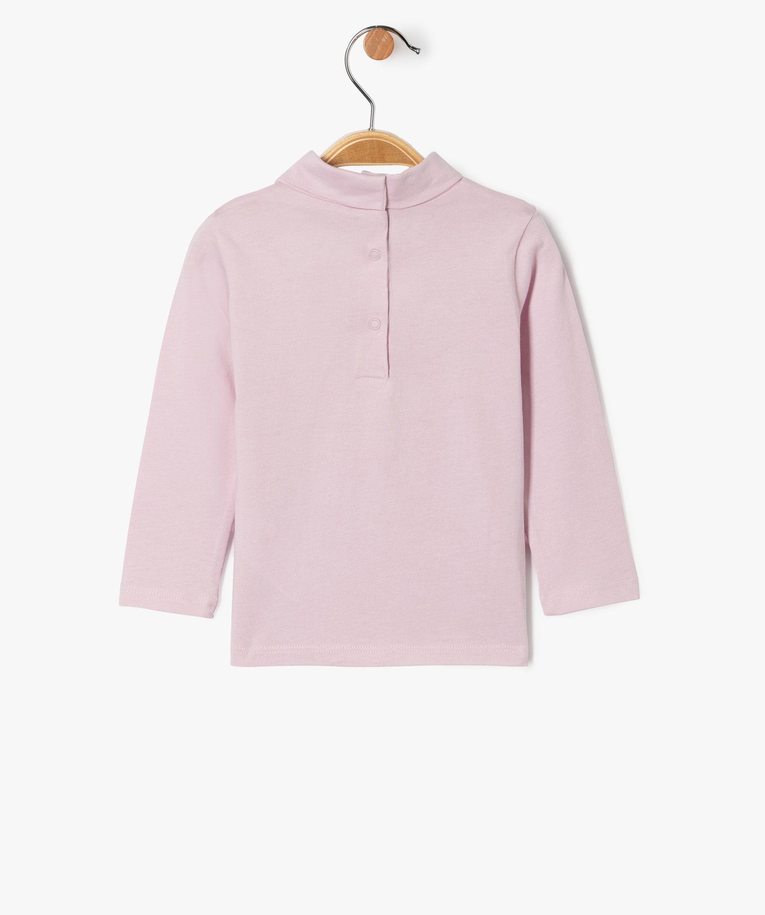 Pratique et mignon, le tee-shirt bébé fille à col roulé avec son motif imprimé sur la poitrine. Ce tee-shirt à manches longues sera parfait à la mi-saison sous une veste ou un gilet ouvert. En plein cœur de l'hiver, il jouera parfaitement le rôle de sous-pull, grâce à son col montant et à sa matière douce 100% coton. Pour faciliter l'habillage, le vêtement est équipé de 3 boutons-pression dans le haut du dos.