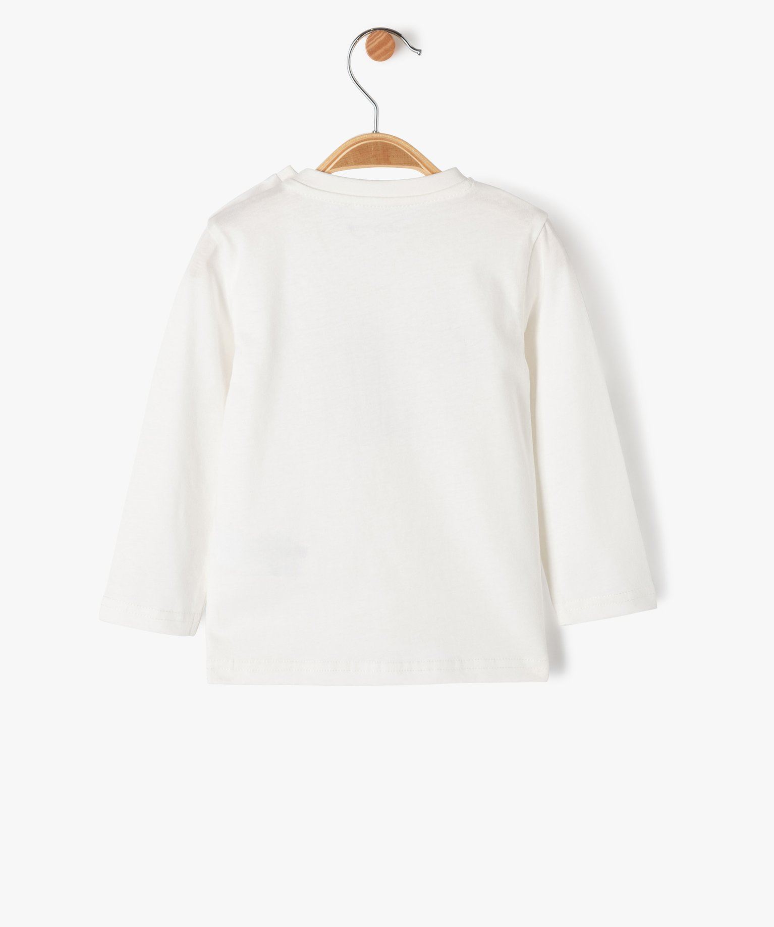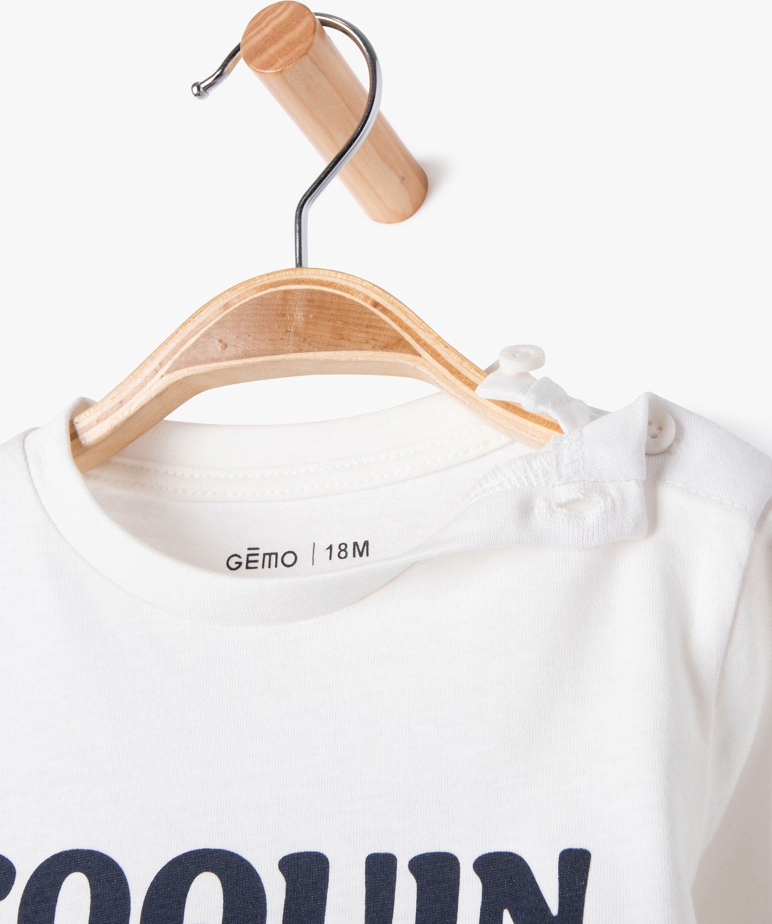 Les tee-shirts à message créent toujours autant l'engouement ! Normal, ils sont fun et permettent d'exprimer une humeur ou mettent à l'honneur un membre de la famille... Ils sont parfaits pour un style plein de caractère au quotidien... Stylé, le tee-shirt bébé garçon est également confortable et pratique : confection 100% coton, passage de la tête facilité par des boutons sur les épaules, coupe droite. Un tee-shirt manches longues à intégrer absolument au vestiaire de bébé ou à offrir comme cadeau de naissance !