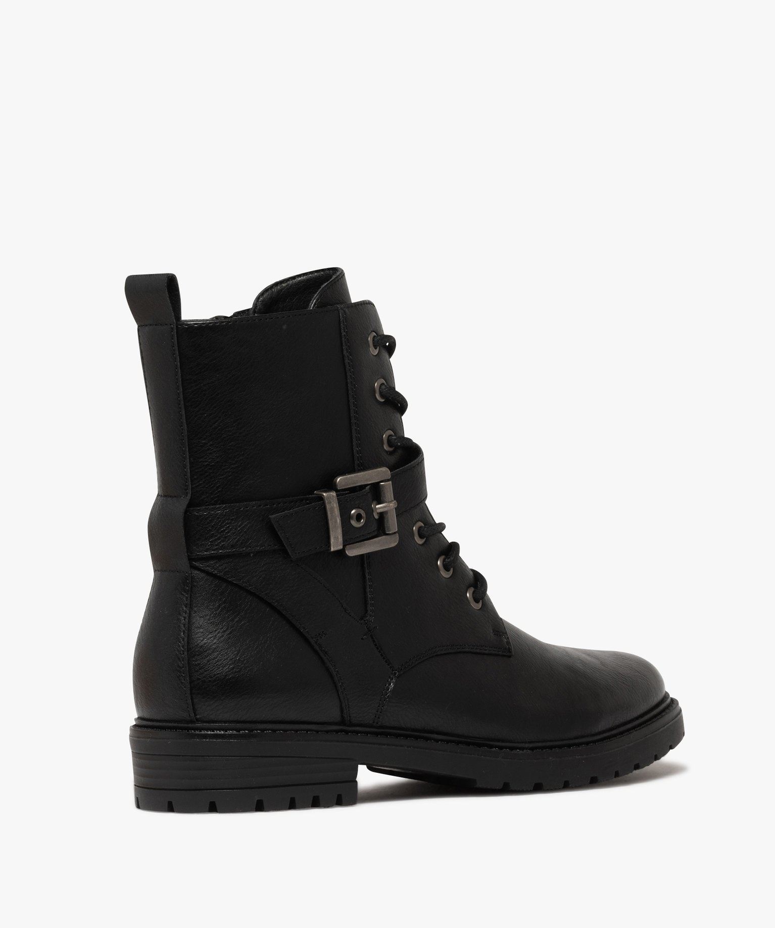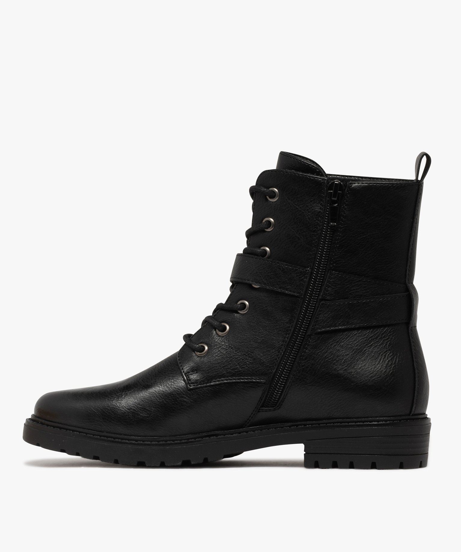 Ces bottines à lacets adoptent une tige montante en cuir imitation, à aspect grainé, et zippée sur le côté. L'espace de laçage est traversé par une bride à boucle fantaisie, un détail qui leur donne un air de bottes style biker. Montées sur une semelle crantée, ces boots pour femme se portent avec vos tenues casual préférées. Semelle intérieure en cuir.