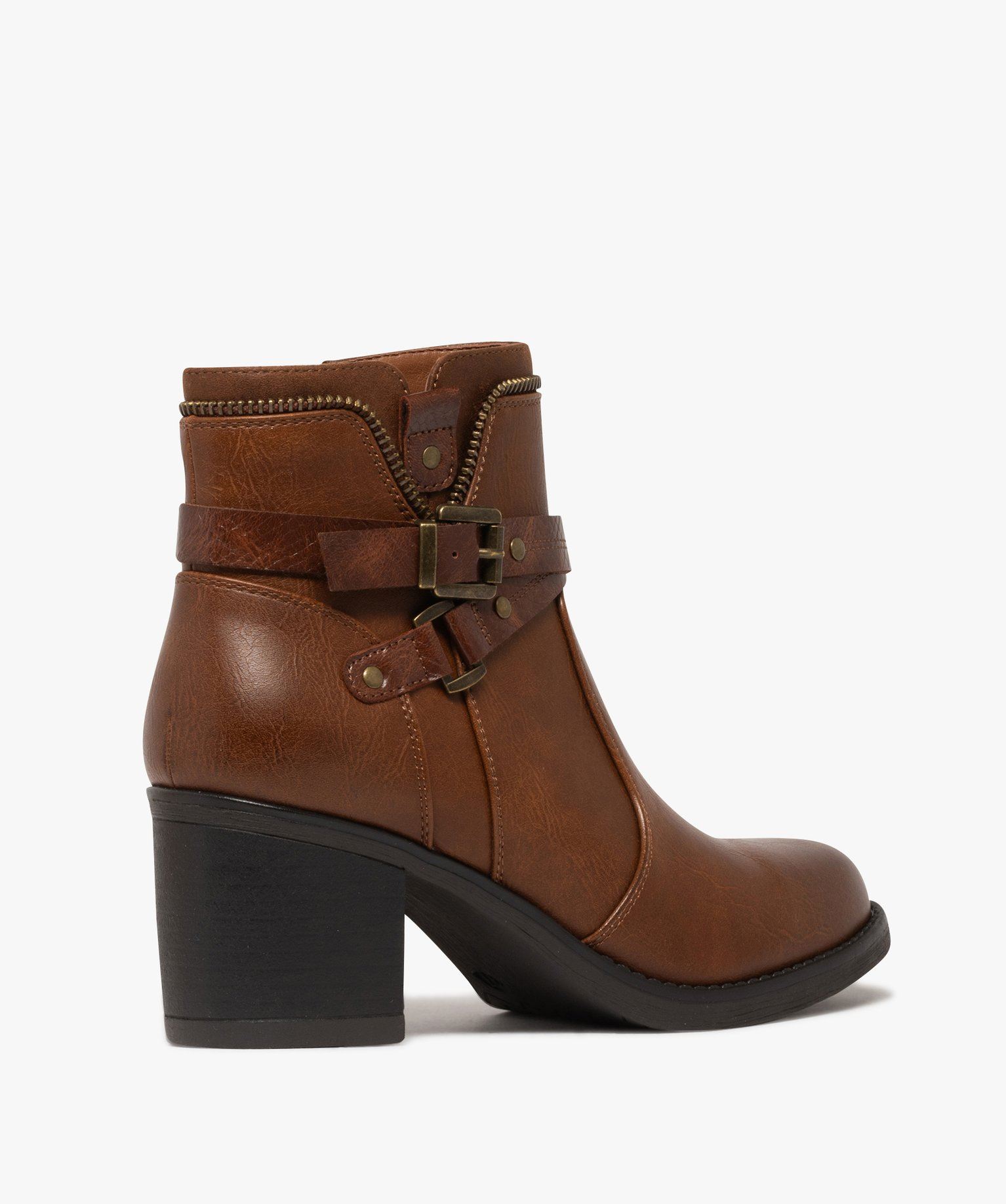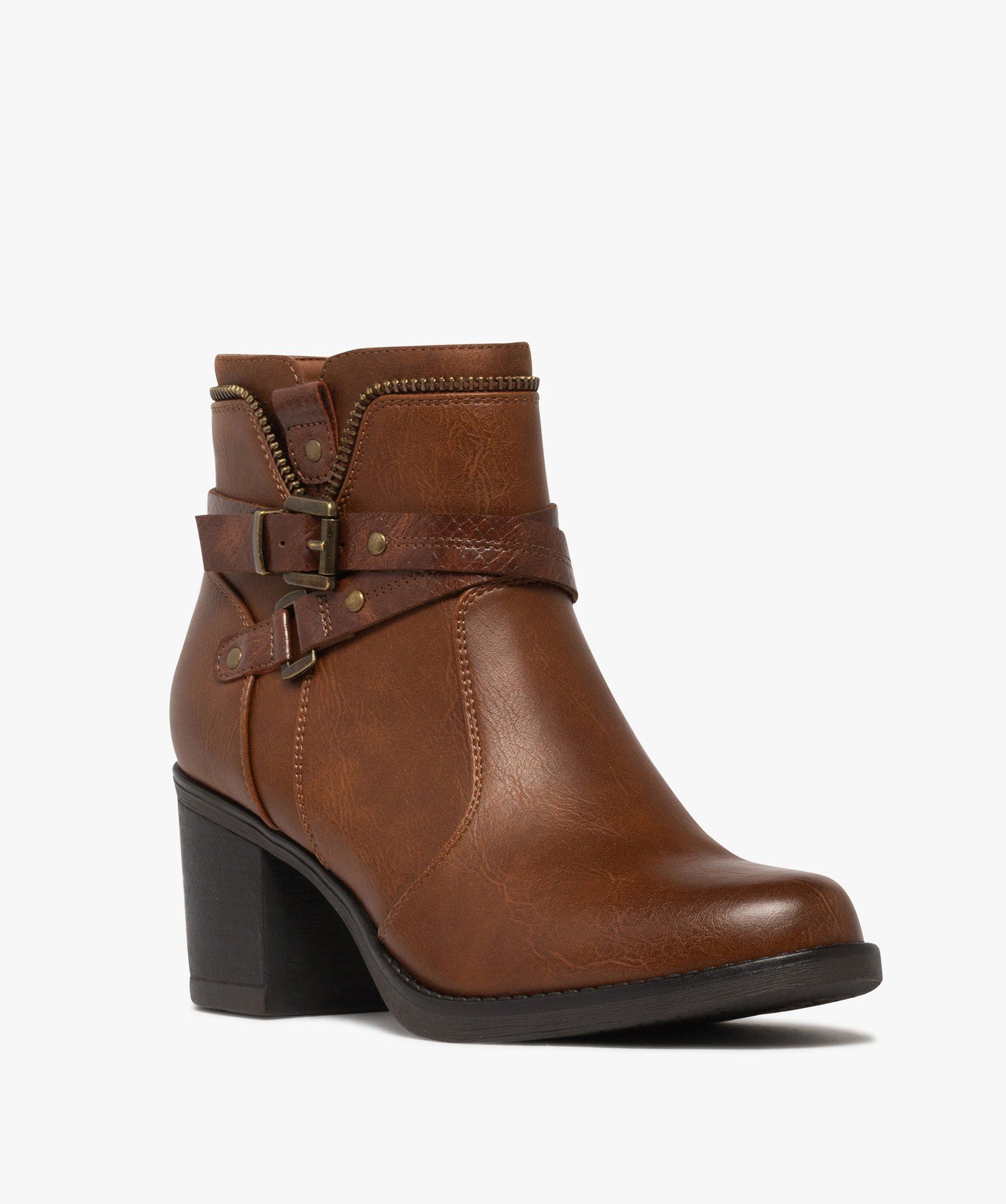 Ces bottines pour femme s'équipent d'un col montant original. Décoré de brides à boucle fantaisie et avec un effet reptile, un zip l'entoure et donne une impression de double col. La tige est unie, en cuir imitation grainé et le bout en amande. Un modèle de boots à talon carré que vous allez pouvoir aisément porter avec vos tenues casual : robe-crayon + blazer ou jean + chemisier. Fermeture à zip intérieur.