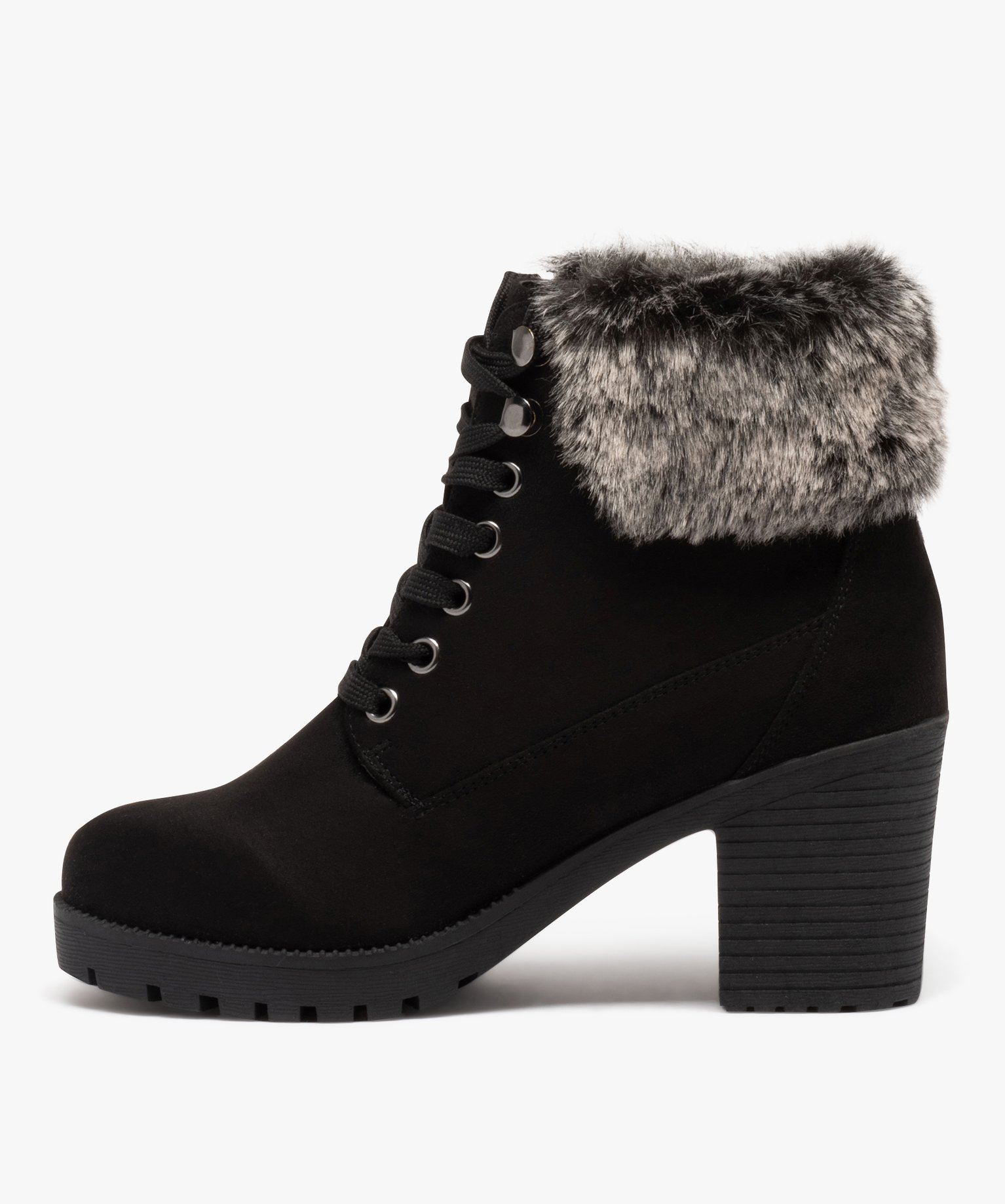 Pour l'hiver, ces boots pour femme sont sublimes. Avec un joli col en fourrure imitation et la tige unie en suédine, ces bottines fourrées évoquent douceur et confort. Montées sur un talon haut de 7,5 cm, la semelle est crantée et apporte une allure moderne. Ces bottines à lacets peuvent se porter avec une jupe crayon ou un jean slim, et un pull fin. Fermeture à lacets plats 5 oeillets métallisés + 2 passants.