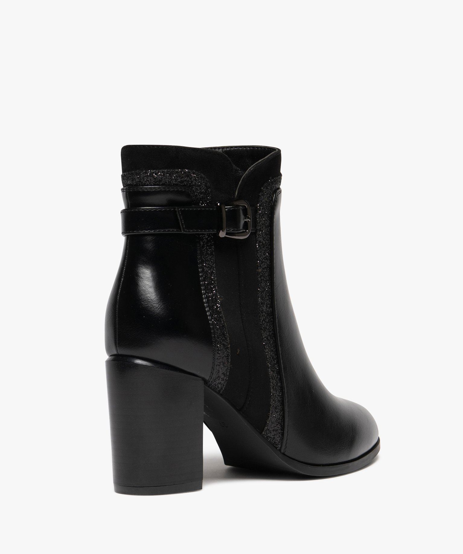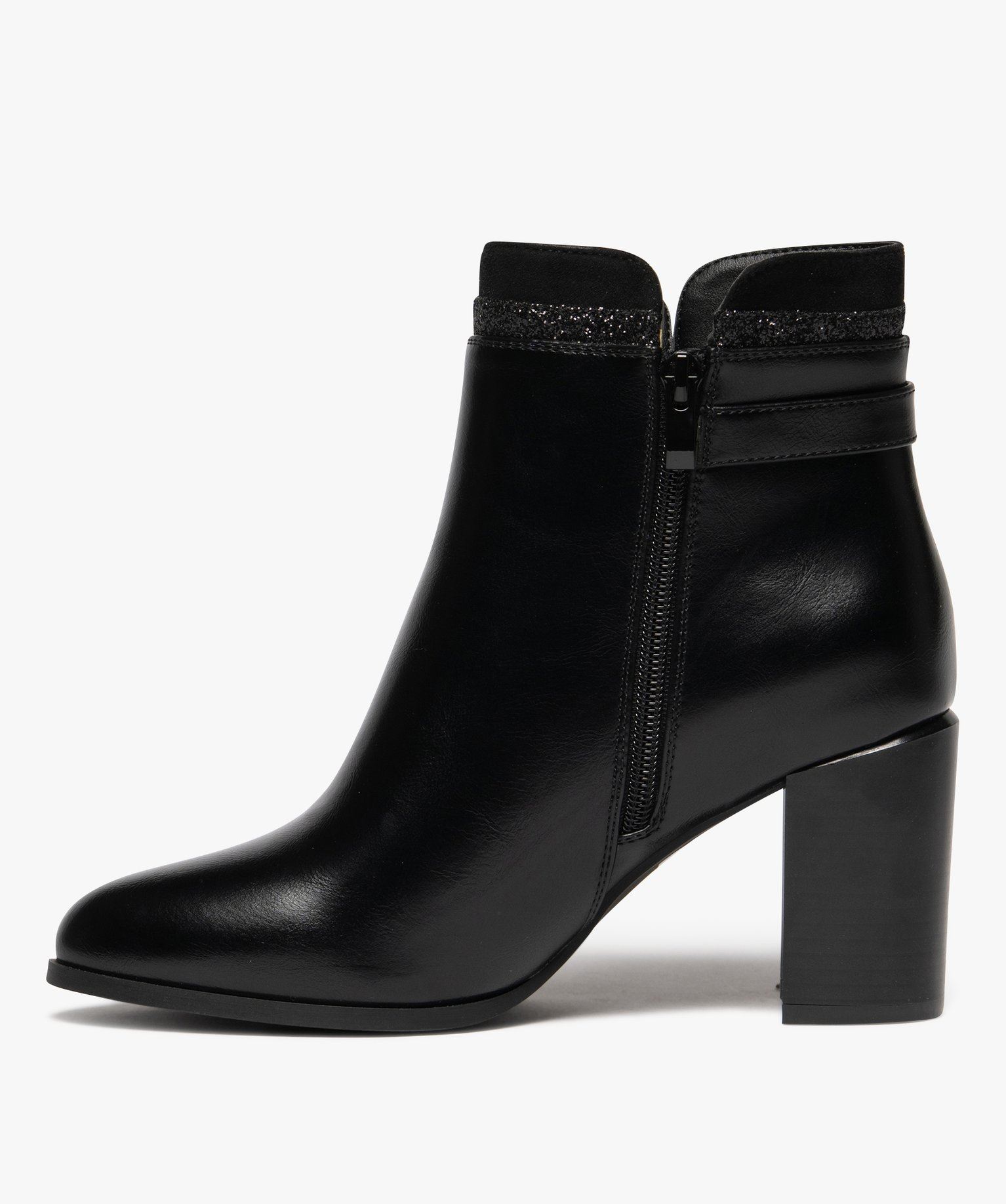 Montées sur un haut talon, ces bottines pour femme s'habillent de jolies paillettes autour du col, joliment décolleté sur les côtés. Avec un bout en amande, elles sont élégantes et si faciles à associer : jean skinny ou flare, jupe courte ou longue, robe sur collants... Choisissez selon vos envies et votre programme, comment porter ces boots à talon haut. Semelle intérieure moussée.