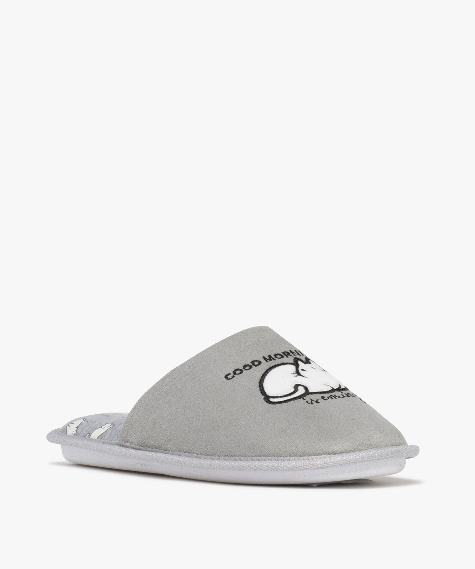 Vous allez adorer glisser vos pieds dans ces chaussons mules tout doux ! Des chaussons femme dont le dessus est décoré d’un adorable motif chat et d’une inscription positive brodée, idéal pour démarrer la journée d’un bon pied ! Ils sont dotés d’une semelle en mousse très confortable, elle aussi décorée de petits chats. Des mules d'intérieur à porter avec tous vos pyjamas et tenues décontractées.