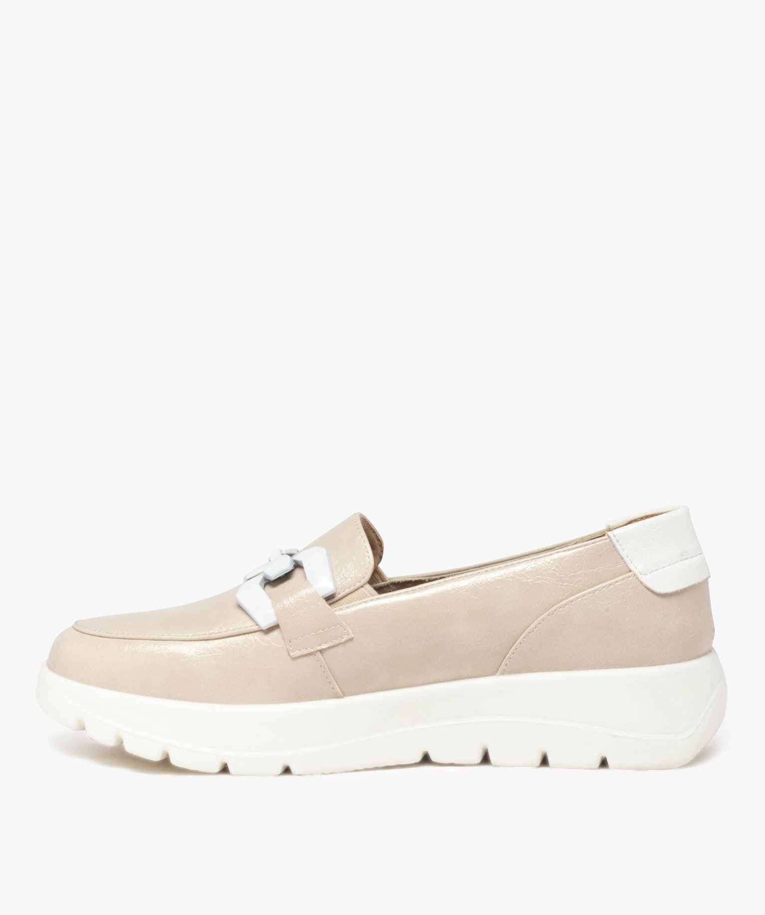 Montées sur une épaisse semelle contrastante et amortissante, ces mocassins confort se démarquent par leur allure casual et sportswear à la fois. La paire de chaussures confort idéale pour vous détendre et prendre soin de votre voûte plantaire grâce à la semelle intérieure moussée et respirante. Ces mocassins pour femme adoptent une allure tout terrain avec une tige vernie en cuir imitation et une bride fantaisie métallique sur le dessus, qui pourra habiller tous les styles. Insertion facile du pied.