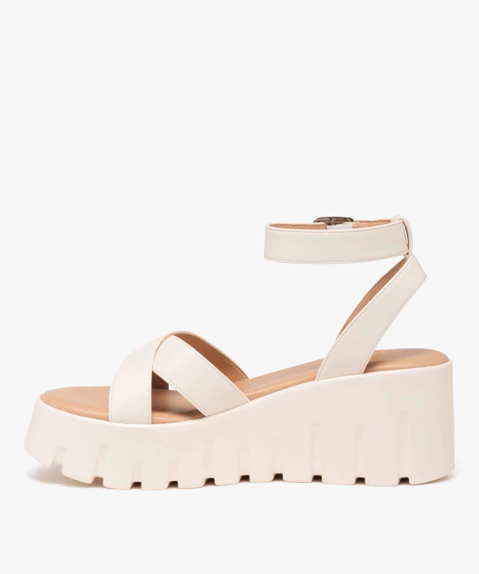 Look futuriste pour ces incroyables sandales pour femme ! Des sandales aux brides sobres, mais à la semelle plateforme travaillée en relief très originale. Les sandales sont composées de larges brides croisées sur l'avant et d'une bride à boucle qui monte haut sur la cheville. La semelle intérieure est ultra moelleuse. Des nu-pieds avec un minimum de coutures, pour des finitions minimalistes mais un look extravagant. À porter avec une combinaison pantalon 7/8e !