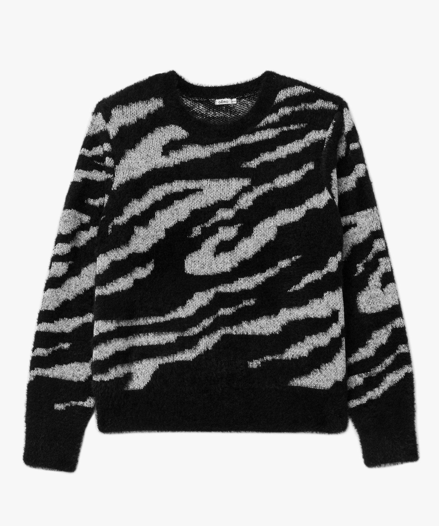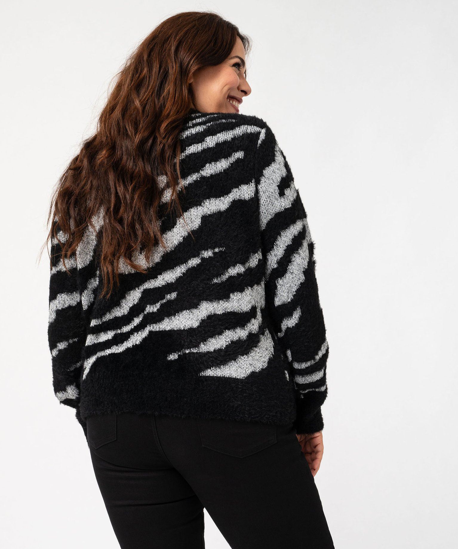Cet élégant pull en maille ajoutera une indéniable touche glamour dans votre garde-robe. Ce pull femme grande taille (du 46/48 au 54/56) est tricoté dans une alliance de maille peluche et de fil pailleté dans un joli motif zébré. Ce pull scintillant affiche une coupe ample avec épaules tombantes et un col rond bien dégagé. Il sera parfait pour illuminer un pantalon slim lors de toutes vos soirées et lors des fêtes de fin d’année.