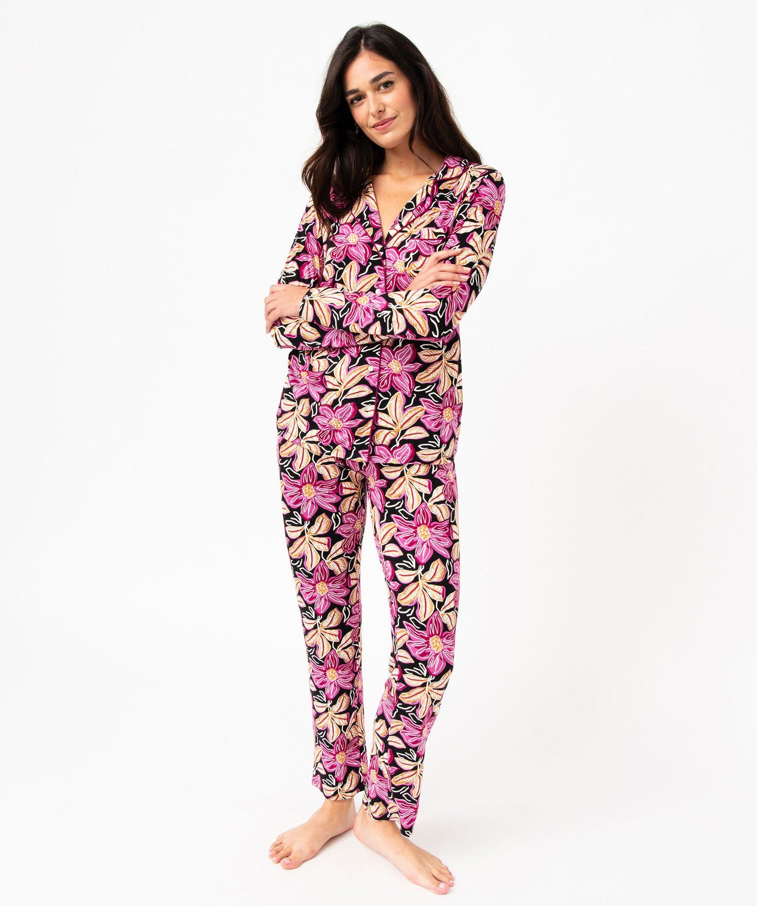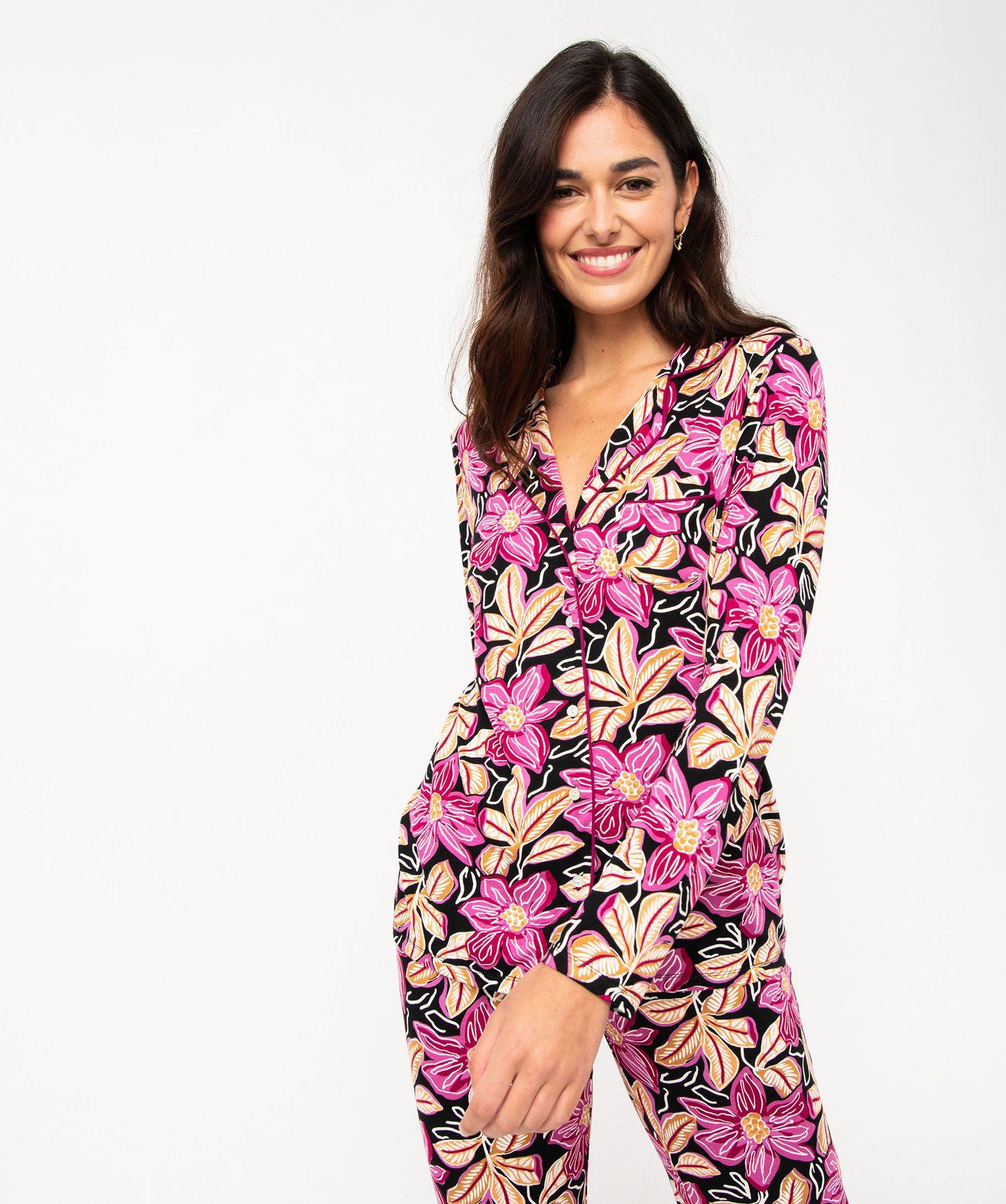 On adore ce pyjama pour femme en matière toute douce. Un pyjama deux pièces avec un haut forme chemise boutonnée sur l'avant. Les finitions avec liseré passepoilé lui confèrent une allure très élégante. La chemise de pyjama possède une petite poche poitrine sur le côté gauche. Le pantalon est ample et confortable avec une taille ajustable par cordon à nouer. Un pyjama fluide à porter pour dormir ou comme tenue d'intérieur.