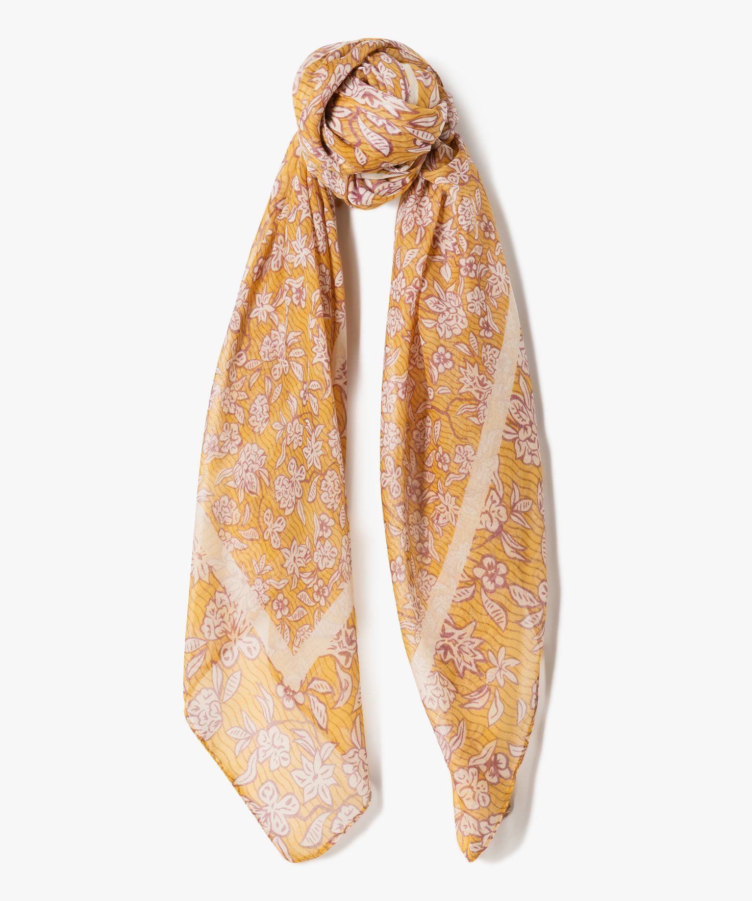 Superbe foulard femme au motif fleuri et aux couleurs chaudes qui réveilleront vos looks ! Carré, avec de belles dimensions, ce foulard se porte de multiples manières. Vous allez adorer la douceur et la légèreté de sa matière.