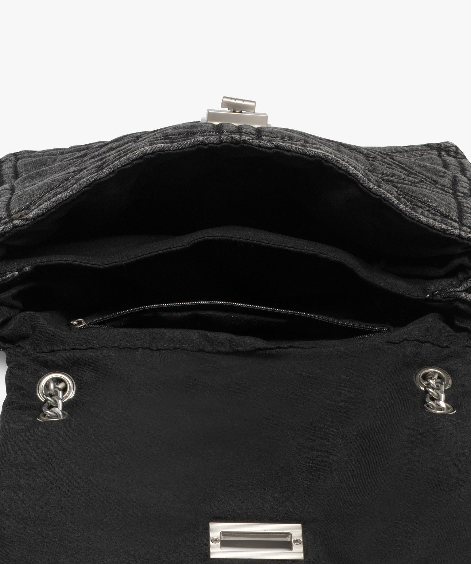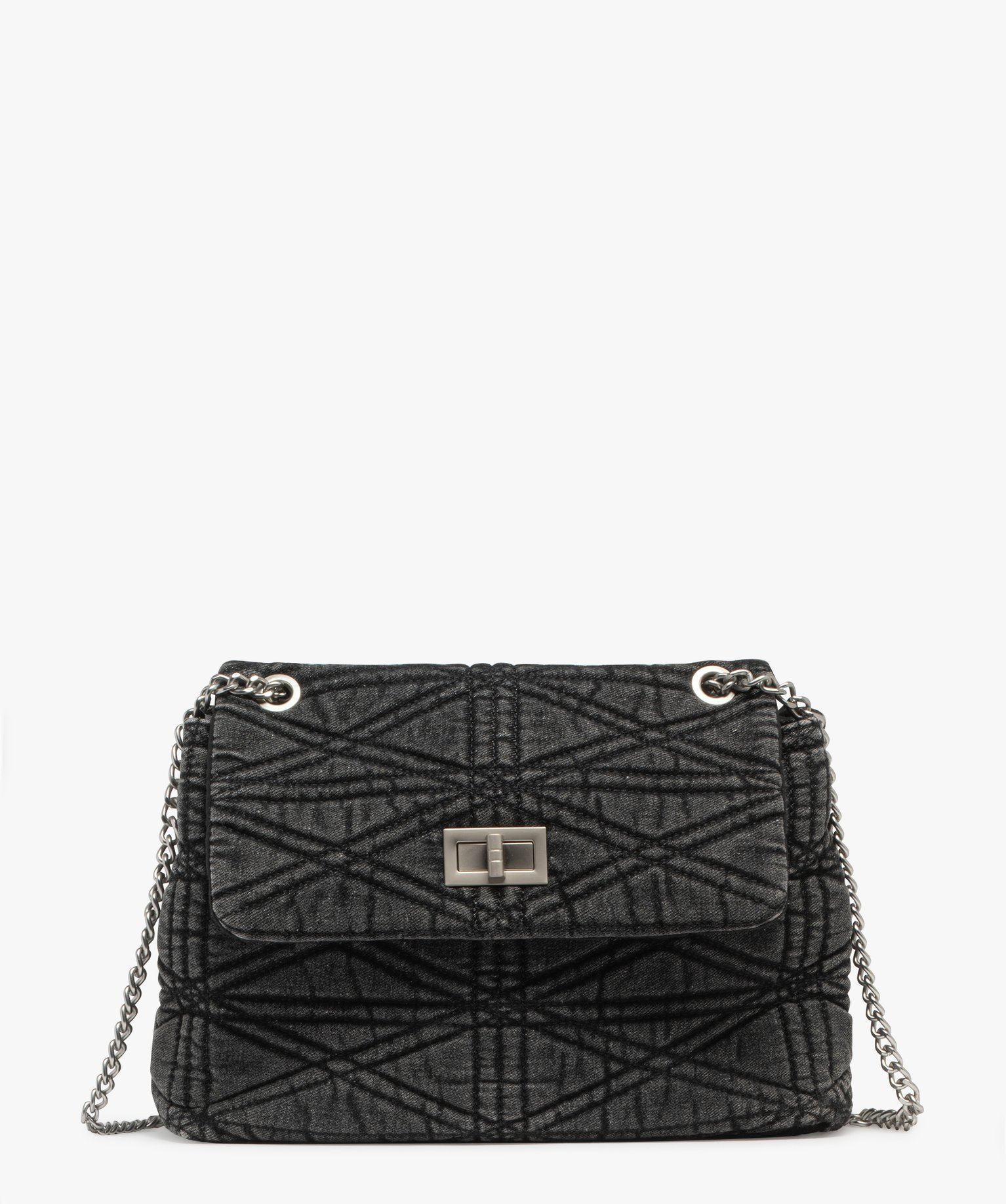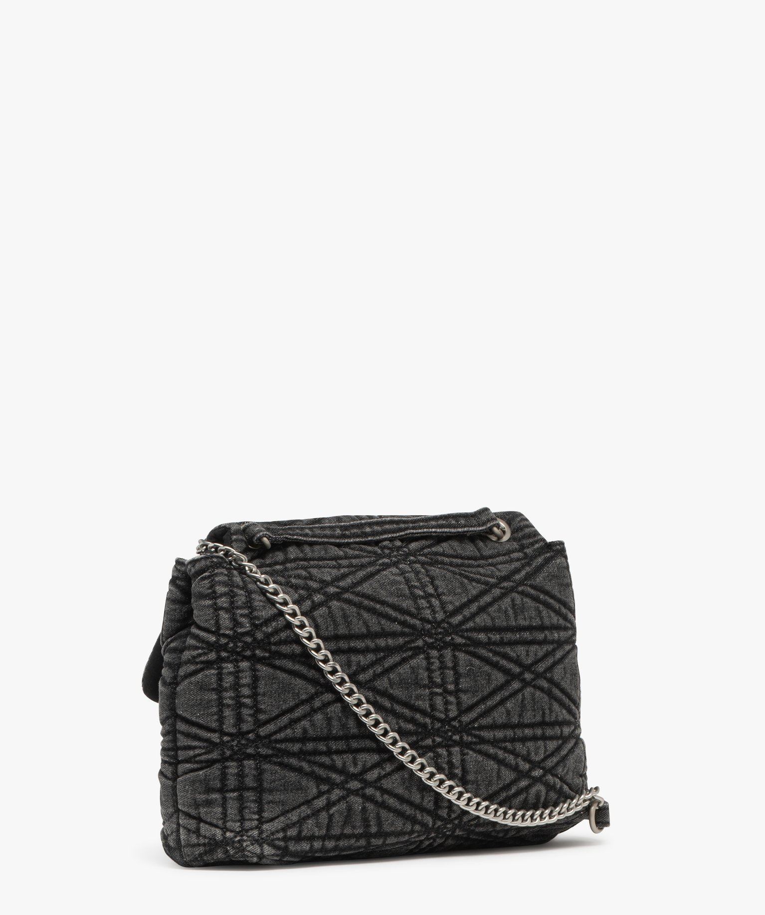 Réinterprétation de la musette, ce sac besace allie style et praticité ! Il affiche une belle contenance, avec 2 grands compartiments sous rabat à tourniquet. Une poche zippée intérieure vous permet de sécuriser vos petits objets. Confectionné en jean matelassé, le sac femme est souple, agréable à manipuler. Sa bandoulière en chaine glissée dans des anneaux coulisse, multipliant la longueur du porté. Détails en métal argenté.