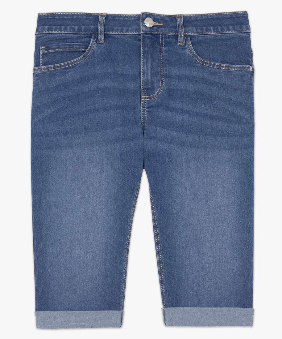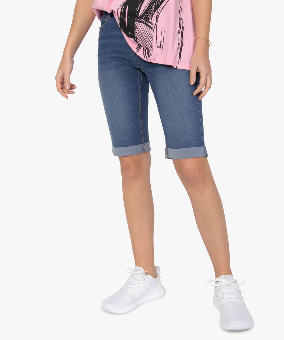 Le bermuda en jean fait partie des pièces indispensables de la garde-robe féminine. Il s’intègre dans tous les looks et se porte aussi bien avec une chemise unie pour un look chic, avec une blouse fleurie pour une allure d’inspiration bohème ou avec un sweat à capuche pour un style streetwear. Ce bermuda femme est confectionné dans un coton extensible pour un maximum de confort. Sa coupe slim valorise la silhouette. Ce bermuda à revers cousus se ferme par zip et bouton, et possède trois poches sur l’avant et deux sur l’arrière.