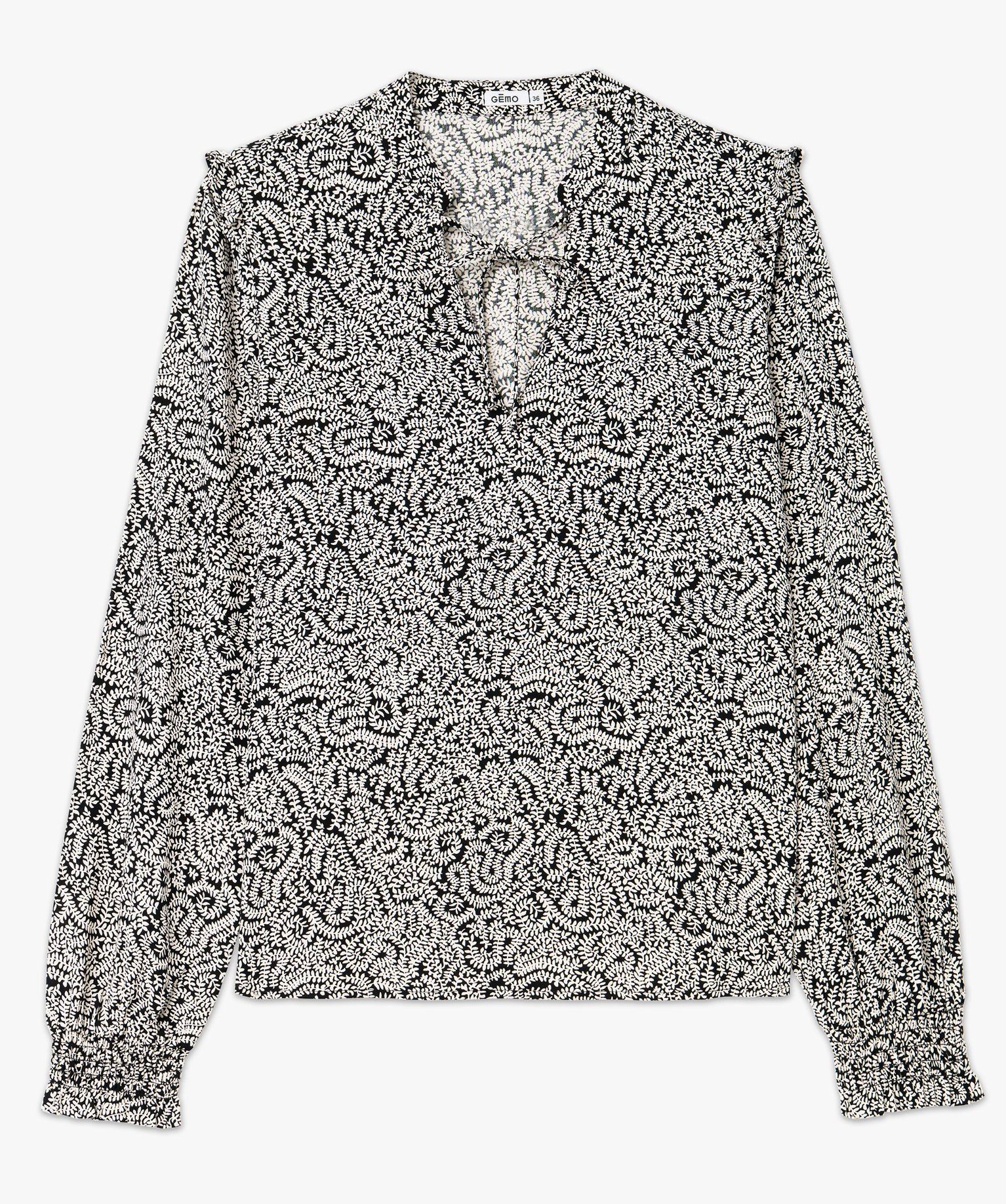 Star du vestiaire féminin, la blouse à manches longues s’affiche dans un bel imprimé coloré pour dynamiser les looks du quotidien. Cette blouse femme possède un col en V agrémenté de liens à nouer. Elle se démarque des chemises traditionnelles grâce à ses finitions smockées aux poignets et ses petits volants sur les épaules. Confectionnée en viscose fluide, elle offre beaucoup de confort, quelle que soit la température extérieure. Un blouse imprimée à marier avec tous les bas unis du dressing.