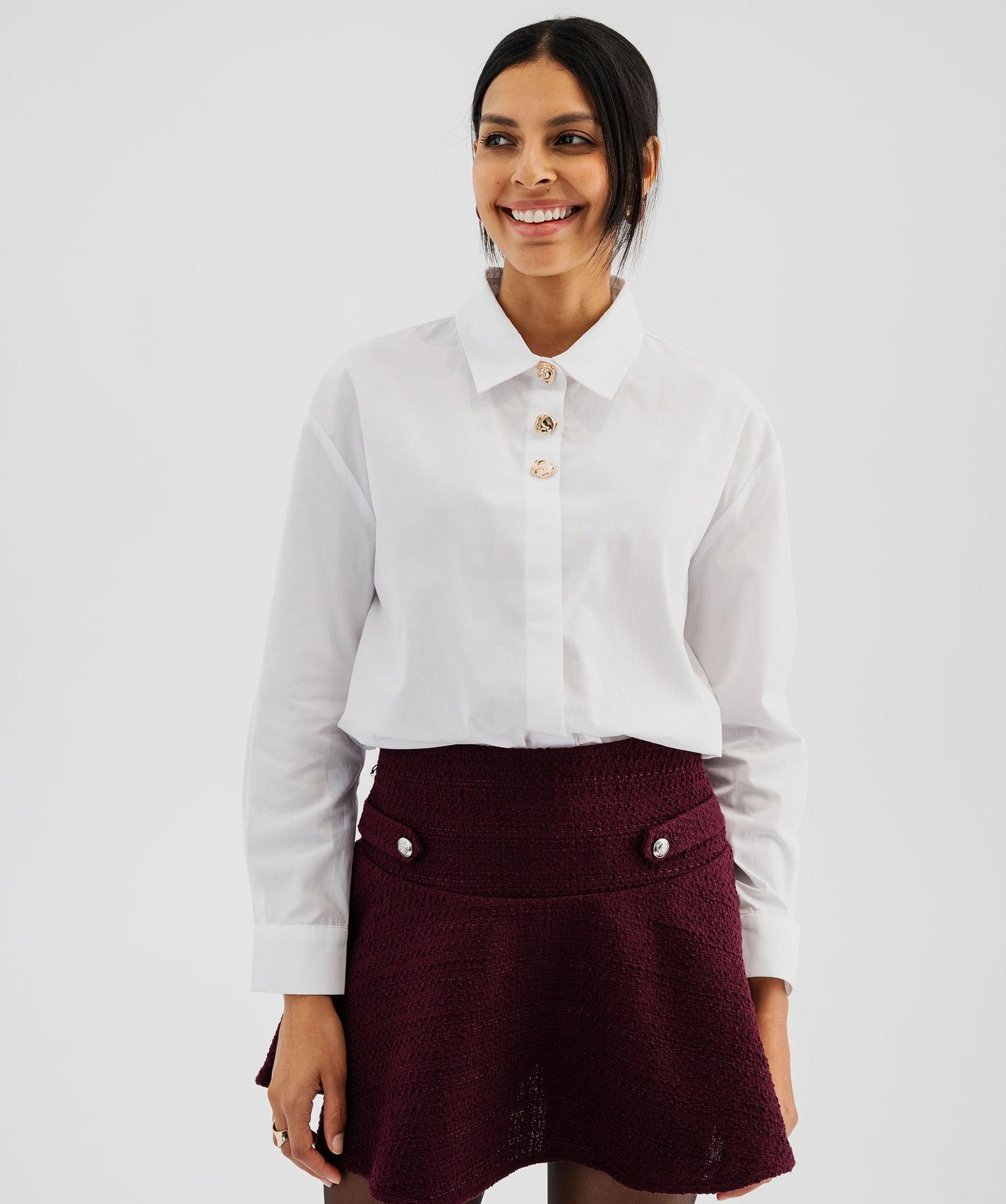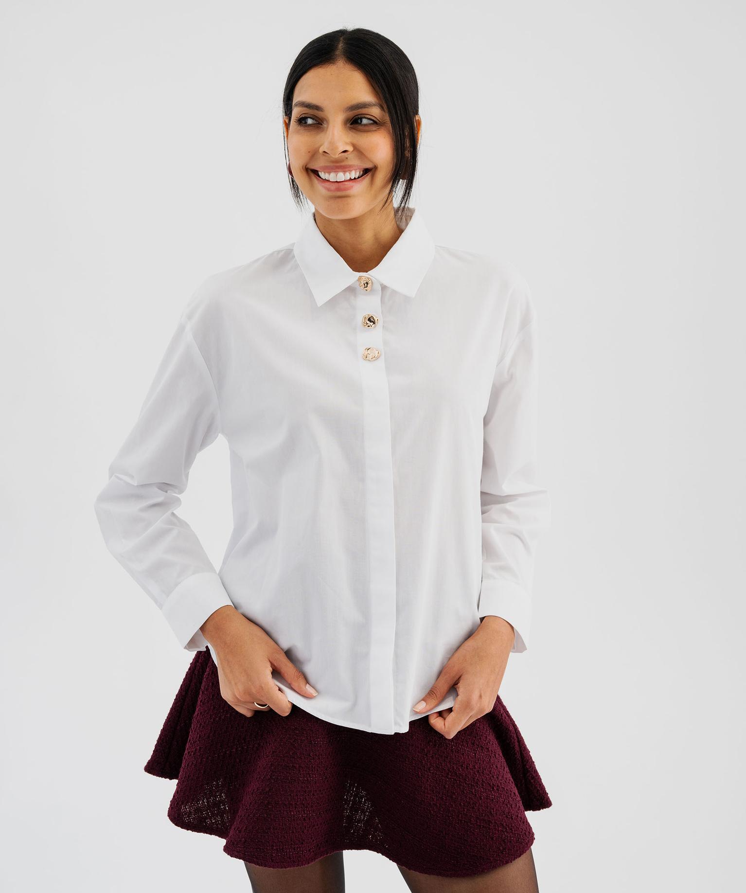 Redécouvrez la basique et indispensable chemise femme blanche avec une touche bijou qui change tout ! Sa coupe droite, son col classique et sa base arrondie en font un essentiel du dressing, facile à associer en toutes circonstances. Mais c’est sa boutonnière qui fait la différence : sous patte donc discrète sur toute la longueur, elle laisse apparaître sous le col trois gros boutons dorés, tel un pendentif ! Une note chic et inattendue qu’on retrouve aussi aux poignets, avec deux boutons assortis. 100 % coton, la chemise manches longues allie style, confort et raffinement.