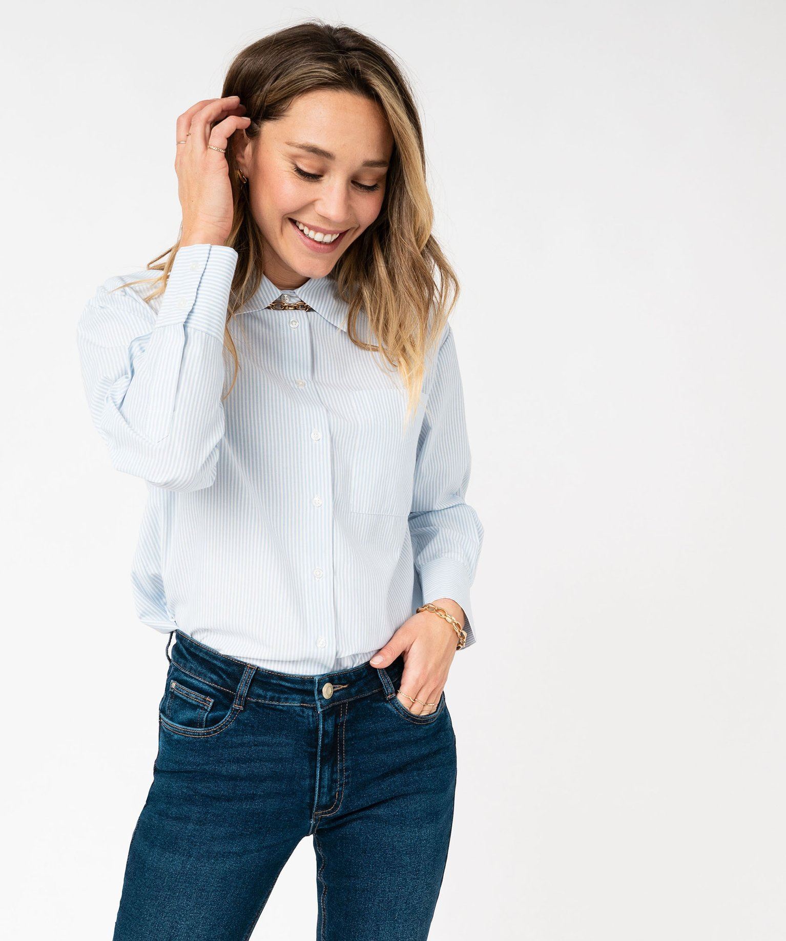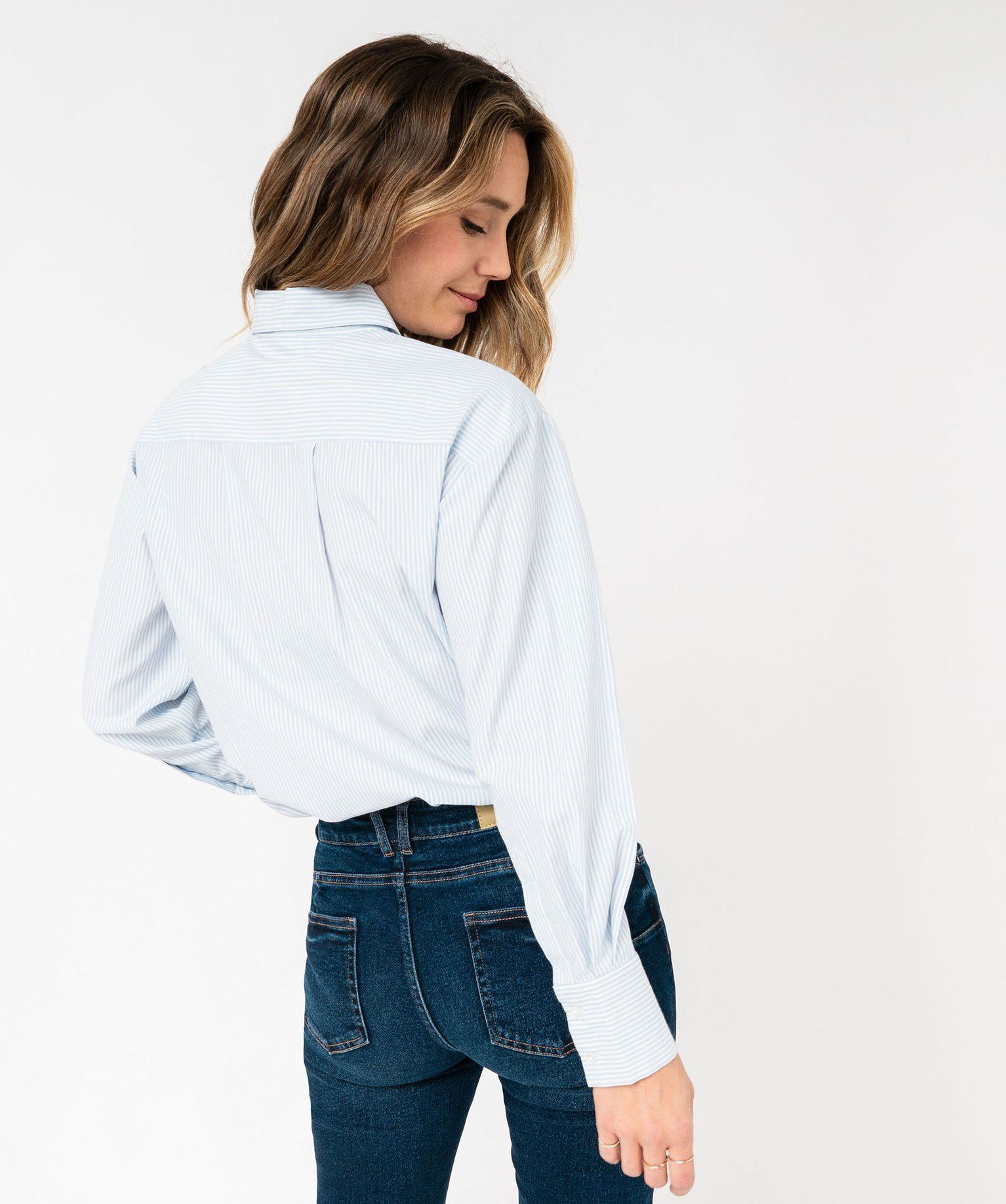 Craquez pour cet incontournable emprunté au vestiaire des hommes, la chemise à fines rayures. Une chemise femme à la coupe ample et confortable qui se porte aussi bien rentrée dans un pantalon de costume pour une allure élégante, que sur un jean pour un look plus décontracté. Elle possède une poche plaquée sur la poitrine et de larges biais aux poignets fermés par deux boutons. Pour offrir un maximum d’aisance, ce chemisier possède un large pli plat dans le dos. Bas arrondi.