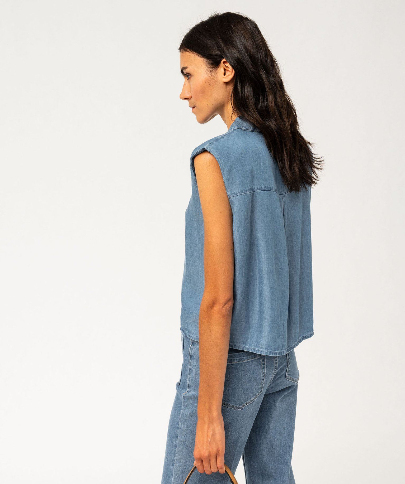 Une jolie chemise pour femme inspirée de la mode vintage avec sa coupe ample à nouer dans le bas, twistée par des détails résolument contemporains comme des épaulettes en mousse intégrées dans les épaules et une confection en Lyocell plus éco-responsable. Cette matière confectionnée à partir de fibres de bois offre un confort unique et une bonne régulation de la température. Cette chemise en Lyocell se ferme par une rangée de boutons aux reflets nacrés. Ce chemisier sans manches se porte avec un pantalon en toile et une paire de sandales plates. Pli creux dans le dos.