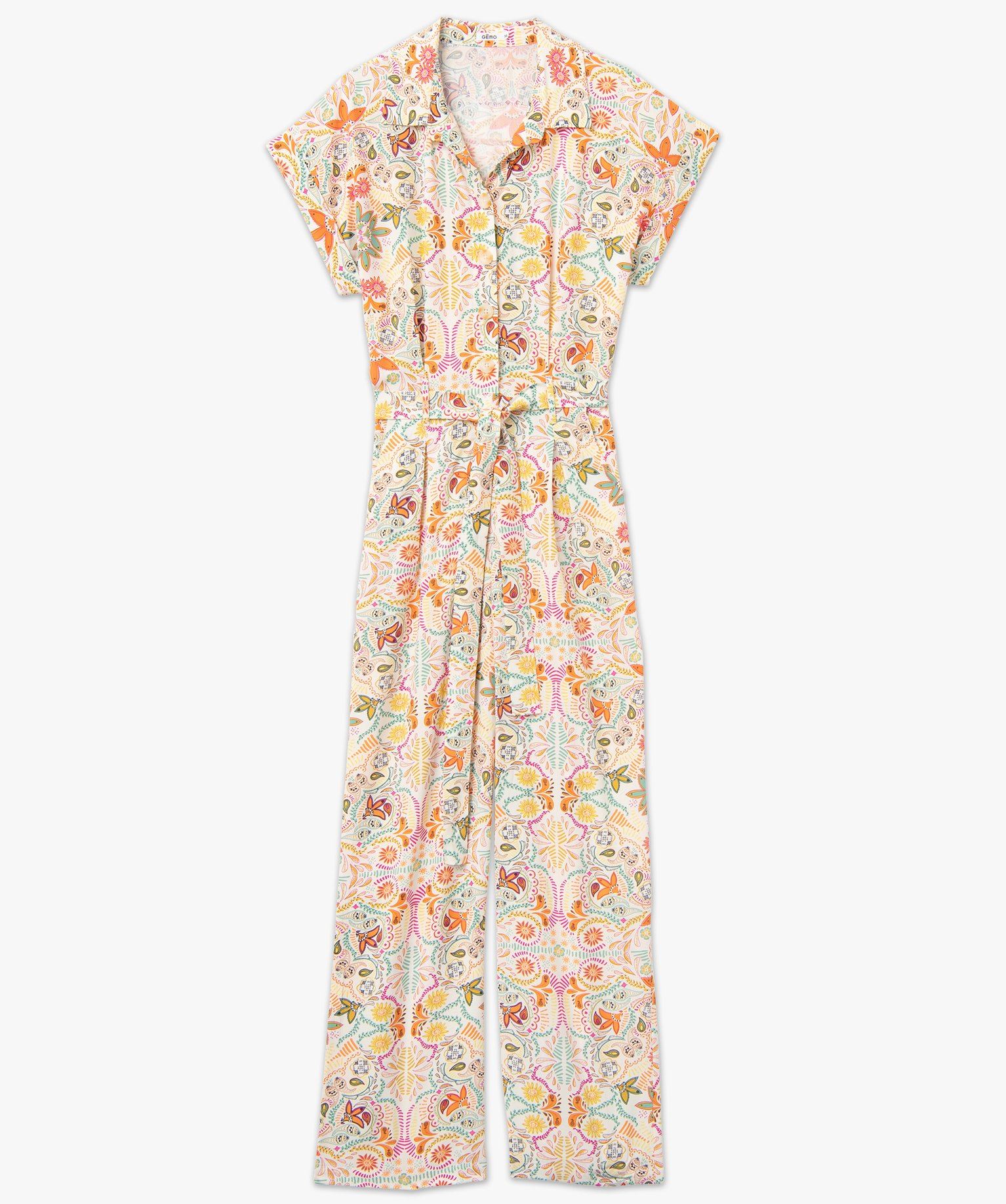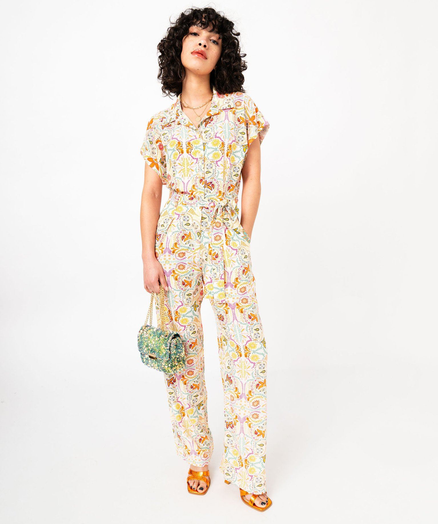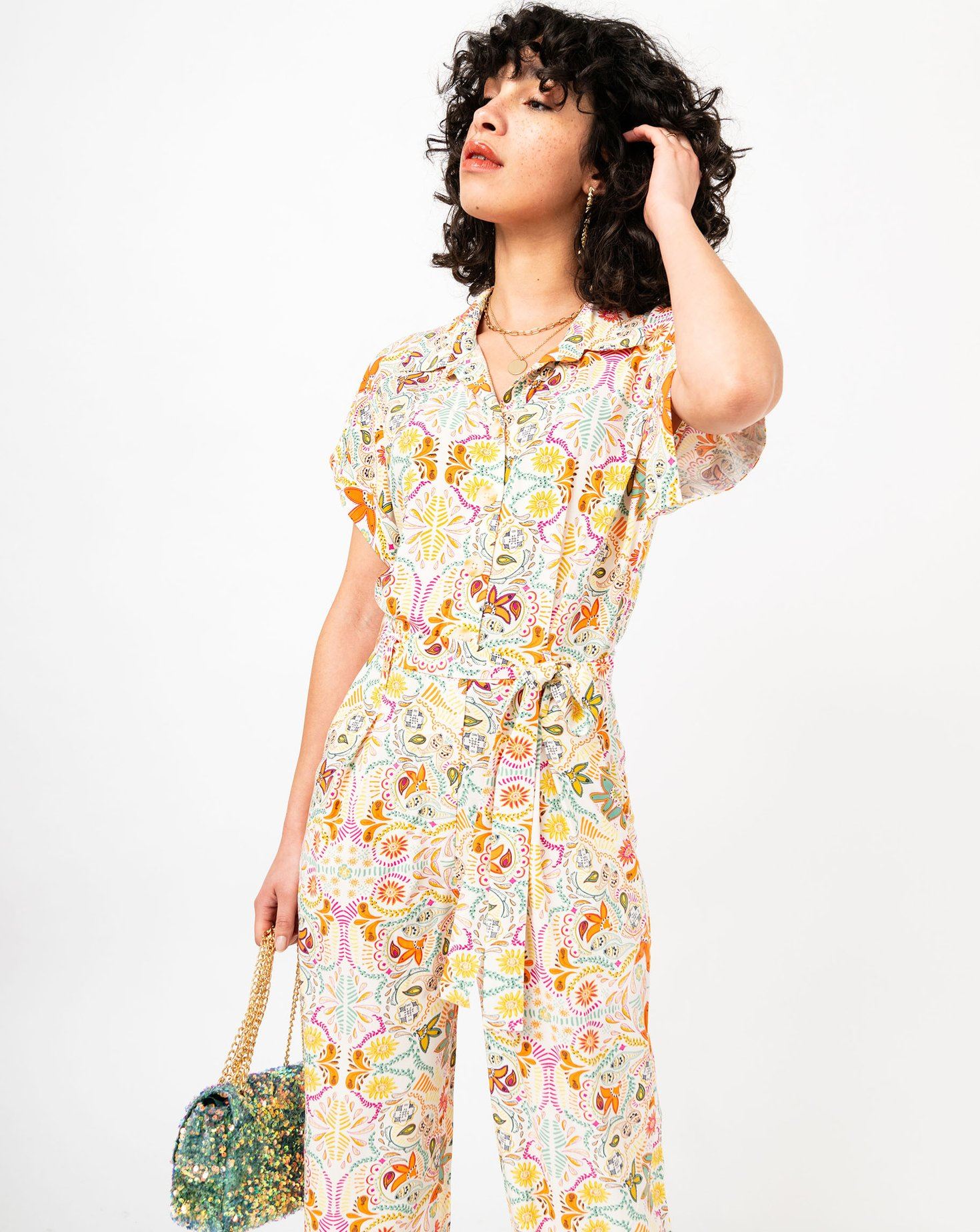 Vous allez succomber à l'élégance et au confort de cette superbe combinaison pantalon pour femme. Confectionnée dans une viscose fluide et parsemée de motifs fleuris d’inspiration exotique, elle apporter du dynamisme dans le dressing estival. Les manches courtes avec revers cousus, le col chemise et la fermeture par de gros boutons fantaisie ajoutent une touche décontractée. La partie pantalon présente une coupe ample, accentuée par des plis creux sur l'avant et des pinces discrètes à l'arrière, se fermant par un zip discret. La taille est joliment soulignée par une ceinture assortie à nouer, offrant une silhouette flatteuse et ajustée. Cette combinaison imprimée offre une élégance décontractée, pouvant être associée aussi bien à des baskets qu’à des sandales à semelle en corde. Deux poches latérales.