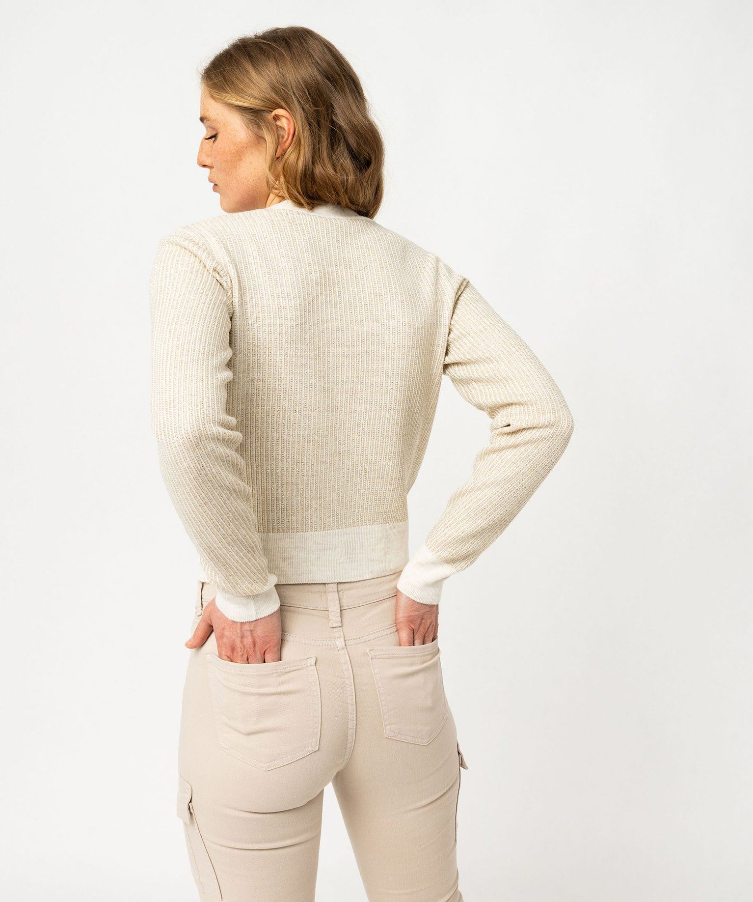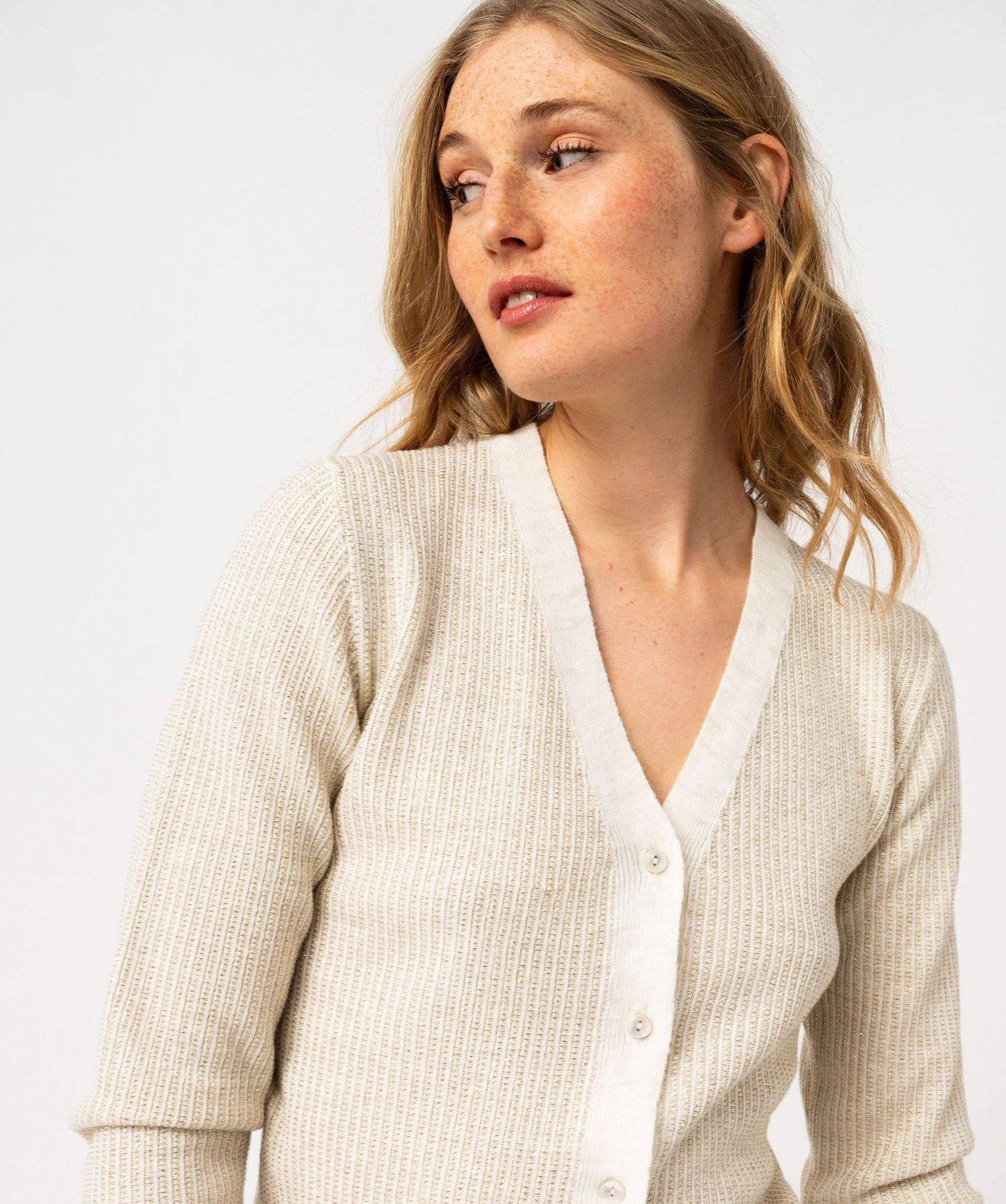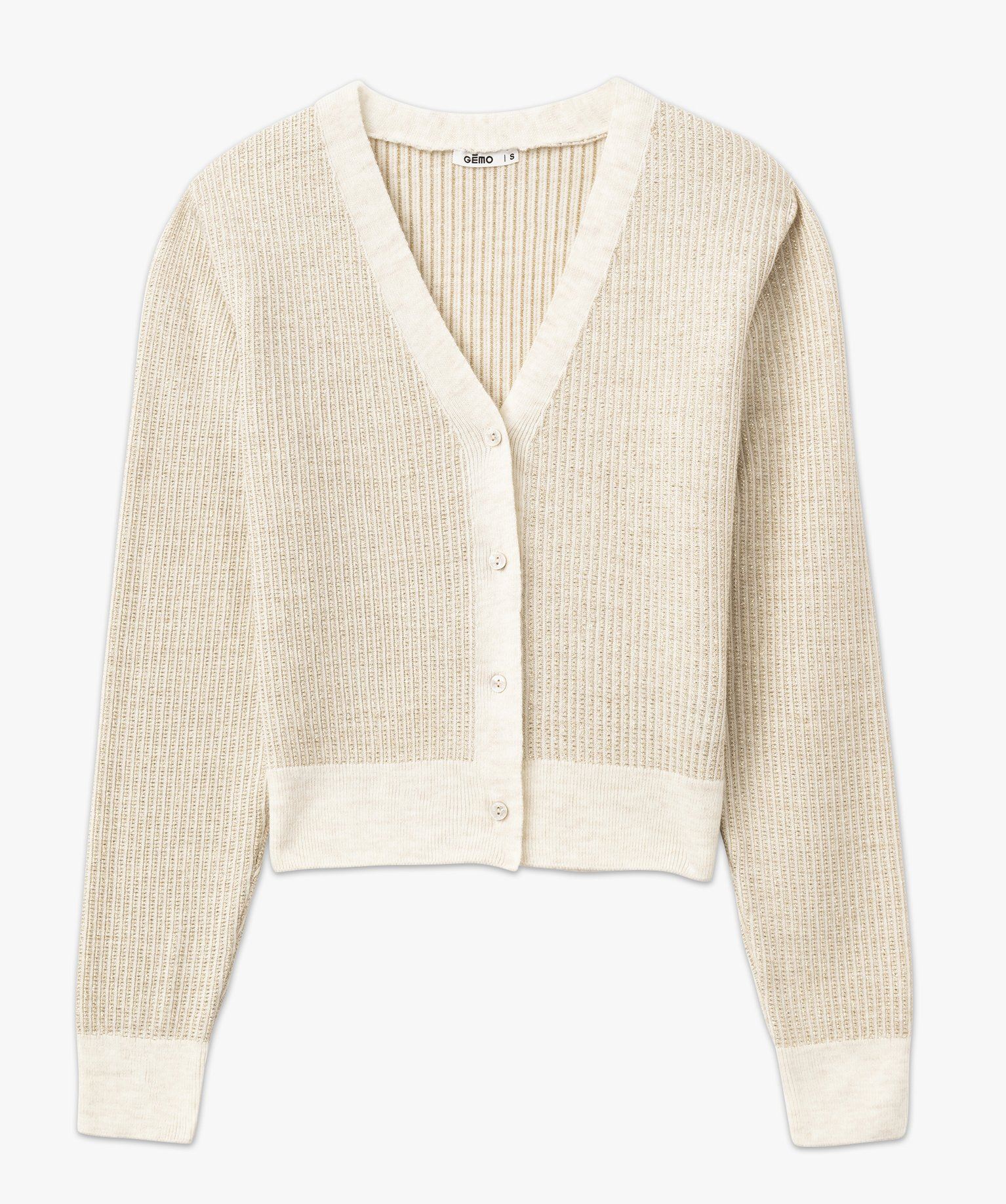Ce gilet en maille scintillante est l’option idéale pour réchauffer les tenues tout en leur apportant une touche de brillance. Un gilet femme dont la coupe courte est rythmée par de larges bandes unies sur le col, dans le bas et aux poignets. Il se ferme par quatre petits boutons aux reflets nacrés. Un gilet court qui accompagnera parfaitement un pantalon taille haute.