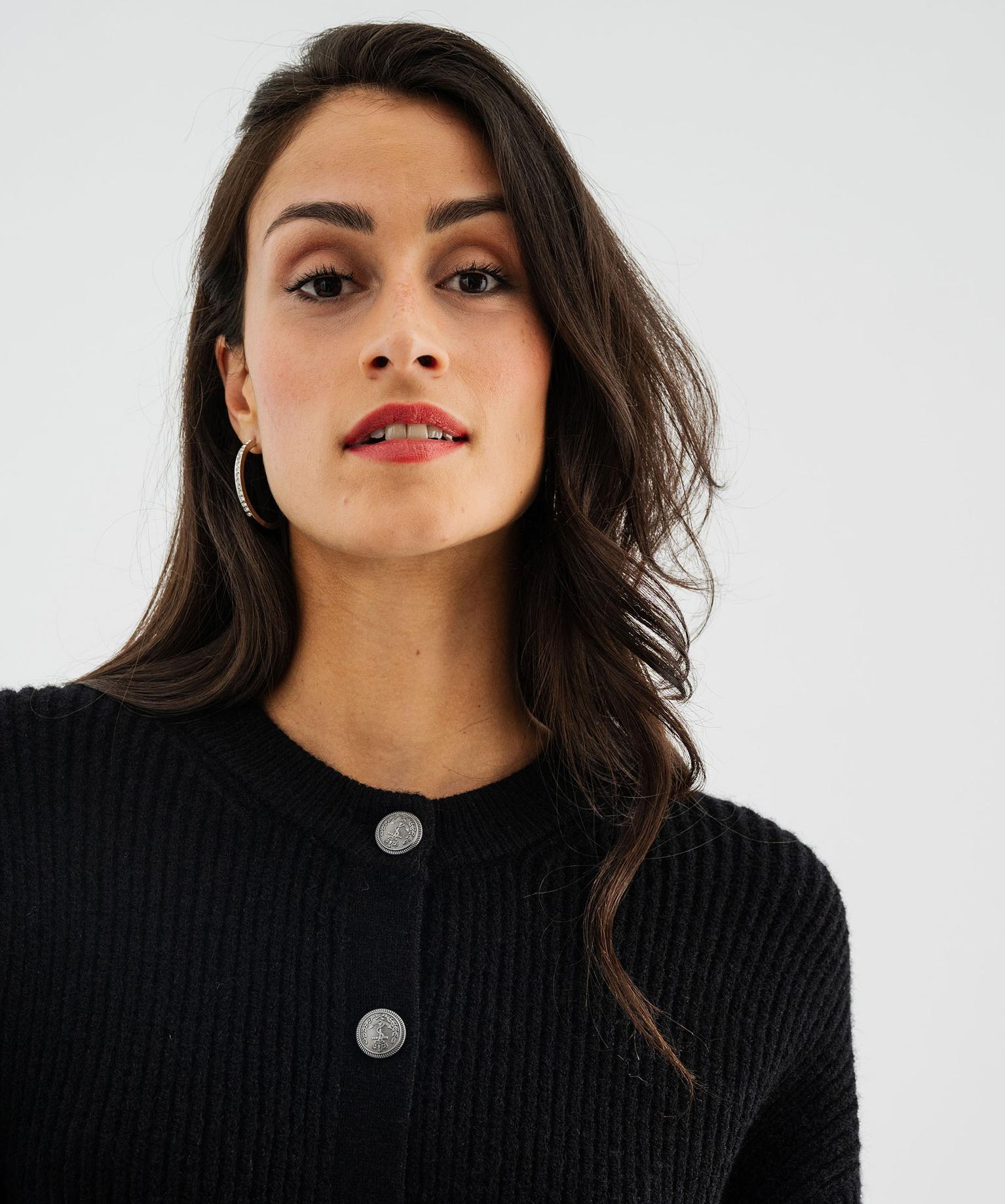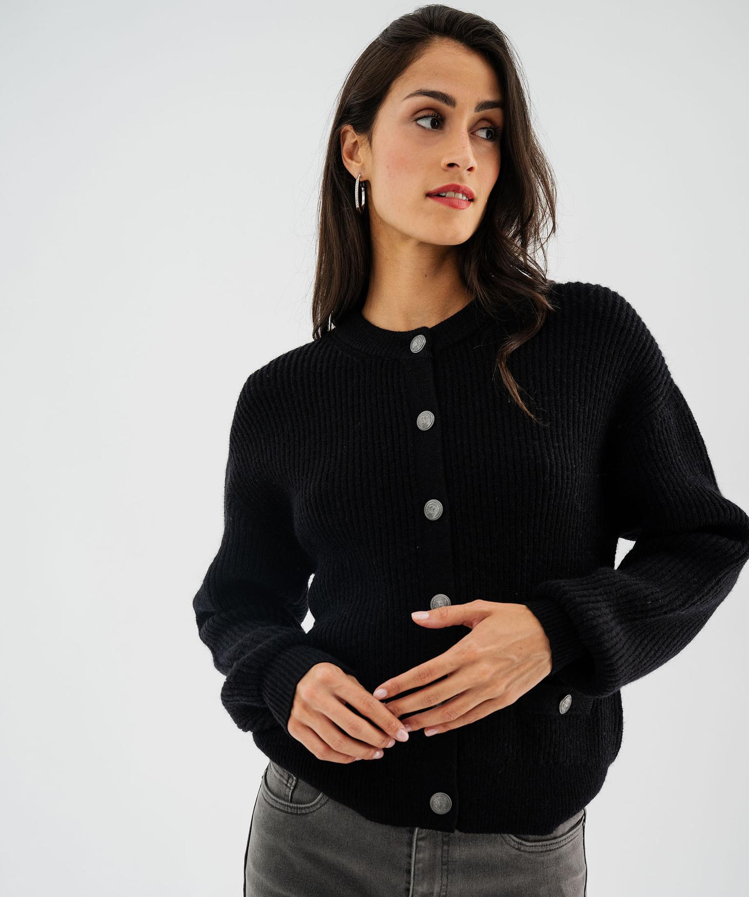 Adoptez la tendance cocooning avec ce gilet en grosse maille côtelée extensible. Son col rond, ses fausses poches devant et ses boutons gravés ancres marines apportent une touche classique et chic. En bon basique revisité dans une maille fantaisie, le gilet femme est parfait pour se réchauffer les tenues tout en restant stylée. Il se porte facilement avec tout : du jean cropped casual à la jupe droite élégante.