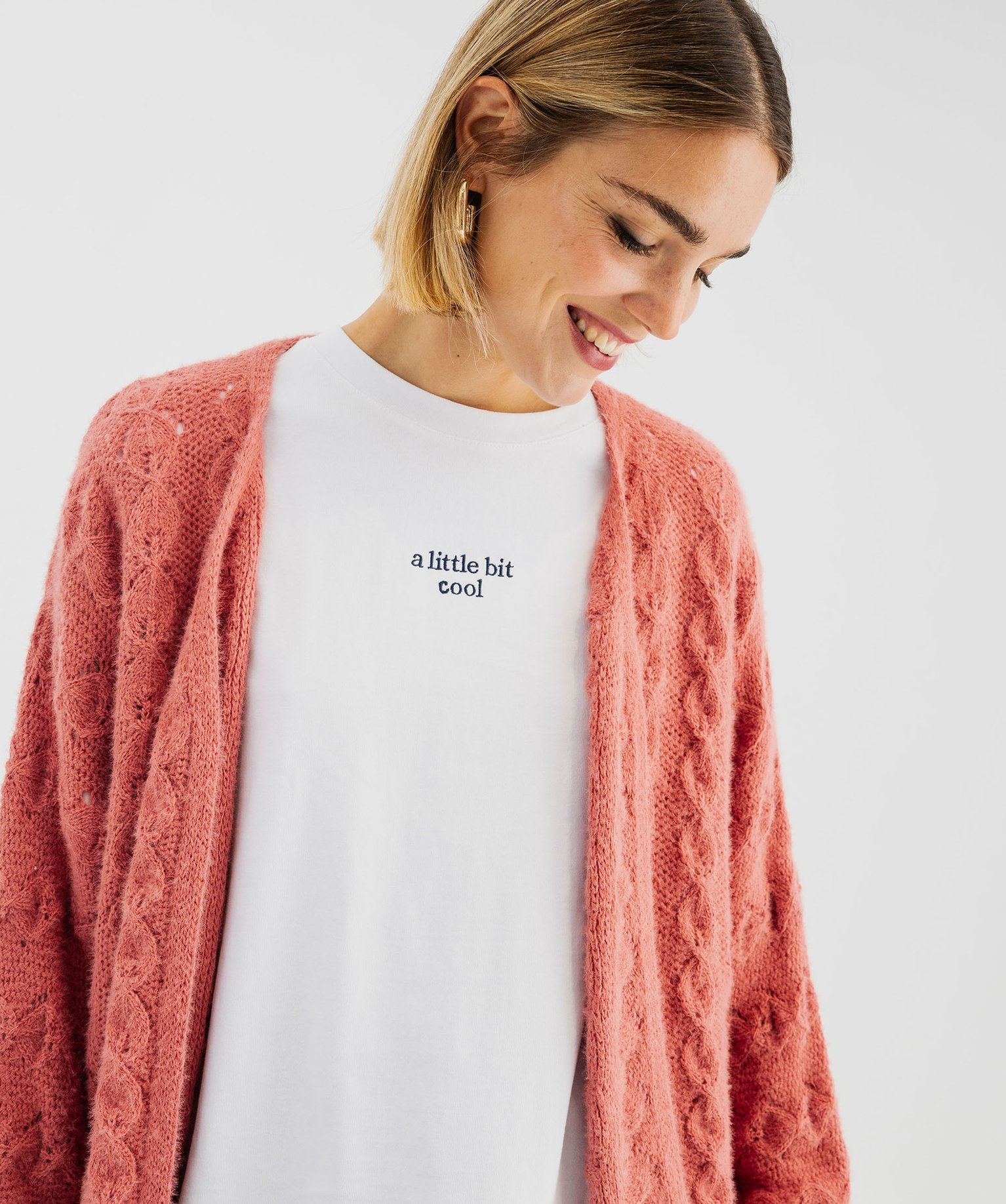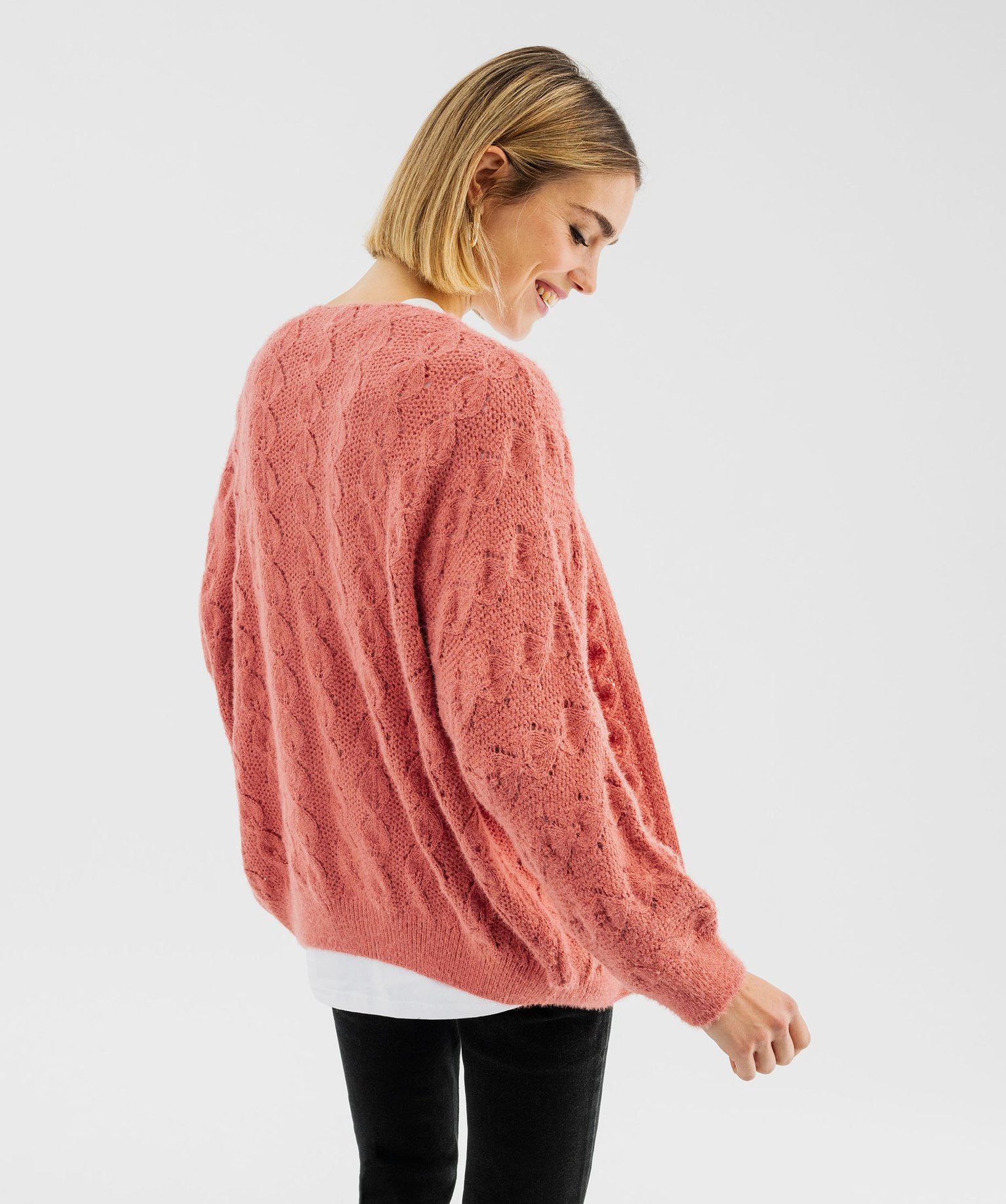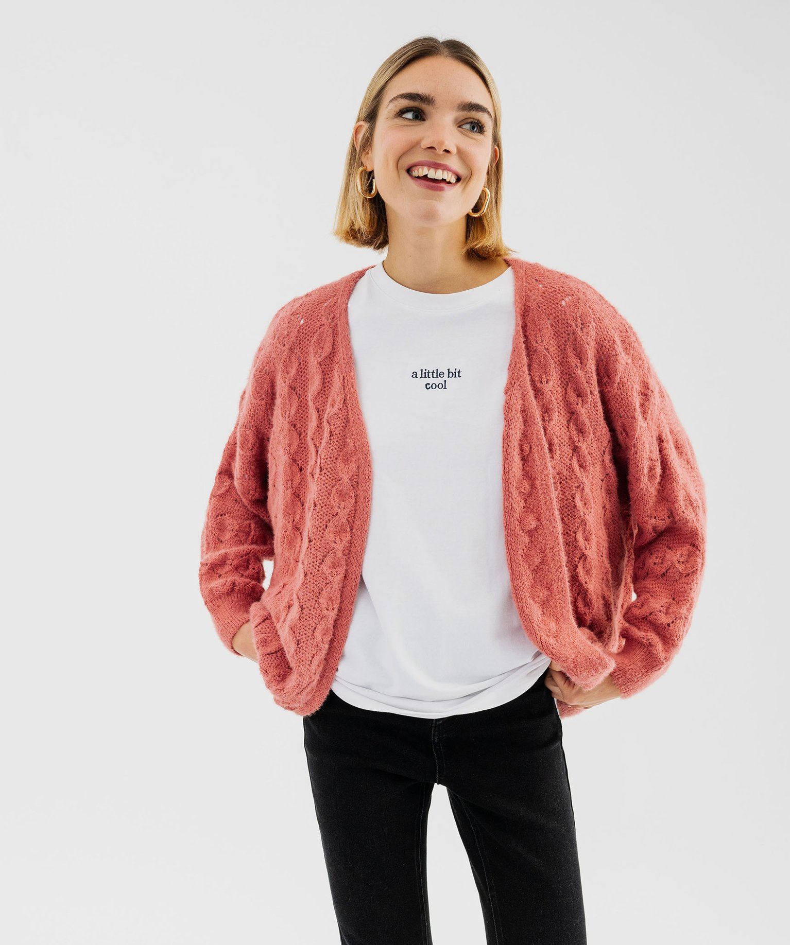 Ajoutez une touche de fémininité tout en décontraction avec ce charmant gilet loose ! Le gilet femme est réalisé dans une maille fantaisie ajourée et légèrement duveteuse, à l'aspect aussi élégant et que raffiné. Sans boutons et assez ample, il se porte ouvert sur une robe ajustée, une chemise ou un tee-shirt rentré dans une ceinture. Pas de coutures aux emmanchures. Finition côtelée aux poignets et dans le bas.