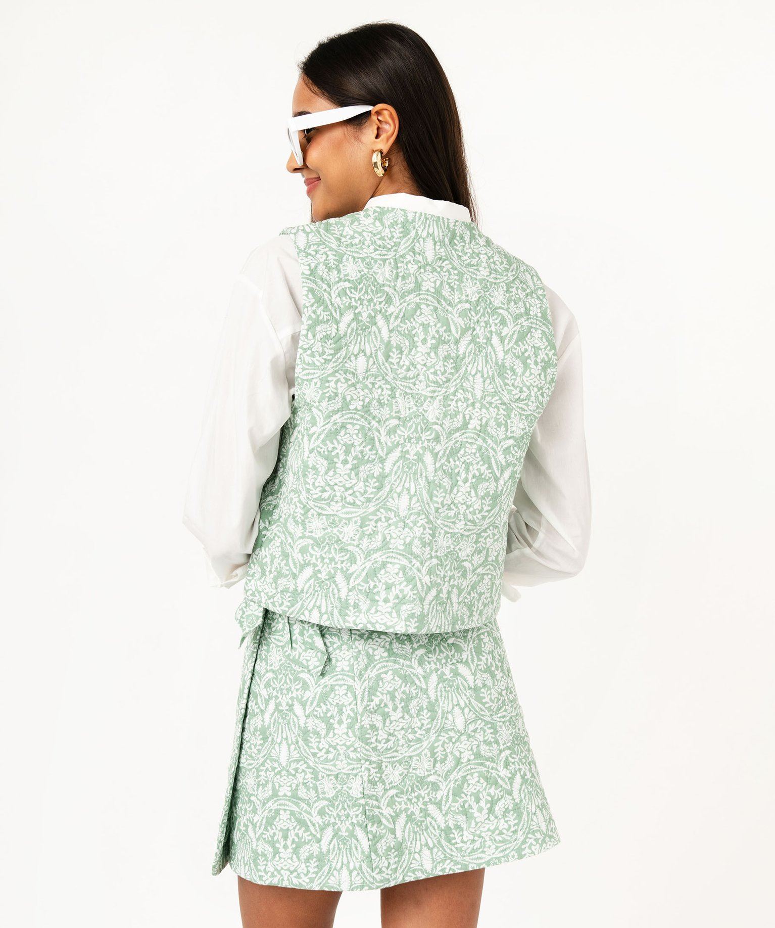 Ce gilet sans manches réchauffera toutes les tenues de la saison en leur ajoutant une touche élégante et romantique. Confectionné en matière matelassée, ce gilet pour femme séduit par ses couleurs tendres et ses jolis motifs fleuris. Il est doté d’un col rond et de larges emmanchures lui permettant d’être porté aussi bien sur une chemise que sur un pull. Il se porte ouvert ou fermé à l’aide d’une broche. Ce gilet matelassé se porte en version chic avec la jupe coordonnée ou en version plus cool avec un tee-shirt et un jean.