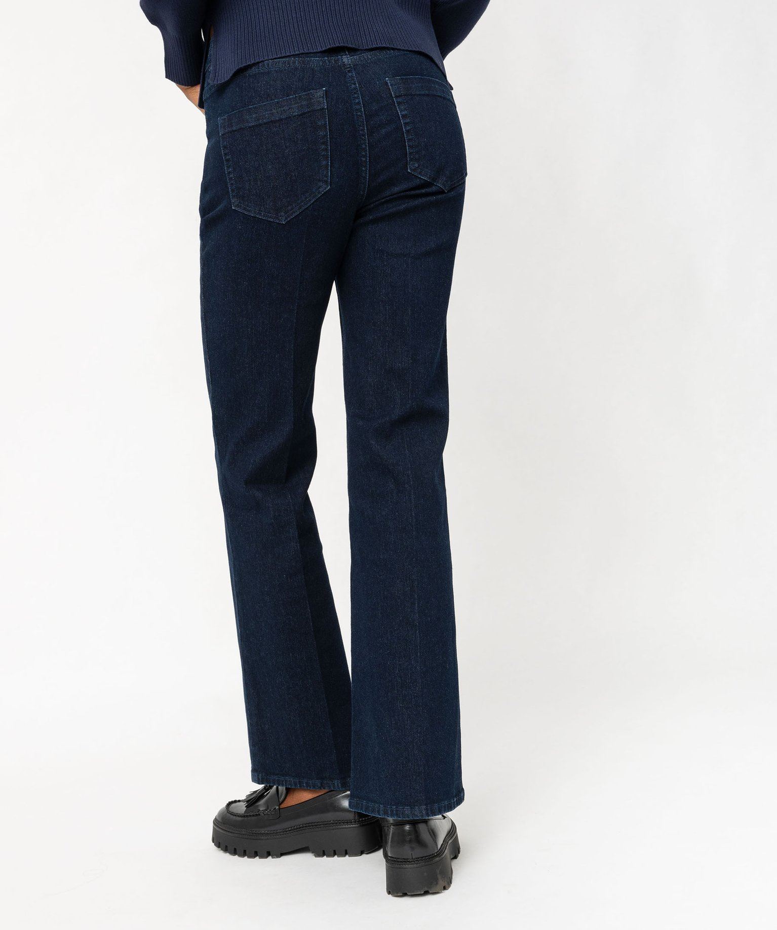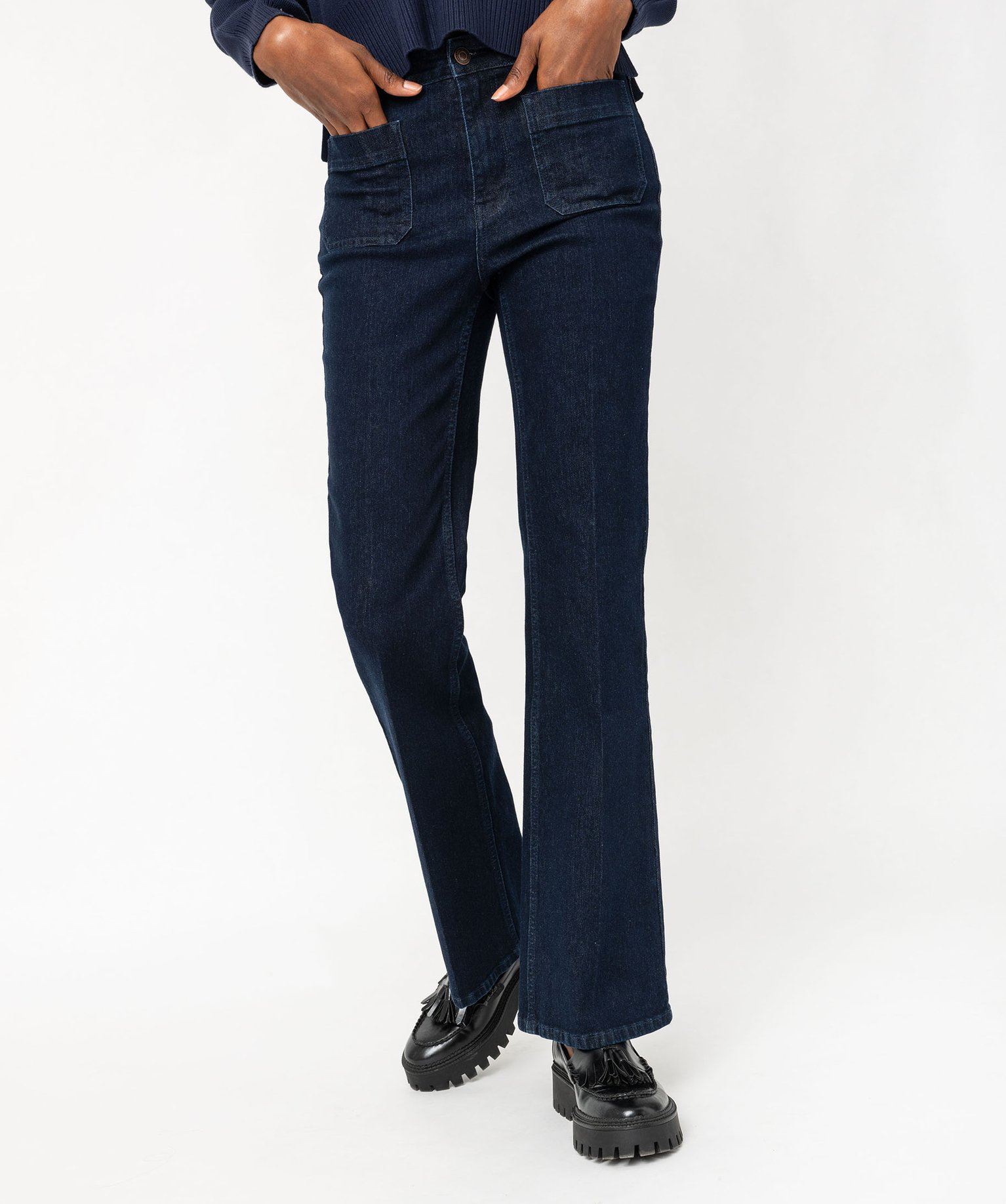 Ce jean femme vous promet un véritable flash-back dans les années 70 ! Un jean flare doté de poches plaquées sur l’avant et sur l’arrière, dont la taille haute permettra de mettre la silhouette en valeur. Confectionné dans une toile denim extensible, il offre beaucoup de confort. Un jean large à porter avec une blouse fleurie et des boots à talon pour un look 100% vintage ou avec un tee-shirt uni et des baskets. Fermeture zip et bouton.