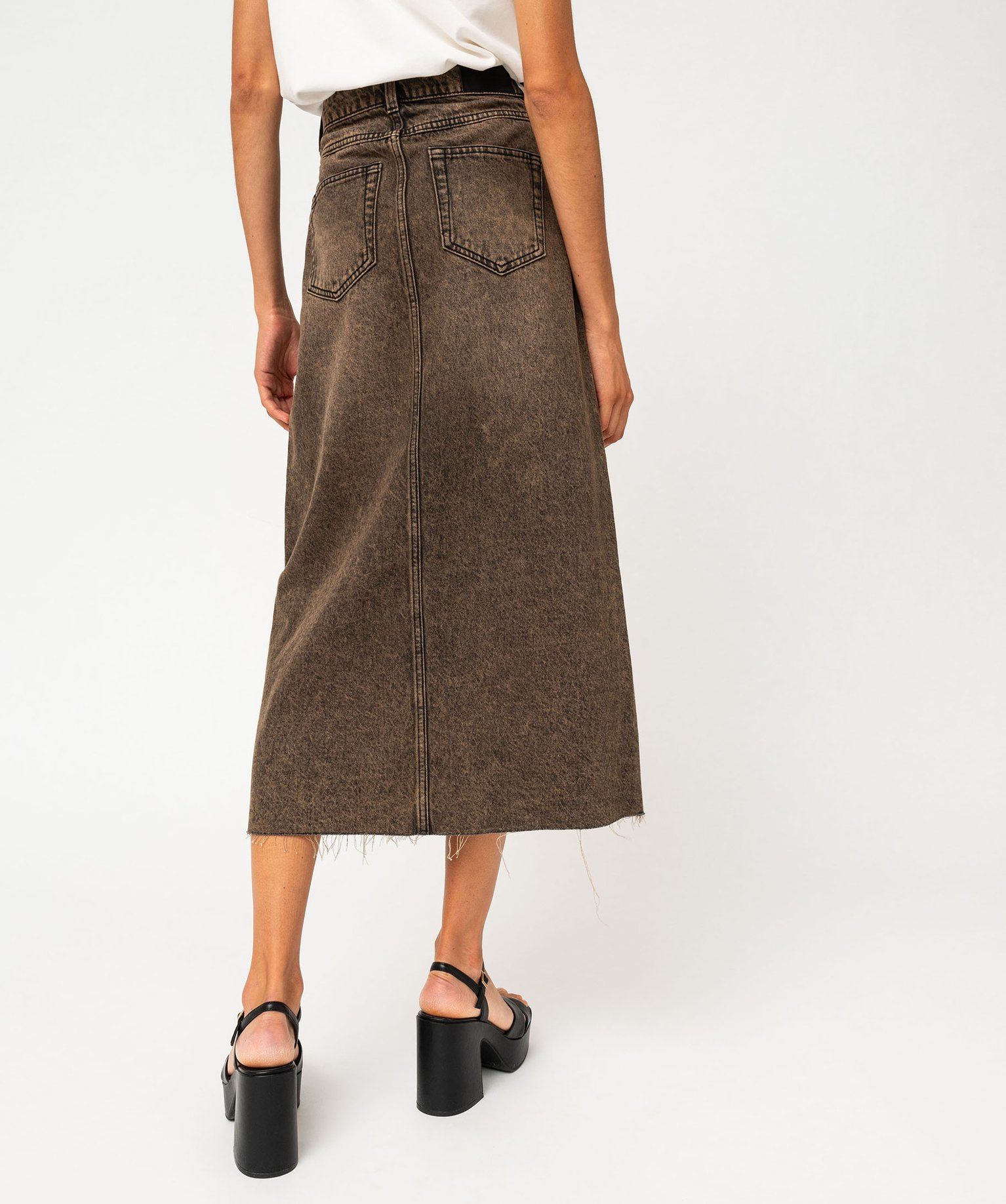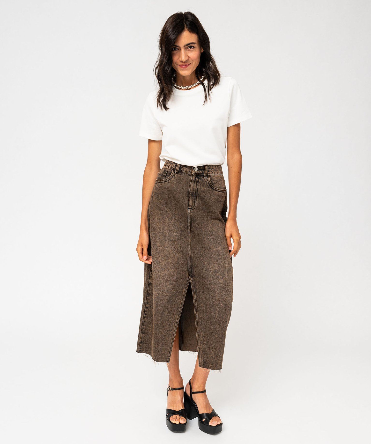 La jupe en jean se présente en version longue avec une large fente à l’avant. Elle arbore une teinte délavée originale et des finitions à bords francs en bas, lui donnant un style décontracté. Cette jupe pour femme respecte les codes du denim avec ses doubles surpiqûres, ses trois poches à l’avant, ses deux poches plaquées à l’arrière et sa fermeture éclair avec bouton. Une jupe longue fendue idéale à porter avec un sweat et des baskets à plateforme. Elle est également dotée de passants pour ceinture.