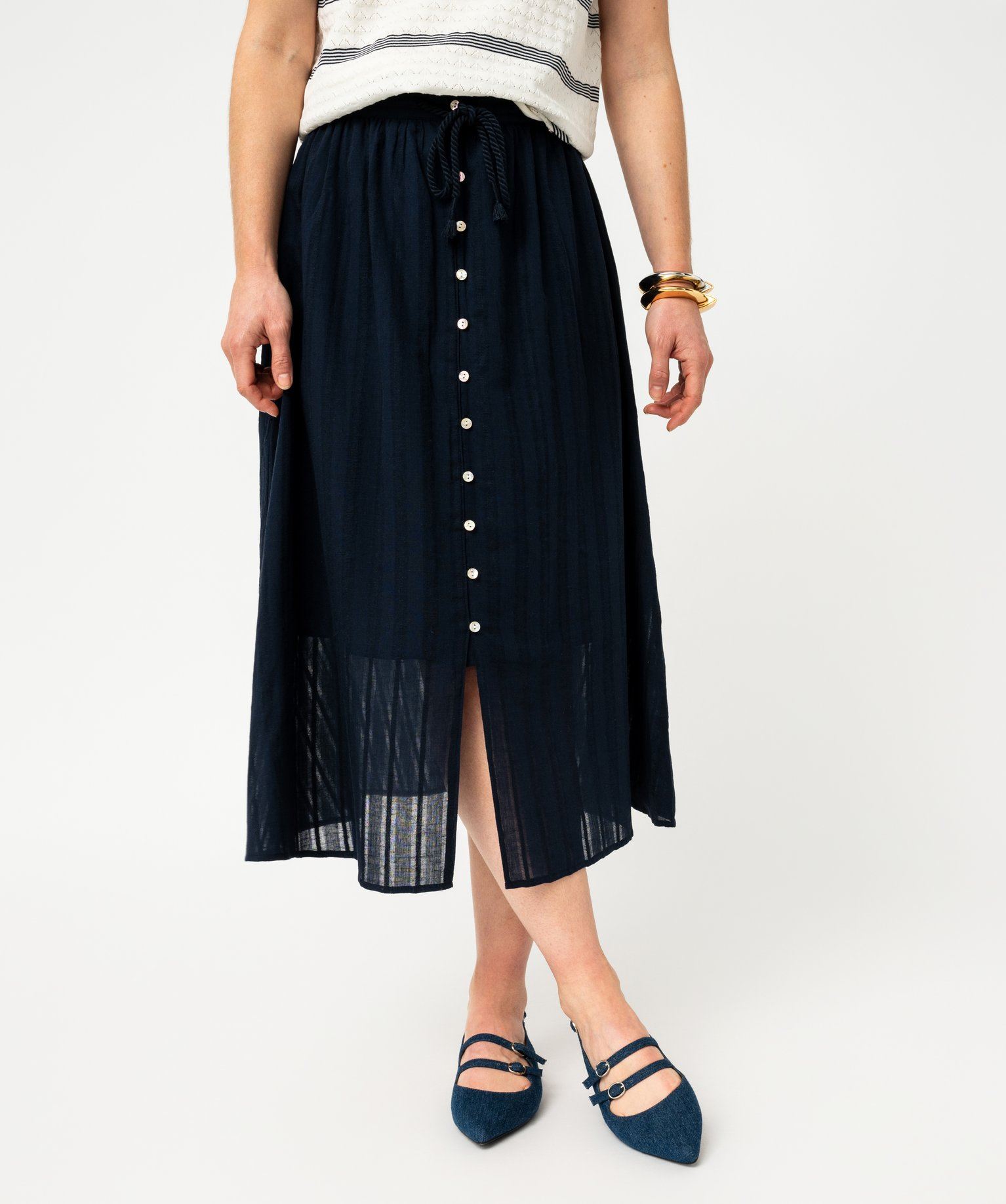 L'indémodable jupe midi se décline ici dans une toile légère de coton et de lin mélangés, pour un résultat aérien et casual chic. Un modèle facile à porter, signé LuluCastagnette. La jupe femme présente une ravissante boutonnière en nacre et de gros cordons à nouer sur l'avant. Le dos de la jupe est élastiqué pour un confort optimal. On note le petit effet rayé ton sur ton apporté par le tissage de la maille. Doublure intérieure.