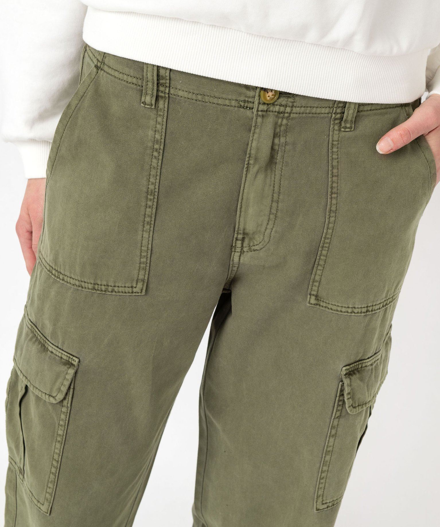 Craquez pour l’allure décontractée de ce pantalon pour femme. Un pantalon cargo en coton qui doit tout son style à ses nombreuses poches : deux poches plaquées sur l’avant, deux au dos et deux poches à rabat sur les cuisses fermées par un bouton pression. Un pantalon à marier avec un débardeur et des sandales pour un look estival ultra tendance. Fermeture par zip et bouton. Passants pour ceinture.