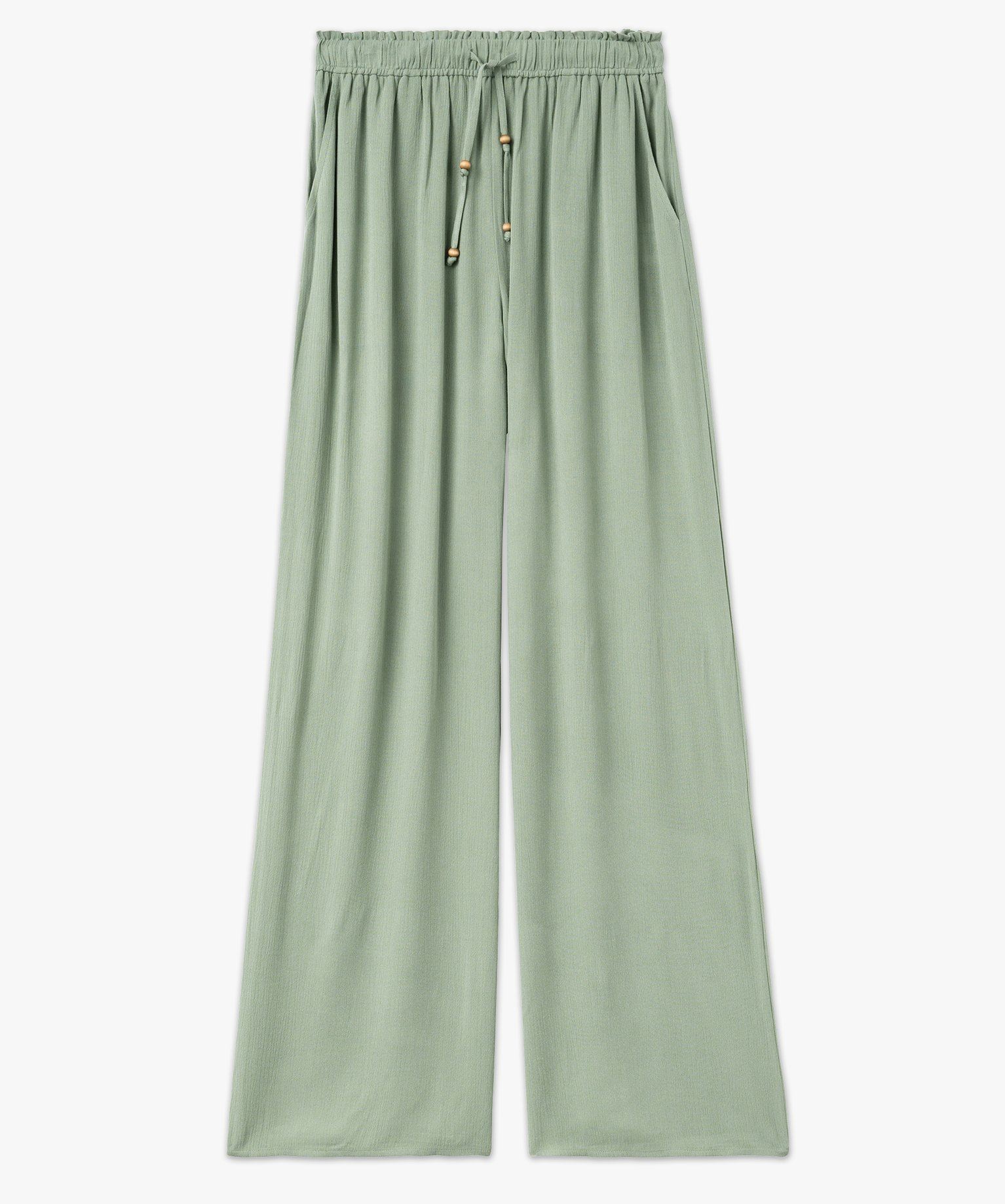 Ce pantalon fluide allie le confort d’une matière viscose ultra douce à une coupe ample très confortable. On craque pour son aspect légèrement froissé qui lui confère une élégance décontractée. Ce pantalon femme possède une taille élastiquée froncée ajustable par cordon coulissant orné de petites perles. Un pantalon large à porter sans modération, avec un tee-shirt et des sandales pour un style bohème ou avec une blouse et des sandales à talon pour une allure plus chic. Deux poches latérales.