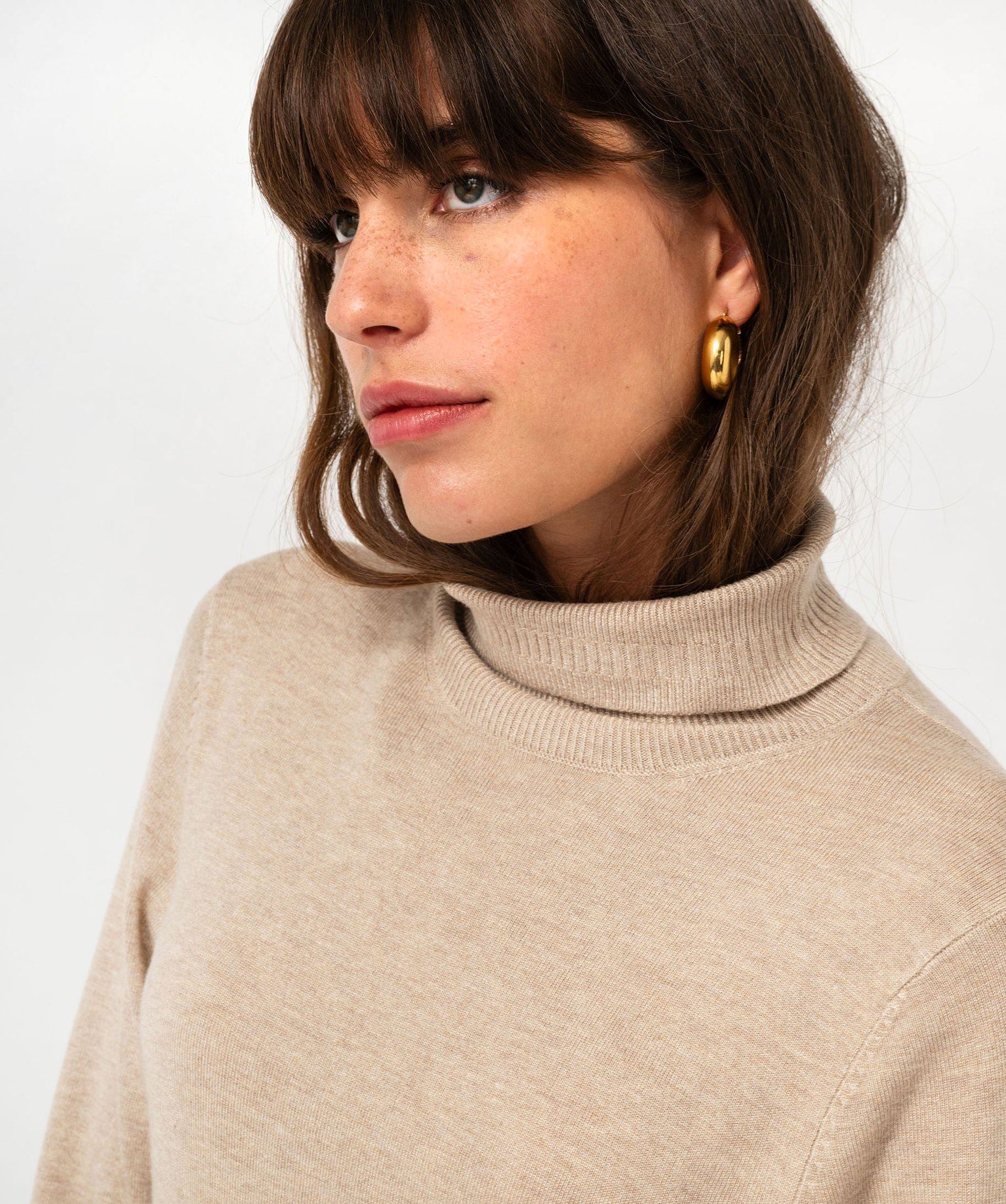 Le pull en maille fine fait partie des indispensables de la garde-robe des femmes élégantes. Confectionné à partir de viscose, il offre une grande douceur et un confort exceptionnel. Ce pull femme se porte dès l’intersaison, seul ou sous un blaser pour un style chic. Ce pull à col roulé est doté de finitions en maille fantaisie au bord du col, dans le bas et aux poignets. De petits boutons métalliques et une petite fente ajoutent une touche de raffinement supplémentaire sur les poignets.