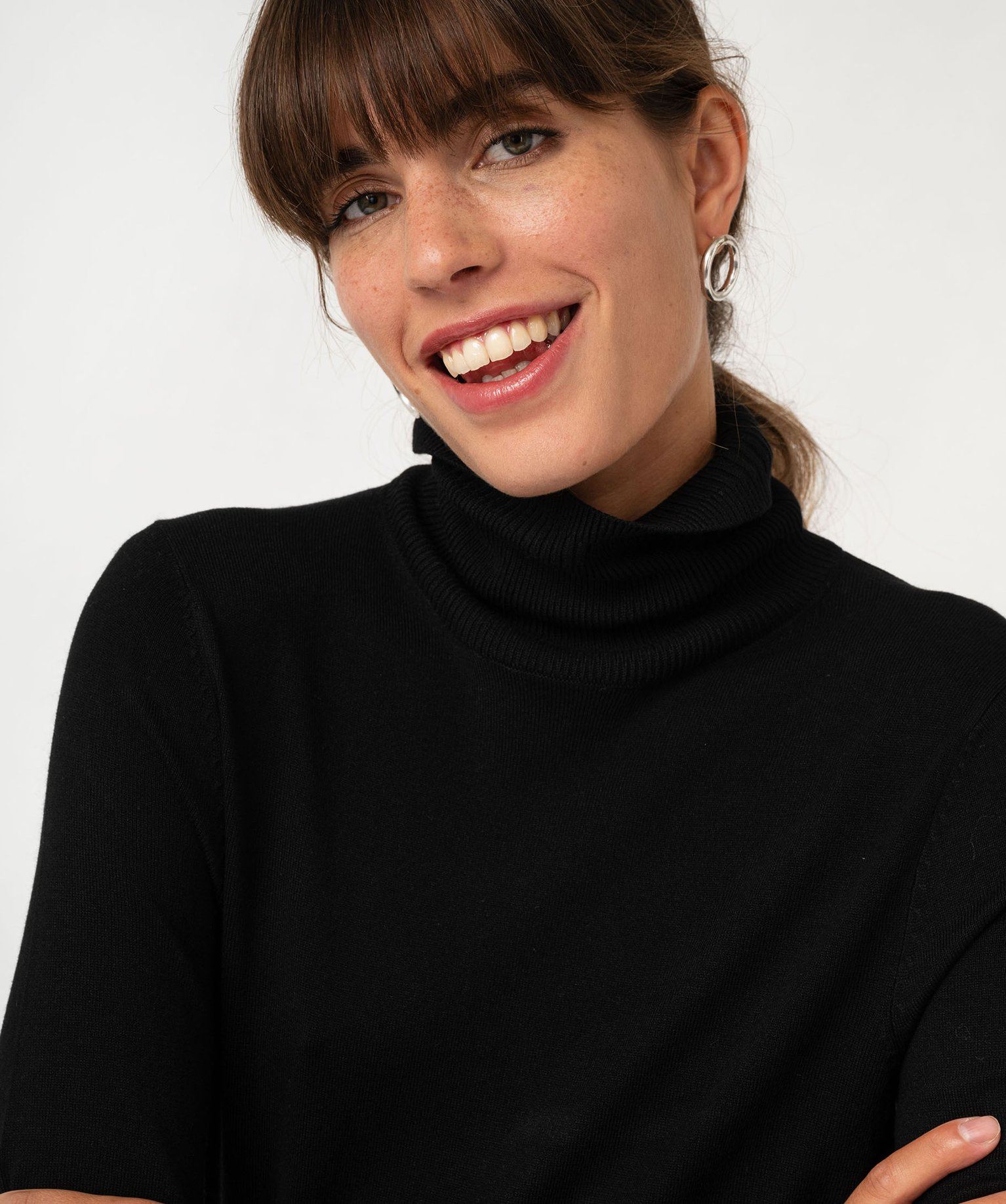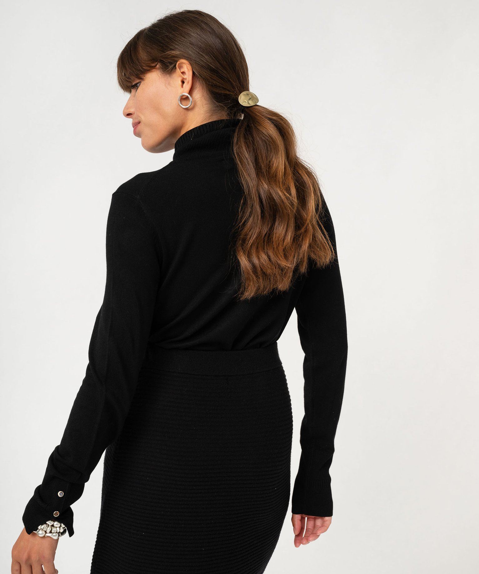 Le pull en maille fine fait partie des indispensables de la garde-robe des femmes élégantes. Confectionné à partir de viscose, il offre une grande douceur et un confort exceptionnel. Ce pull femme se porte dès l’intersaison, seul ou sous un blaser pour un style chic. Ce pull à col roulé est doté de finitions en maille fantaisie au bord du col, dans le bas et aux poignets. De petits boutons métalliques et une petite fente ajoutent une touche de raffinement supplémentaire sur les poignets.