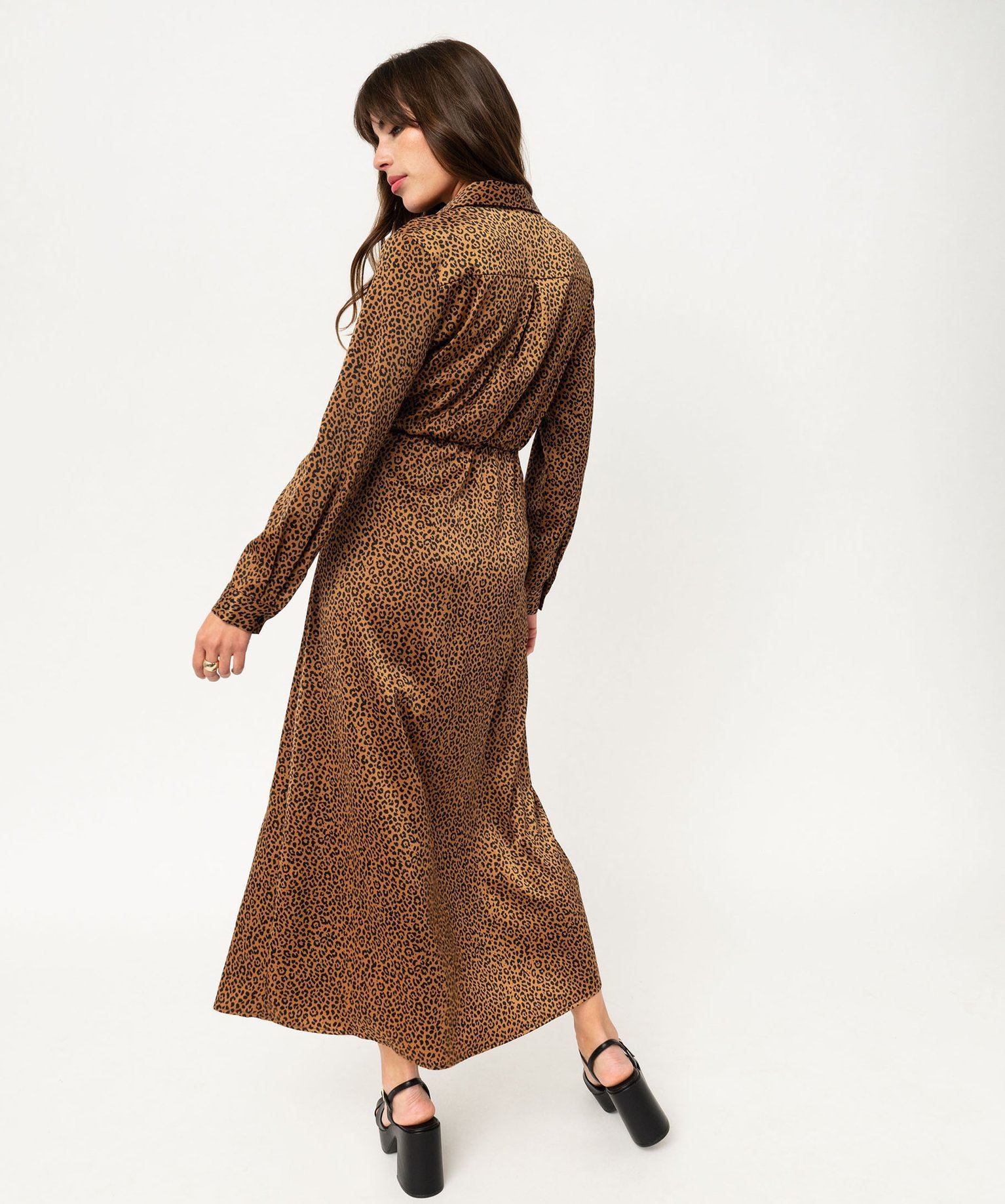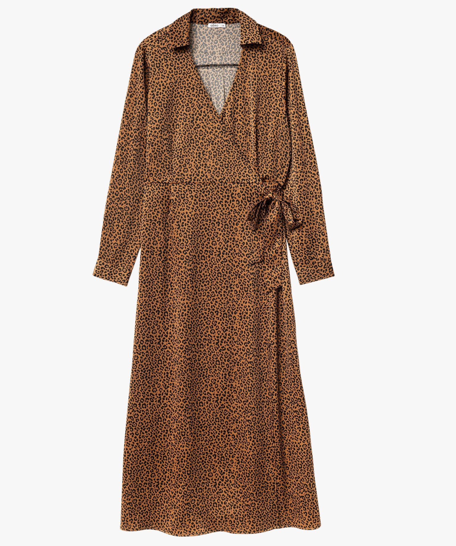 Ajoutez une touche d’audace dans votre garde-robe avec cette sublime robe longue à motif léopard. Une robe portefeuille confectionnée dans une maille satinée ultra douce, offrant de subtils reflets. Cette robe femme est dotée d’un col chemise et d’un décolleté cache-coeur fixé par un bouton à l’intérieur et des liens à nouer à la taille. La partie jupe offre une grande aisance de marche grâce à ses deux pans croisés. Une robe élégante à porter au quotidien avec une paire de basket ou comme robe de soirée avec des escarpins à talon. Ceinture élastiquée au dos. Pli creux dans le dos. Poignets fermés par un bouton.