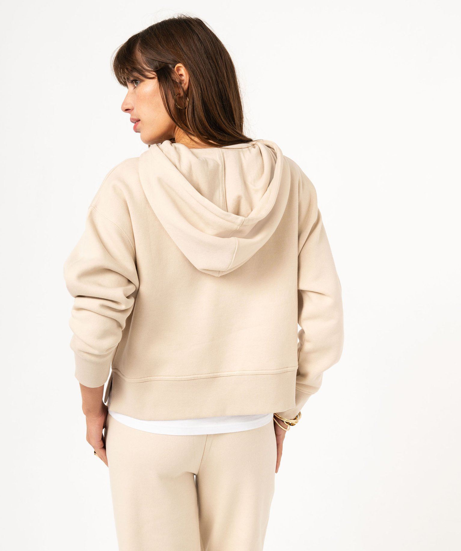 Le célèbre sweat à capuche s’affiche dans une version à la fois plus ample et plus courte pour coller à la tendance du moment. Ce sweat femme est agrémenté d’une inscription brodée en fil scintillant sur la poitrine et d’un cordon incrusté de fil pailleté. Son intérieur molletonné et sa capuche doublée jersey assurent un confort unique. Ce sweat court se porte avec un jean slim taille haute et une paire de baskets. Bas fendu sur les côtés.
