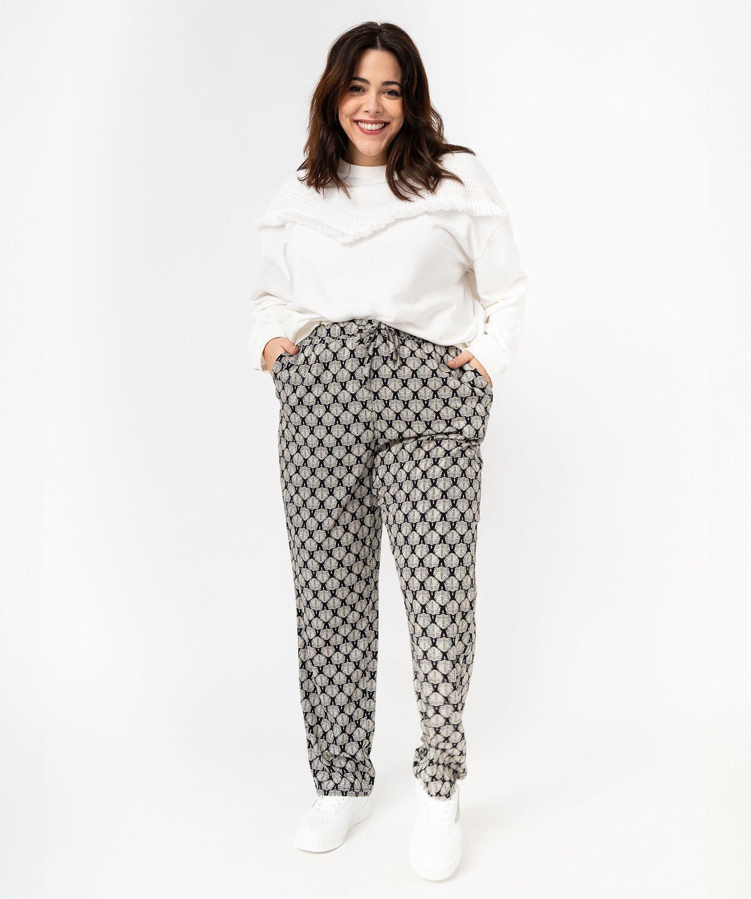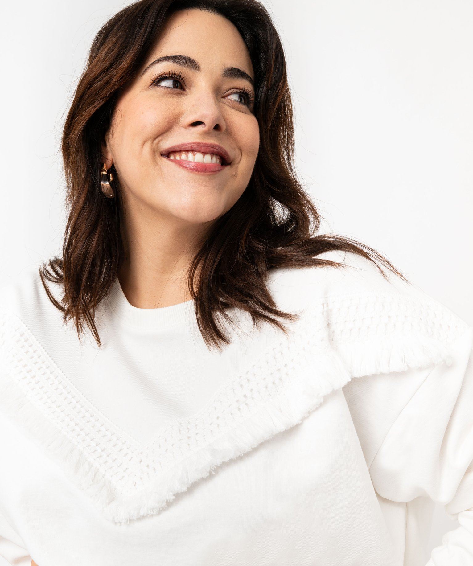 Ajoutez une touche boho dans votre collection de sweat avec ce modèle original rehaussé d’une bande en forme de V sur la poitrine, aspect macramé et bordée de petits pompons. Un sweat pour femme grande taille (du 46/48 au 54/56) à la coupe loose ultra confortable et totalement dans la tendance. Léger, grâce à son intérieur bouclette non molletonné, ce sweat brodé sera le meilleur allié d'un jean flare.