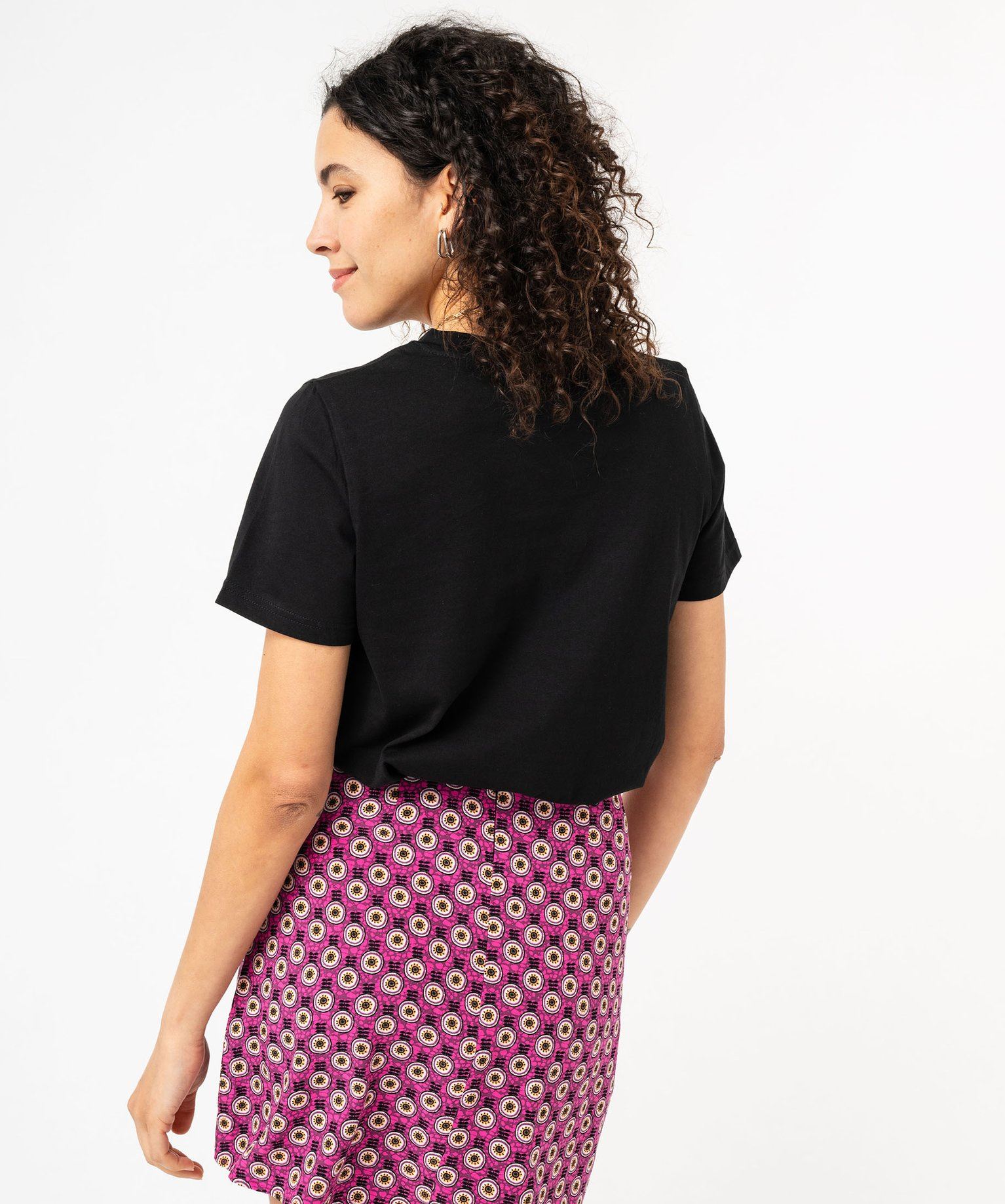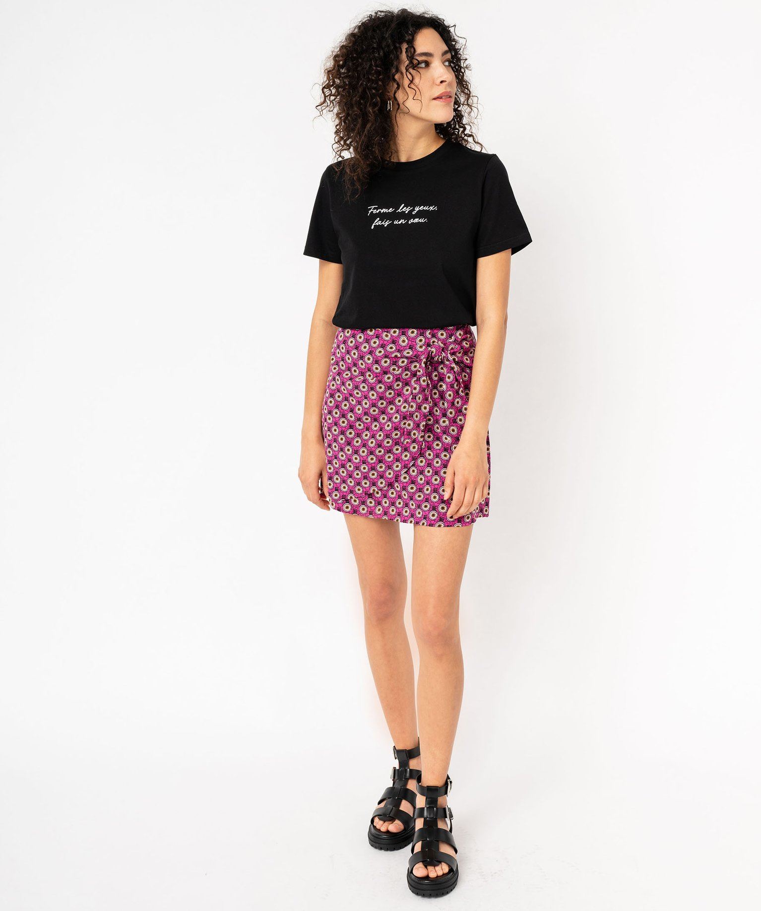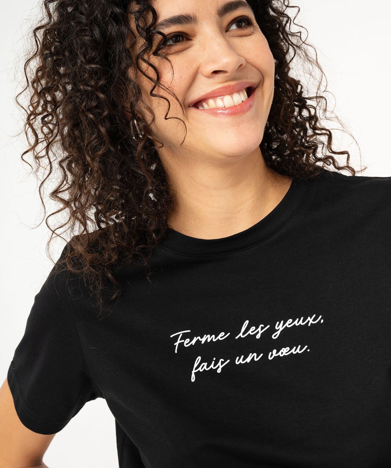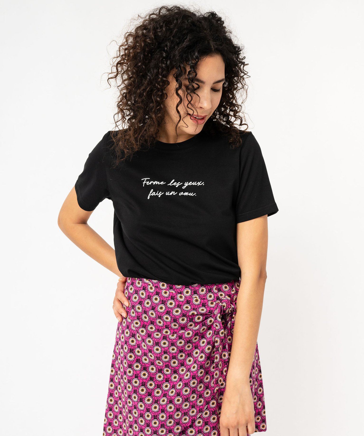 Embellissez votre vestiaire et vos tenues quotidiennes d'une pointe de fantaisie avec le tee-shirt manches courtes à message ! Orné d’une inscription sur l'avant et décliné dans divers coloris, ce tee-shirt femme s’intégrera facilement à vos looks casual. Vous apprécierez son design classique avec coupe droite et col rond en bord-côte, et sa confection coton ultra douce. Ce tee-shirt à message fait partie des indispensables et se porte seul, sous une chemise ouverte, une surchemise ou un blazer.