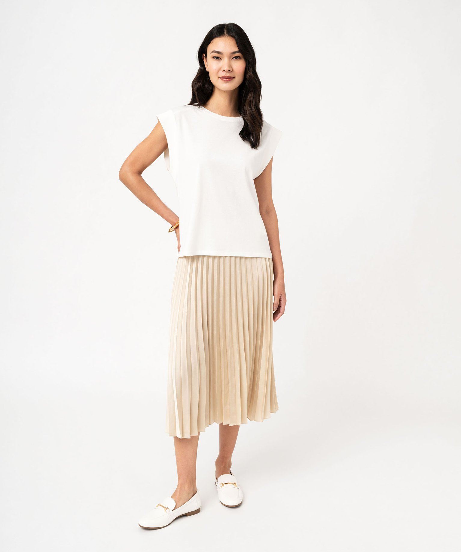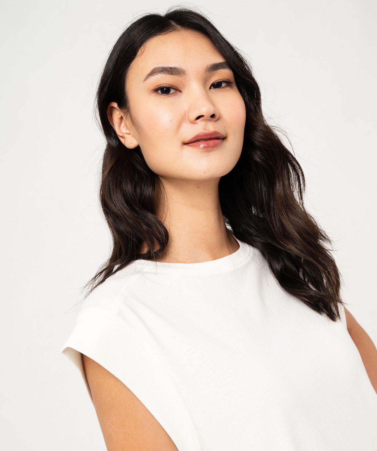 Confectionné dans une alliance de coton et de coton recyclé, ce tee-shirt sans manches affiche des finitions de qualité et offre une allure impeccable. Il possède de larges emmanchures en bord-côte et des surpiqûres sur les épaules, créant un effet « épaulettes », qui sculptent la silhouette. Ce tee-shirt femme possède un col rond et une coupe ample, qui sera mise en valeur par un pantalon slim.