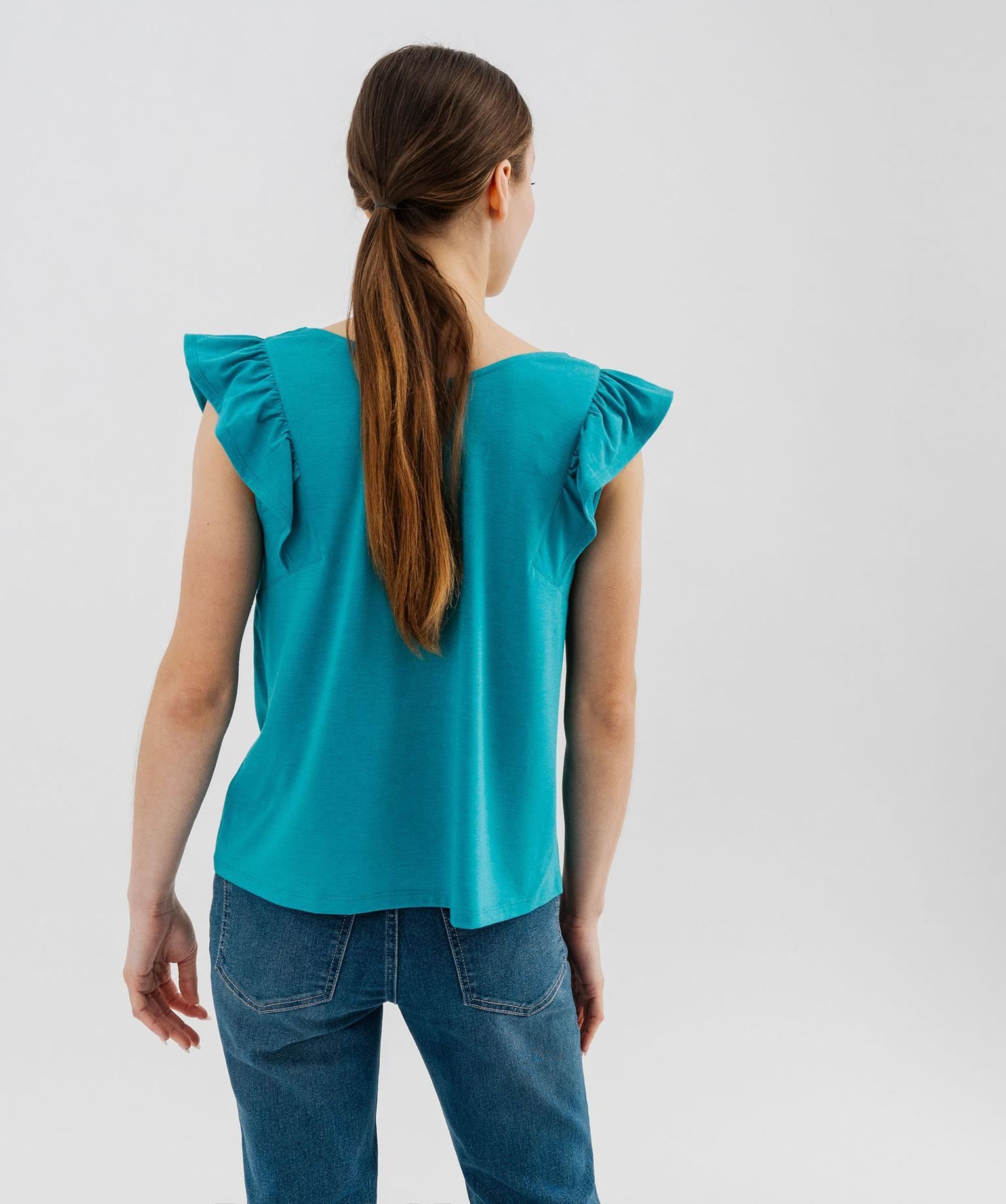 Ce tee-shirt femme pailleté apportera une touche de brillance à vos tenues estivales. Sans manches, il arbore de jolis volants aux épaules : idéal pour un top confortable et féminin à la fois. Ce tee-shirt sans manches, col V, ample et léger, se porte aussi bien avec un jean pour un look décontracté qu’avec une jupe pour une allure plus sophistiquée.